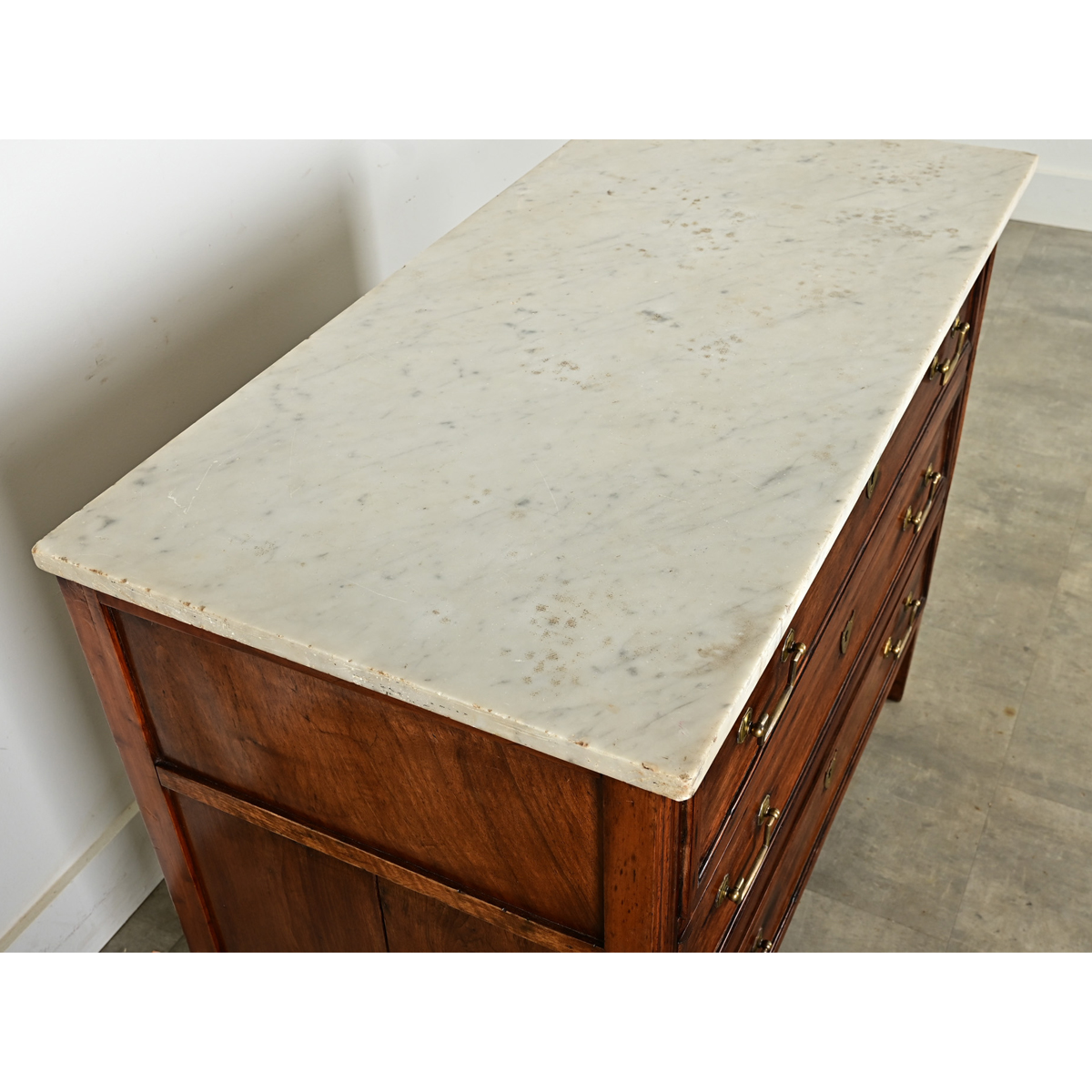 A magnificent, solid walnut commode from 19th century France, aligning with Louis XVI and transitional tastes, it is a multipurpose storage piece scaled to use practically anywhere around the home. The Saint Anne marble top exhibits the characteristic grayscale veining etched with fine scratches and flea bite chips around the perimeter–see the image gallery for more information. Modest in construction, the case of three locking drawers use brass bail pull hardware which lends functional ornamentation to the piece, complemented by small keyhole escutcheons leaving great swathes of the wood to be appreciated for the color and grain. Tapering block feet elevate the case from the floor. Cleaned, tightened, and polished with a French paste wax this antique commode is ready to join your interior. Please view the detailed images to see the current condition. One key included.