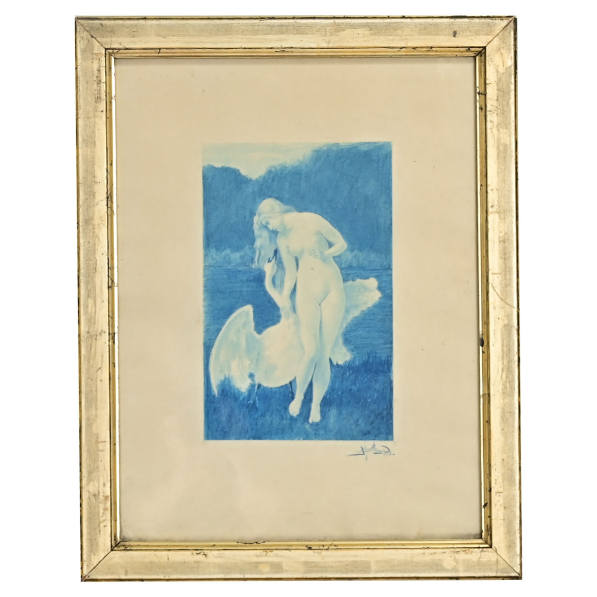 An antique pencil on paper drawing of Greek Goddess Leda being seduced by Zeus in the guise of a swan. The antique gilt frame is in wonderful antique condition and houses antique glass. Be sure to view the detailed images.