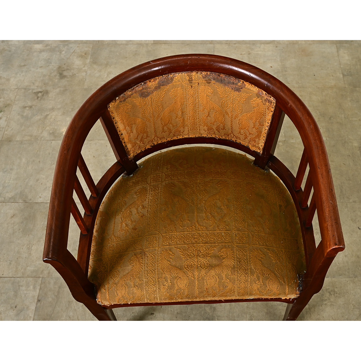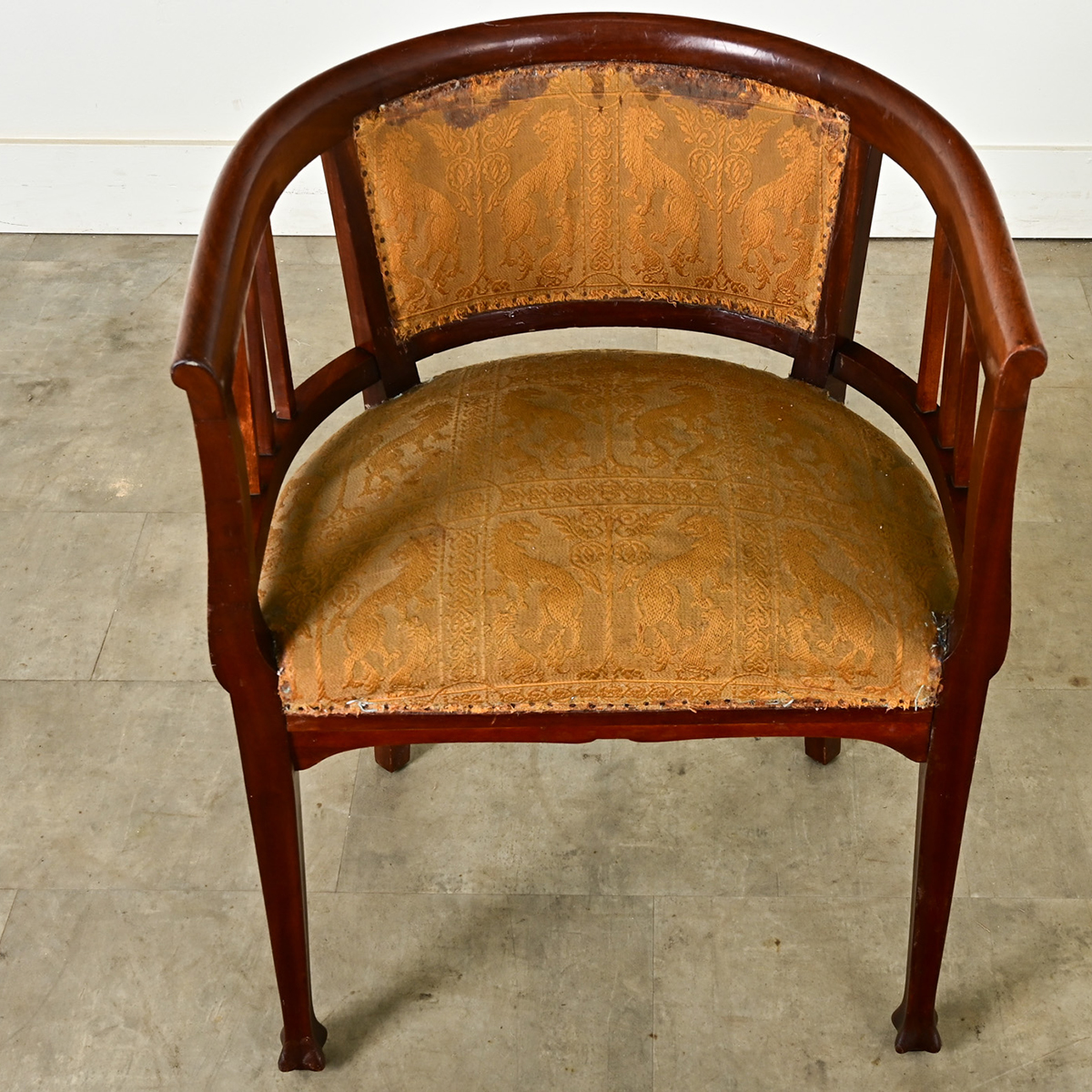 An intriguing French Art Nouveau armchair–no doubt inspired by the design language of the Vienna Secession movement in the same time period–synthesizing clean, architectural influences with elements of the natural world. This comfortable, barrel-back armchair has a rolled edge on the handrail and straight splats flanking an upholstered panel for an inside seat back, matching the damask type textile with fierce lions wrapping the seat. The square, tapering legs of the front are carved with low fluting each side, developing into a quatrefoil foot at the floor that is neither a claw nor a paw but undeniably unique. Be sure to view the detailed images to see the current condition of this unusual chair design.