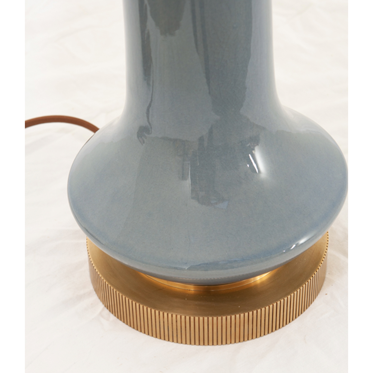 Finished in polar blue glaze, this ceramic table lamp is a unique piece for any interior. The reactive glaze can create variance in the color and texture, making each lamp one of a kind. Fit with a custom linen shade. Two lamps in stock. Available for reorder, pricing may vary.