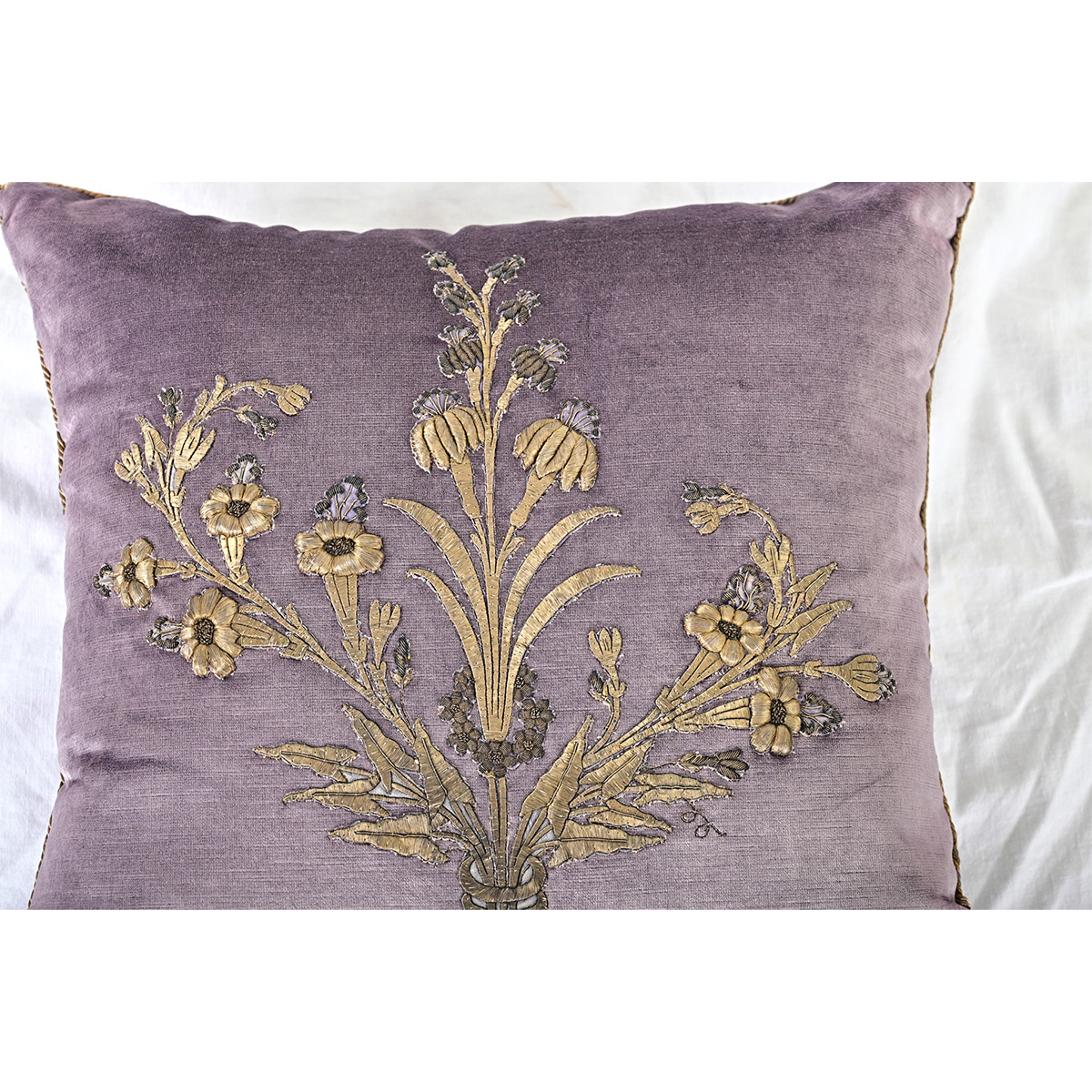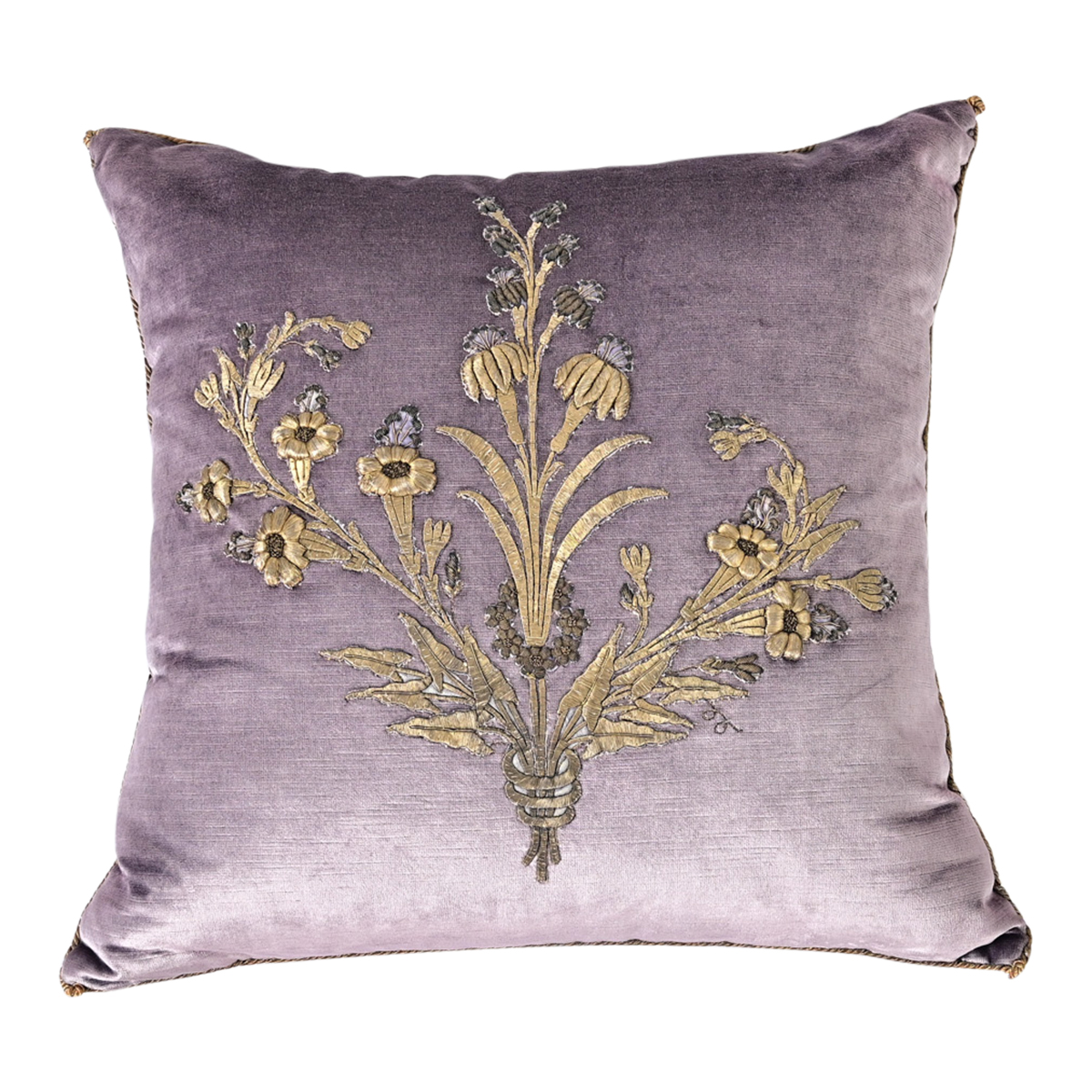 Recently made toss pillow from antique, Ottoman Empire raised silver metallic embroidery depicting a small bouquet of flowers on lavender velvet. Hand trimmed with vintage gold metallic cording, knotted in the corners. Down-filled. Please view the detailed images to see more.