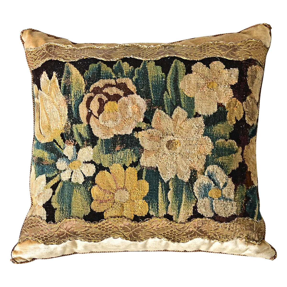 Recently made toss pillow from an antique tapestry fragment of the Verdure tradition (Flemish, 18th century) depicting a various flowers in shades of gold, green, blue, and brown that has been framed with antique gold metallic serpentine galon (or galloon) trim against “straw” velvet. Hand trimmed with vintage gold metallic cording that is knotted on the corners. Down-filled. Please view the detailed images to see more of this unique creation.
