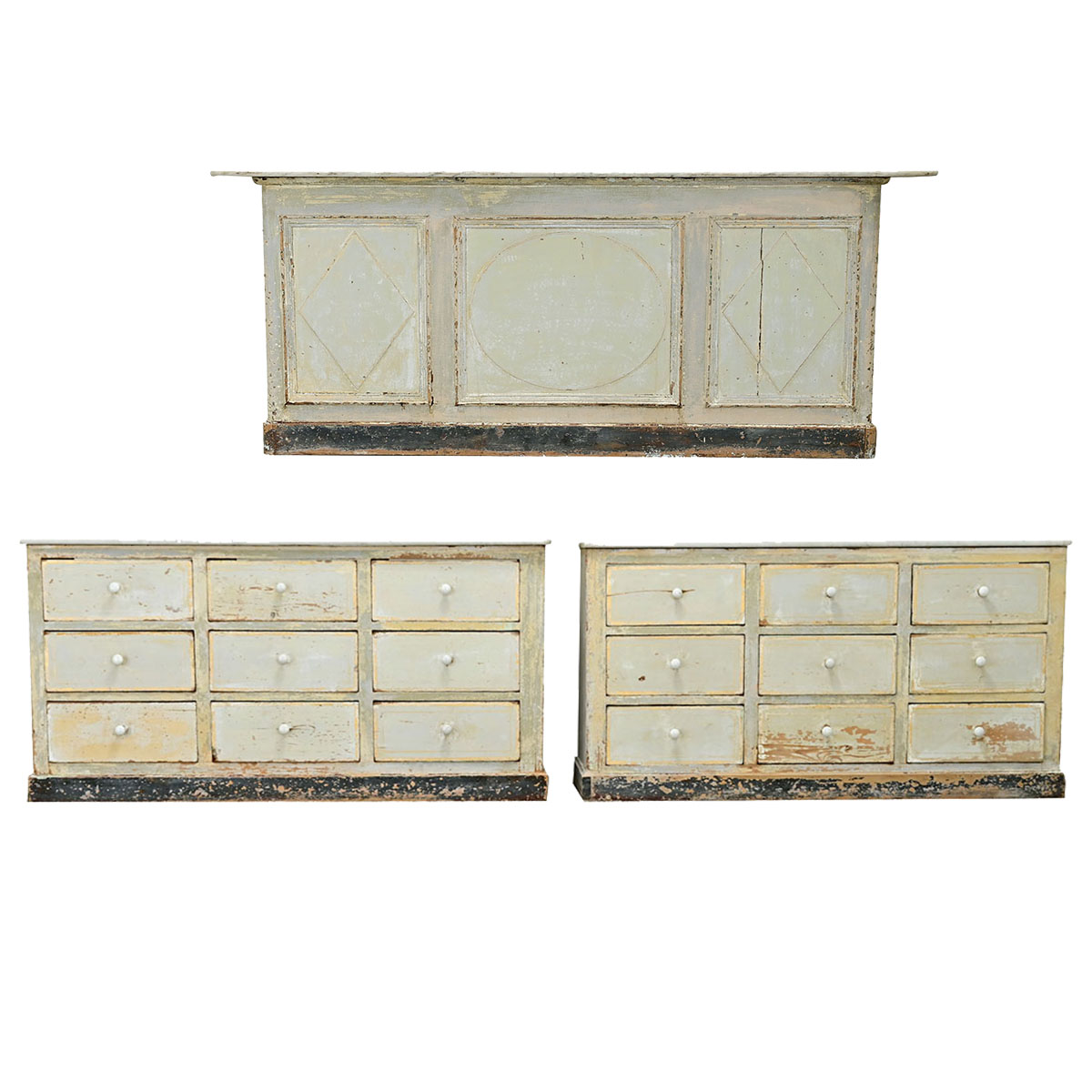 A collection of three painted counters from a 19th Century French pastry shop. This rare and outstanding group of counters would transform your everyday kitchen or retail shop with abundant storage and gorgeous pale blue color. The largest of the fixtures is paneled on three sides in geometric motifs under the original painted finish, now layered and crackled with patina. The backside is open for storage with two drawers (one with fitted sections) and a single shelf spanning the width. The original white marble top hangs over its base making a durable and large work surface. Additionally, the other two counters included in this grouping offer nine (9) drawers each and were once attached to the walls of the pastry shop, not intended to be standalone units, but could be finished on the backs to suit their new location. Both of the matching chests of drawers have the same painted finish and white marble tops for a cohesive look across the three fixtures. All three counters pair very well together, raised off the floor on plinth bases. Patina consistent with age and use, be sure to view the detailed images to see the current condition of this group of shop counters.