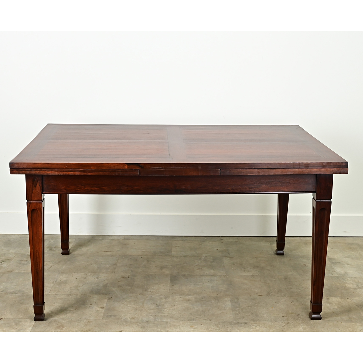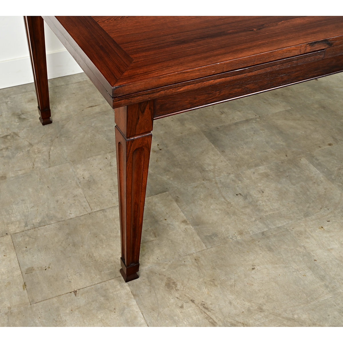 This rosewood extending dining table has self storing leaves making for a versatile dining table. This table easily seats six guests while closed and opens to seat up to ten. Cleaned and professionally refinished this table is ready for your immediate use. Be sure to view the detailed images. The table fully extended is 100” long.