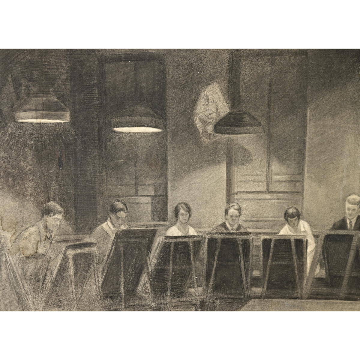 English 1920s framed charcoal figure study of a life drawing class in progress. With remarkable talent the artist has constructed a tense scene dominated by the nude male model at the front of the class (far right of the image) surrounded by students at their easels. The Art Deco time period is evident in the geometric repetition of the students, the pendant lights above, and statuesque pose of the model balanced by a tall staff to maintain his posture. By drawing some of the figures as looking out toward the viewer, and the model turned to face them, the perceived wall containing the action dissolves to raise the question of who is studying whom. Signed and dated to the lower right (unclear); framed and matted without glass. Please view the detailed images to see more.