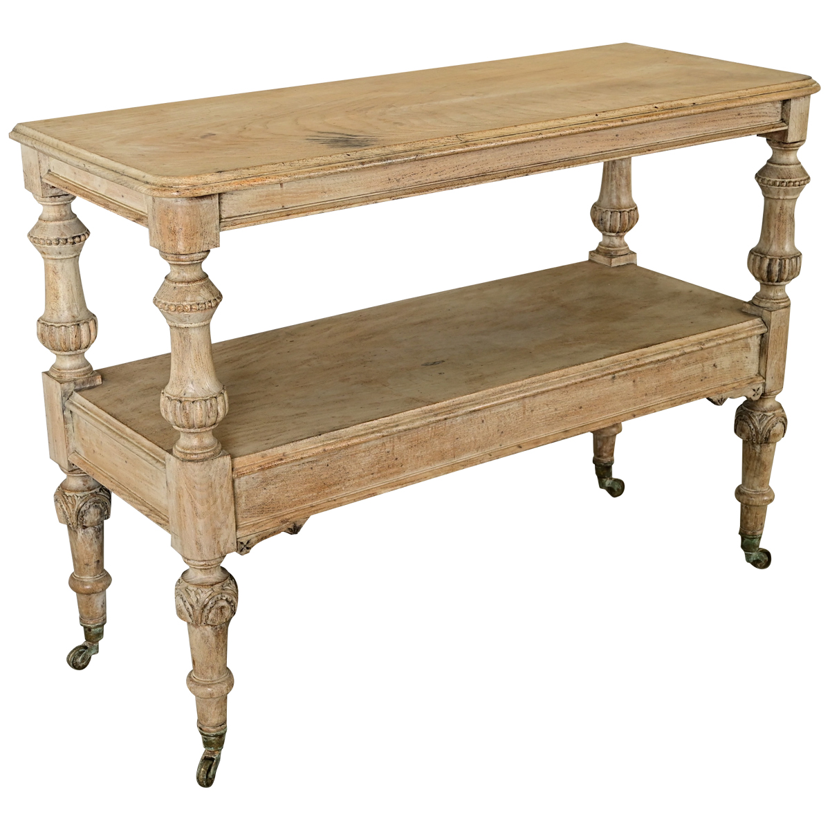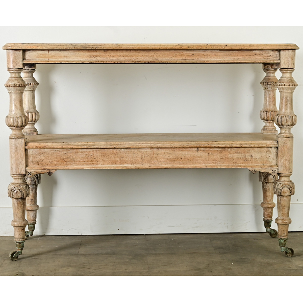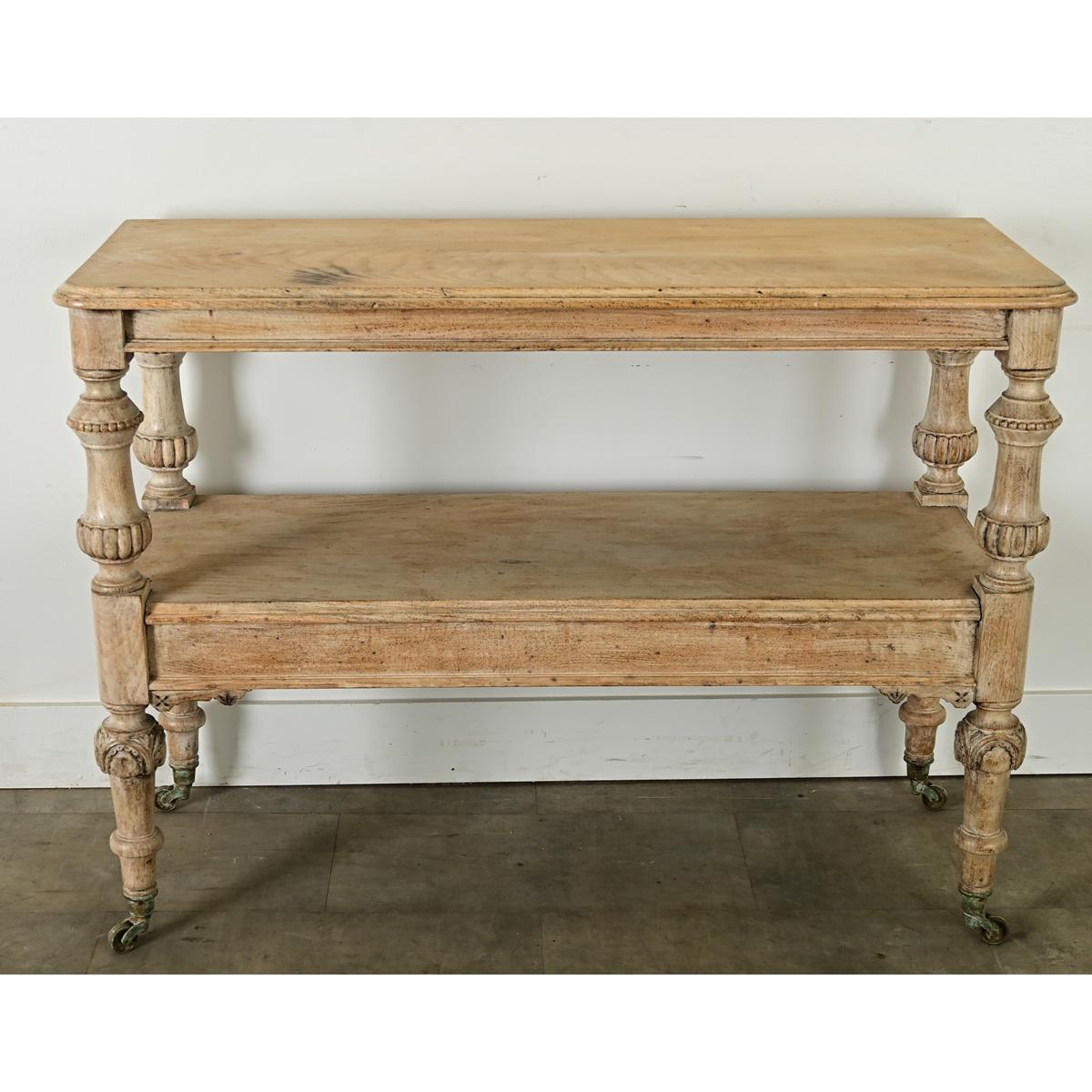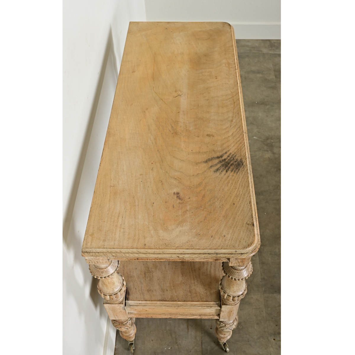 A stunning trolley, made of bleached oak, from 19th century England. This beautiful antique has a wonderfully patinated and unique finish that really distinguishes it from others. The trolley has rounded front corners and exceptional turned legs. It is raised on casters that make moving the trolley about a breeze. Be sure to view all the photos to see the antique’s current condition and carved details.