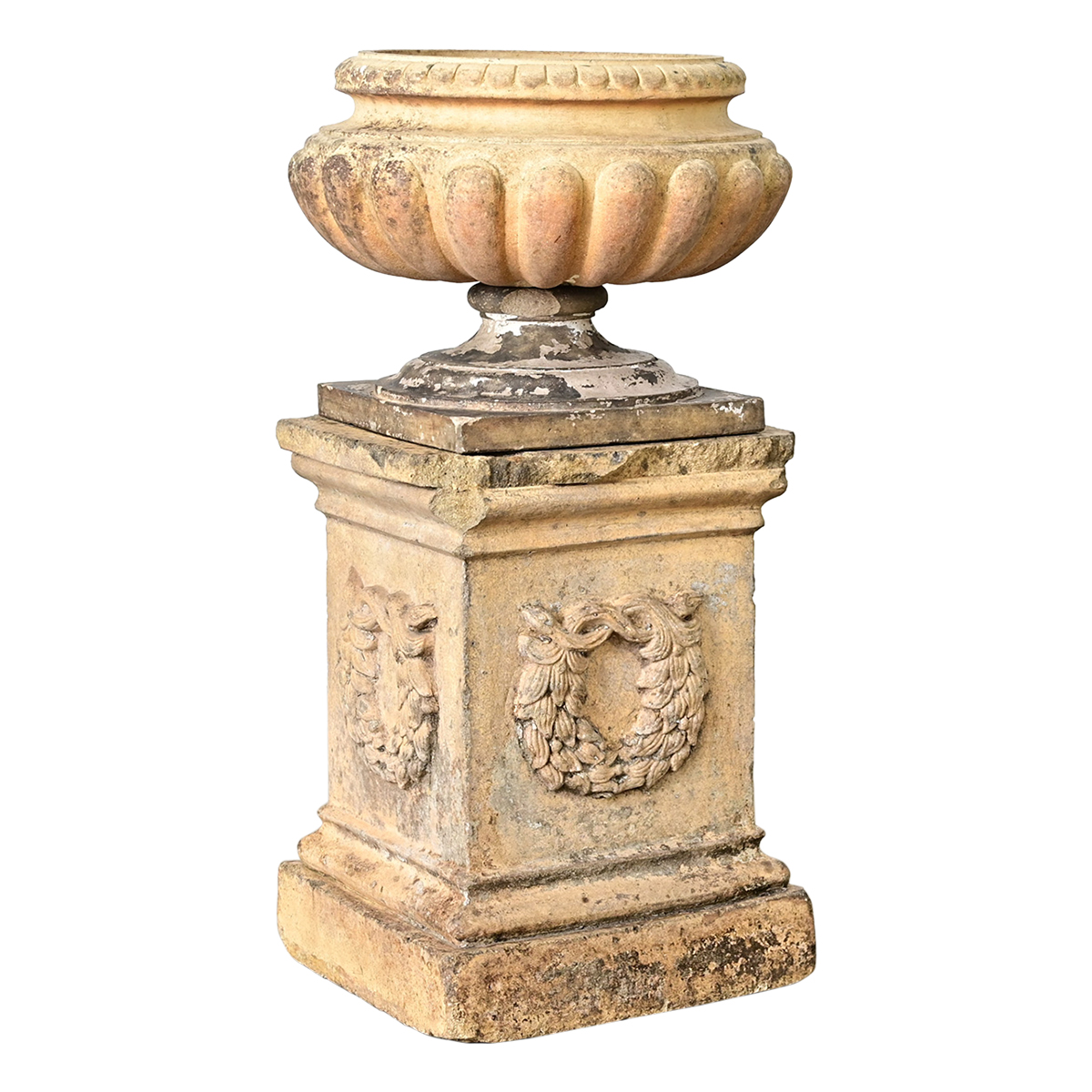 English late 19th century Neoclassical garden urn of the “campania” or “campagna” style mounted on a substantial square pedestal base. The cast, reconstituted stone has the color and texture of seasoned terracotta mixed with dark patina from a century of exposure to the elements. A low, wide bowl at the top with a pronounced gadroon motif rests on a simple pedestal for visual harmony of proportion. The square podium features a thick, wreath appliqué on each side of dense botanical imagery. Please view the detailed images to see the current condition as they are an essential part of the description. Stamped by the foundry of Doulton, Lambeth, the urn separates into three components for easier transportation and installation.