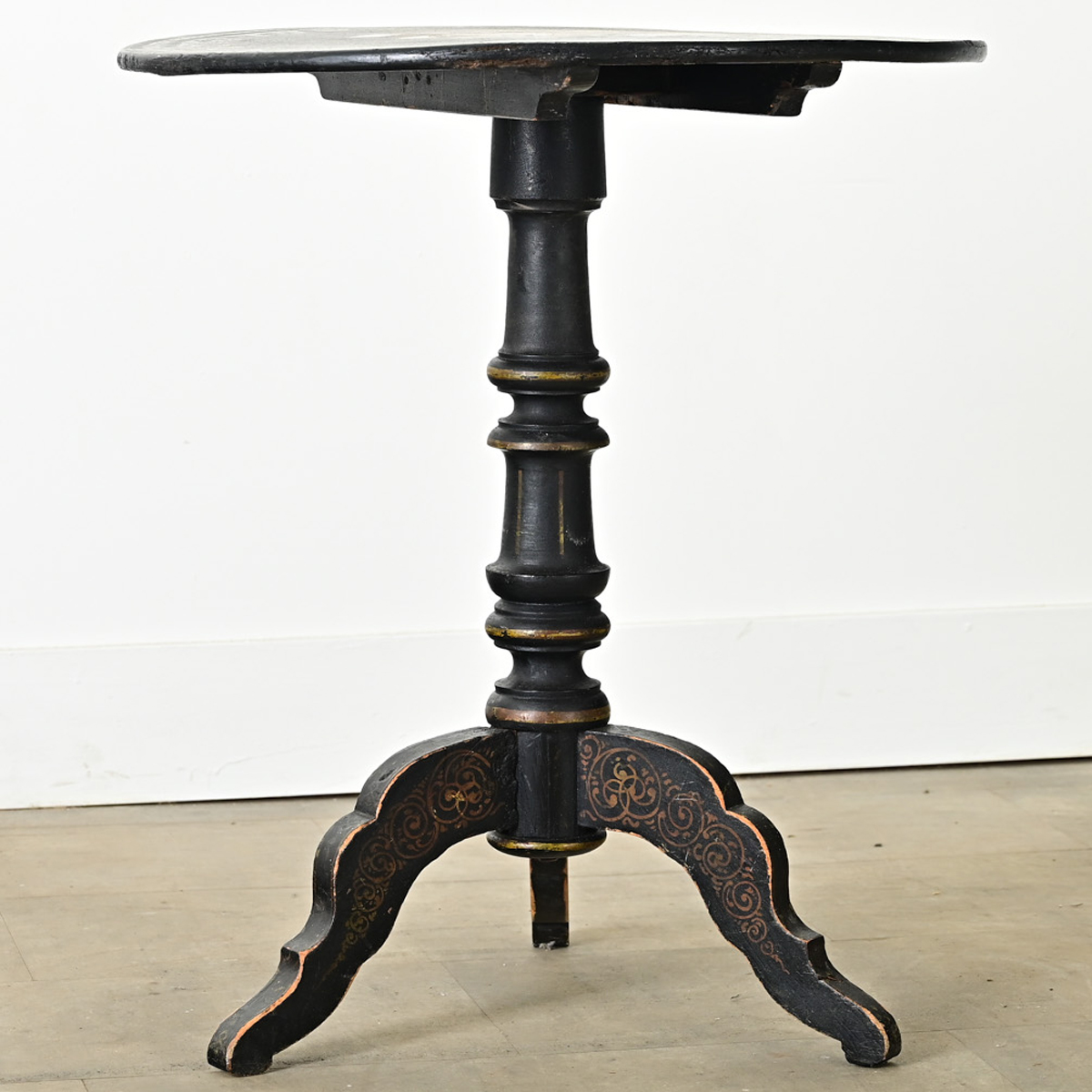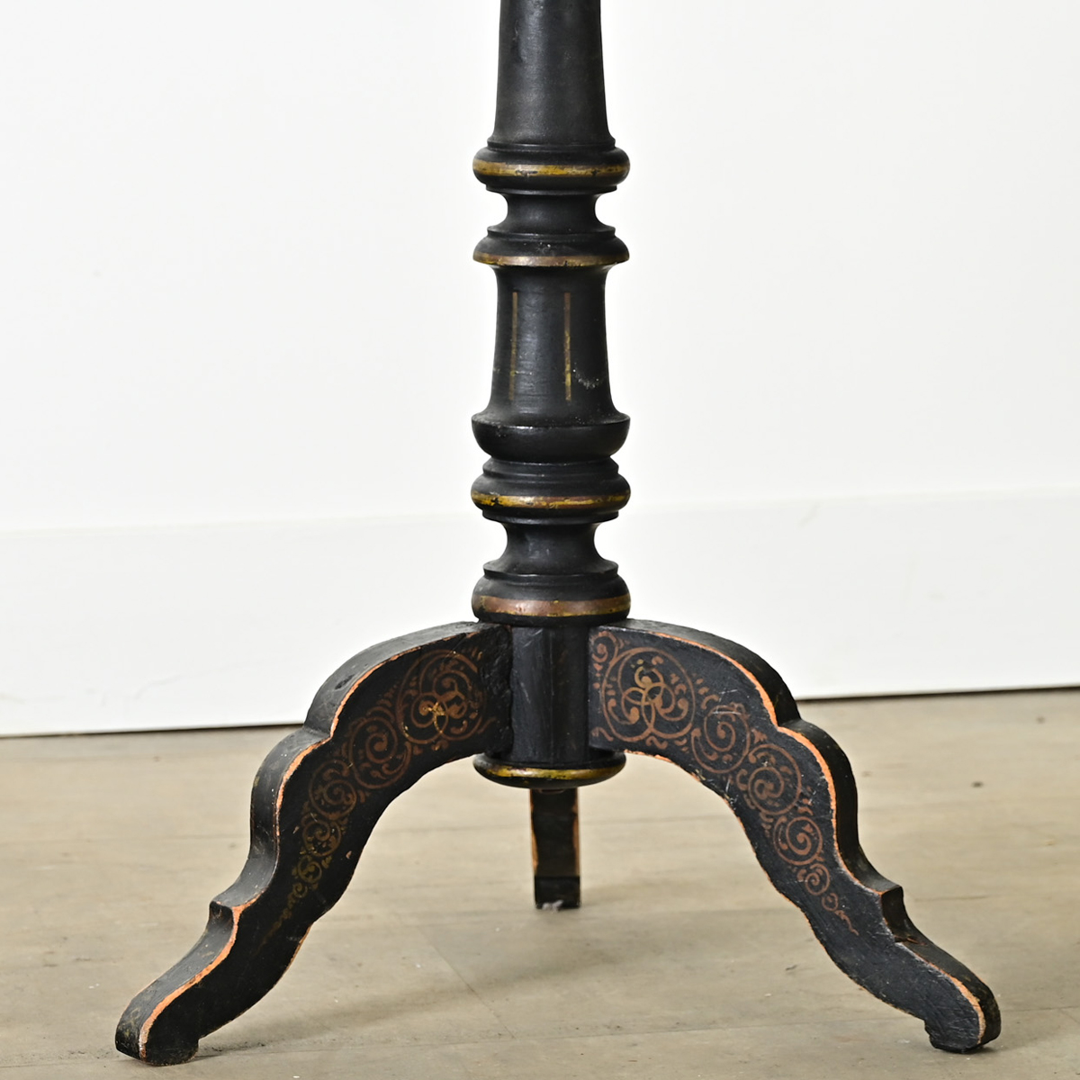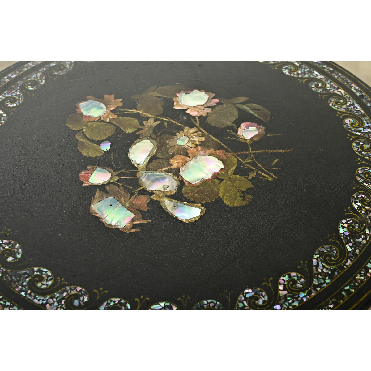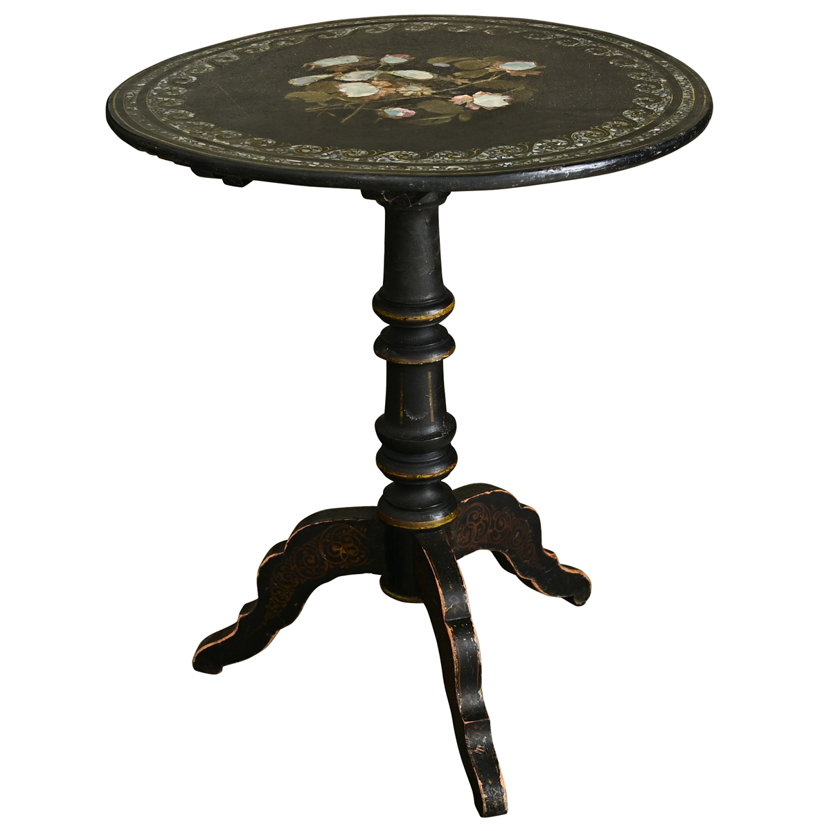 A magnificent English Victorian tea table (late 19th century) of ebonized wood and inlaid with mother-of-pearl on the surface. Deep ebonized color & texture of the wood contrasts beautifully with the kaleidoscopic inlay of mother-of-pearl tesserae arranged in cresting waves around the circumference and as larger pieces of shell accenting the handpainted floral decoration in the center. A turned wood support column is given definition by little rings of gold as it widens to a tripod base decorated with scrolling motifs. Note that the tilting mechanism has been stabilized at some point in history, meaning the table is fixed flat and no longer pivots. Please view the detailed images to see the current condition.