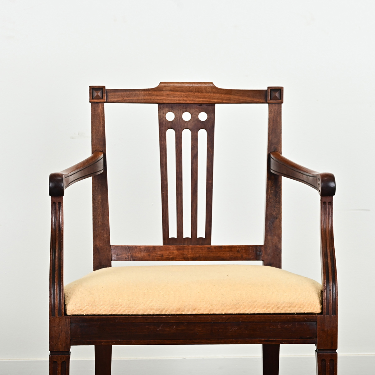 An English carved mahogany armchair from the 1800’s. This comfortable and stylish single armchair is perfect for an occasional chair or at a desk. The geometric carvings on the chair back compliment the sloping chair arms and fluted, squared off chair legs. The seat cushion is removable and current has a gently used light yellow linen fabric. Be sure to view the detailed images to see the current condition.
