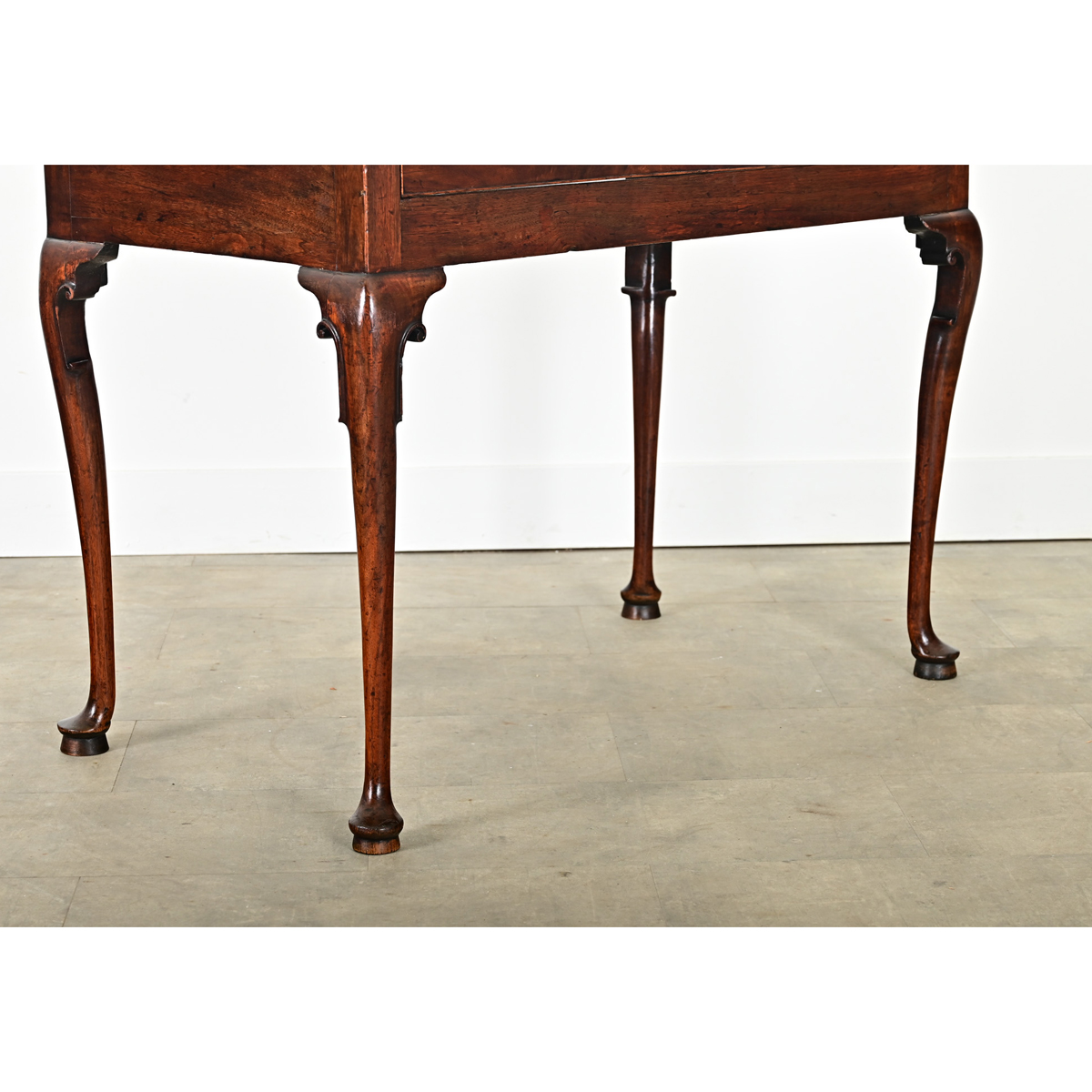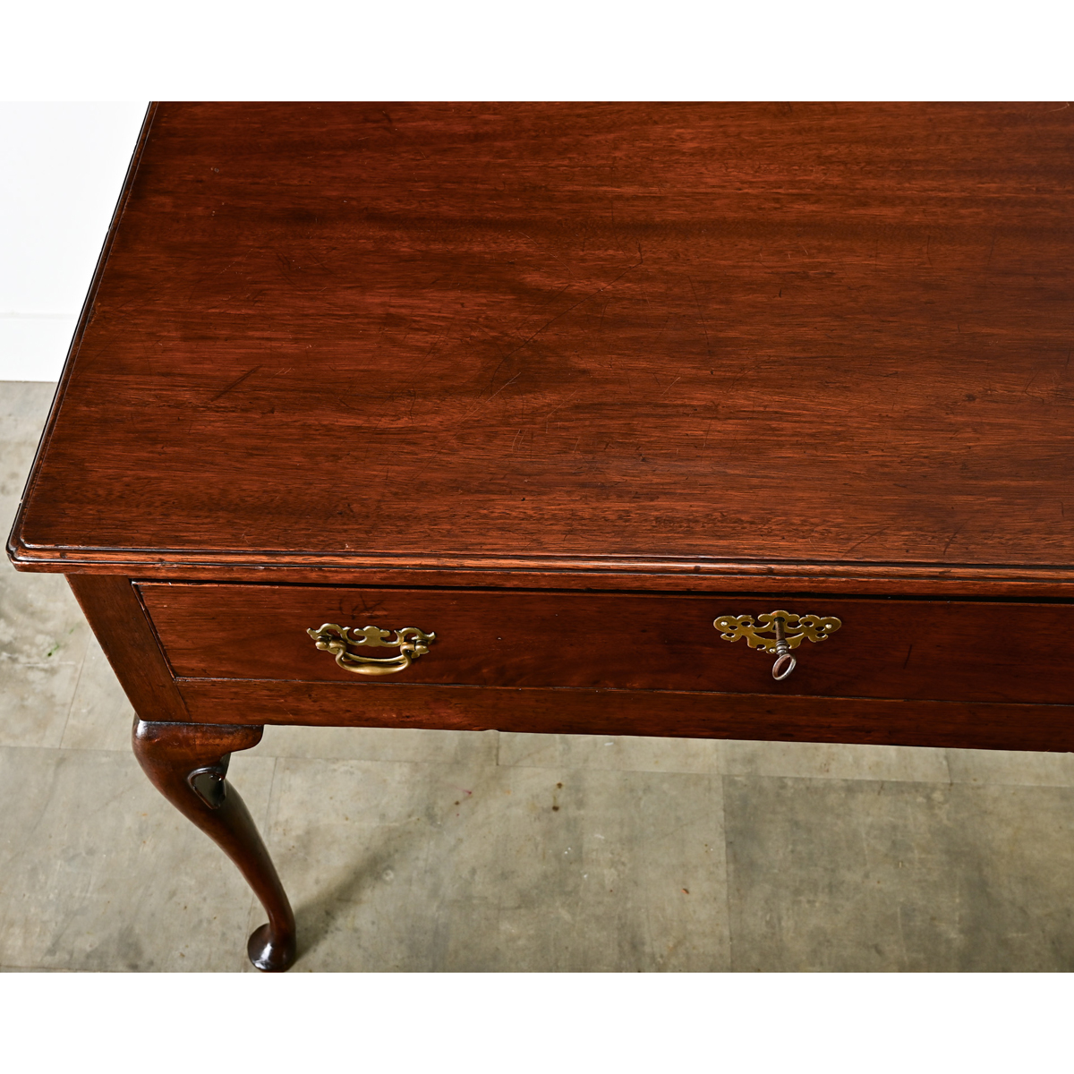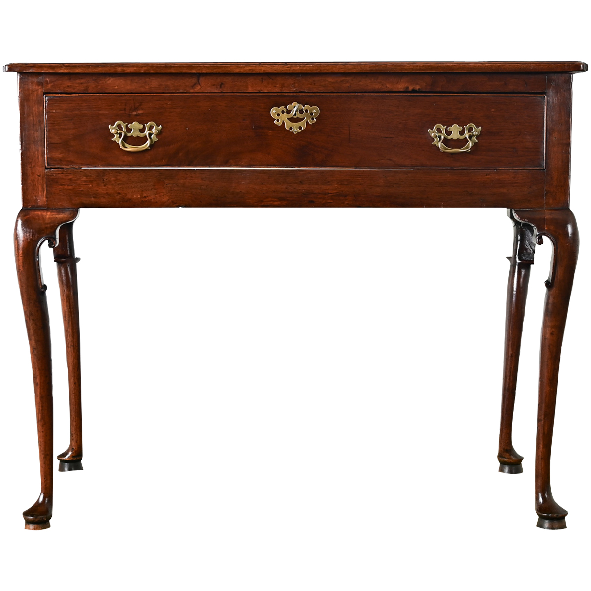 A 19th century English mahogany lowboy or sideboard with stunning color and proportions to hold timeless appeal in a range of traditional to transitional decorating tastes. The single-drawer design is made of a deep case lifted from the floor by elegant cabriole legs. What appears to be a single-plank on top is expertly matched for an expansive effect showcasing the beauty of the dark grain, notched at the corners with a subtle cleft. The drawer uses a pair of Chinoiserie style brass drop pulls with matching escutcheon over the working lock; one key included. The table is supported by elegant cabriole legs, each terminating in pad feet, with Chippendale expression found in the scrolled flanges on the back of the knee of each leg to showcase the craftsmanship of the period. Versatile in placement, this antique side table serves effortlessly in a variety of settings–bringing depth and authenticity to a home–blending with both period and modern furnishings. View the detailed images.