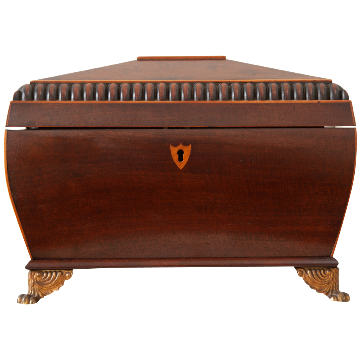 An extraordinary 19th century English solid mahogany tea caddy. This shaped box has a carved, angular top outlined with satinwood for subtle contrast, opening to a fitted interior. Inside are two removable boxes with sliding tops once used for storing loose leaf teas, shaped to echo the geometric dome of the outer case. The well in the center retains its original, cut crystal blending bowl that might easily double as flower vase. Note the gorgeous inlaid satinwood shield escutcheon on the front, however no key is present. The whole is raised on decorative bronze feet which are slightly different between the front and back; the back two have been repaired at some point in time. Be sure to view the detailed images to see more of this tea caddy and the current condition.
