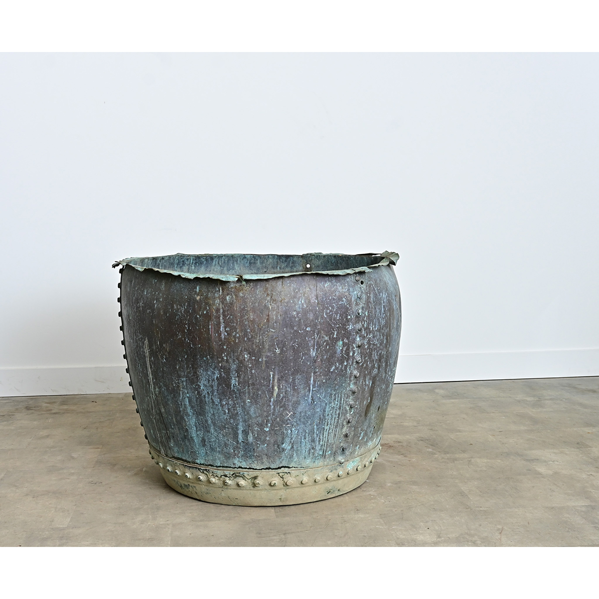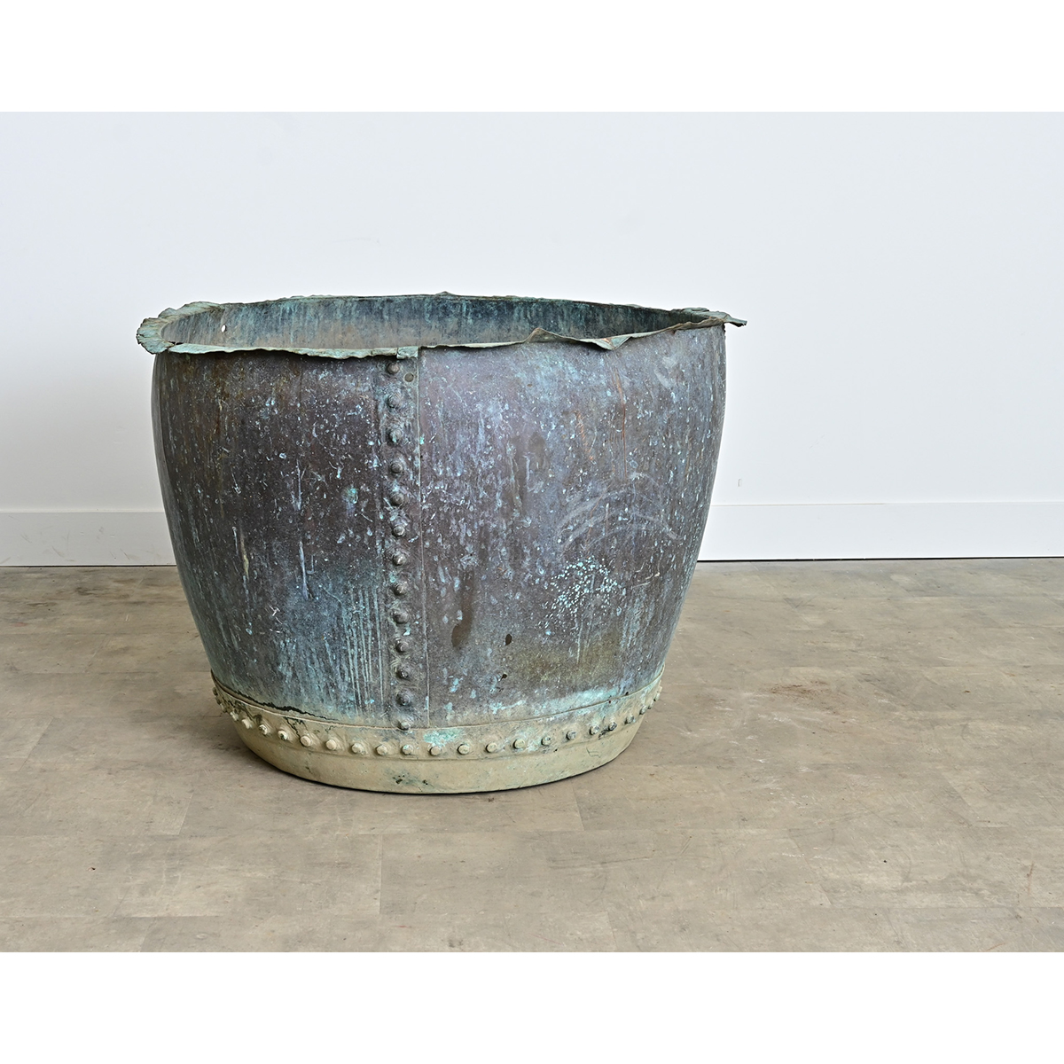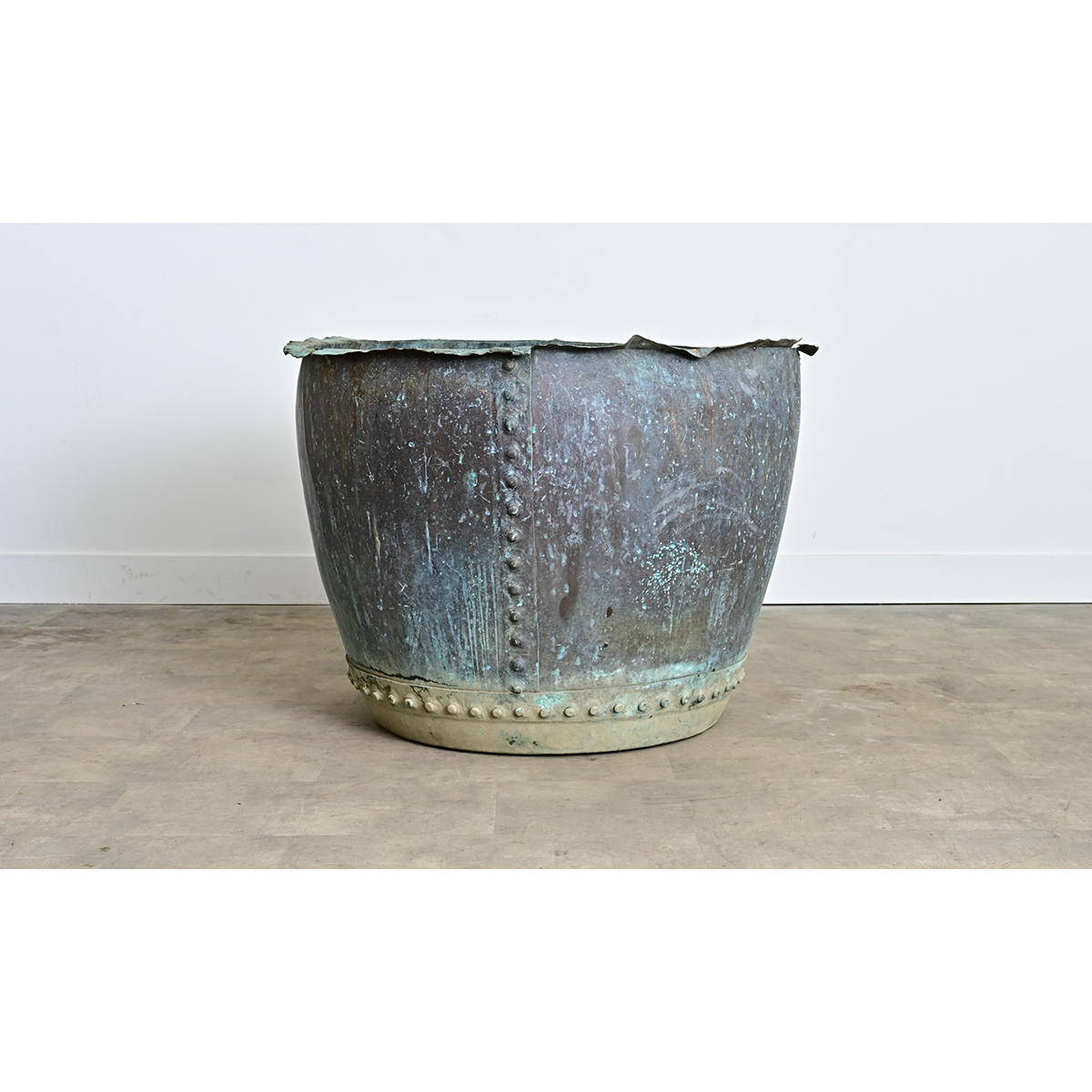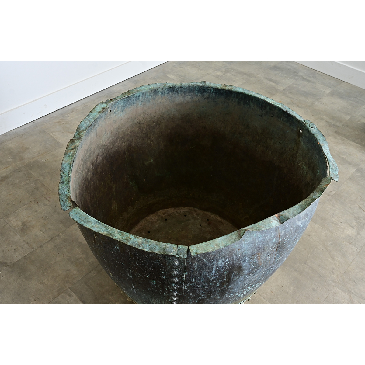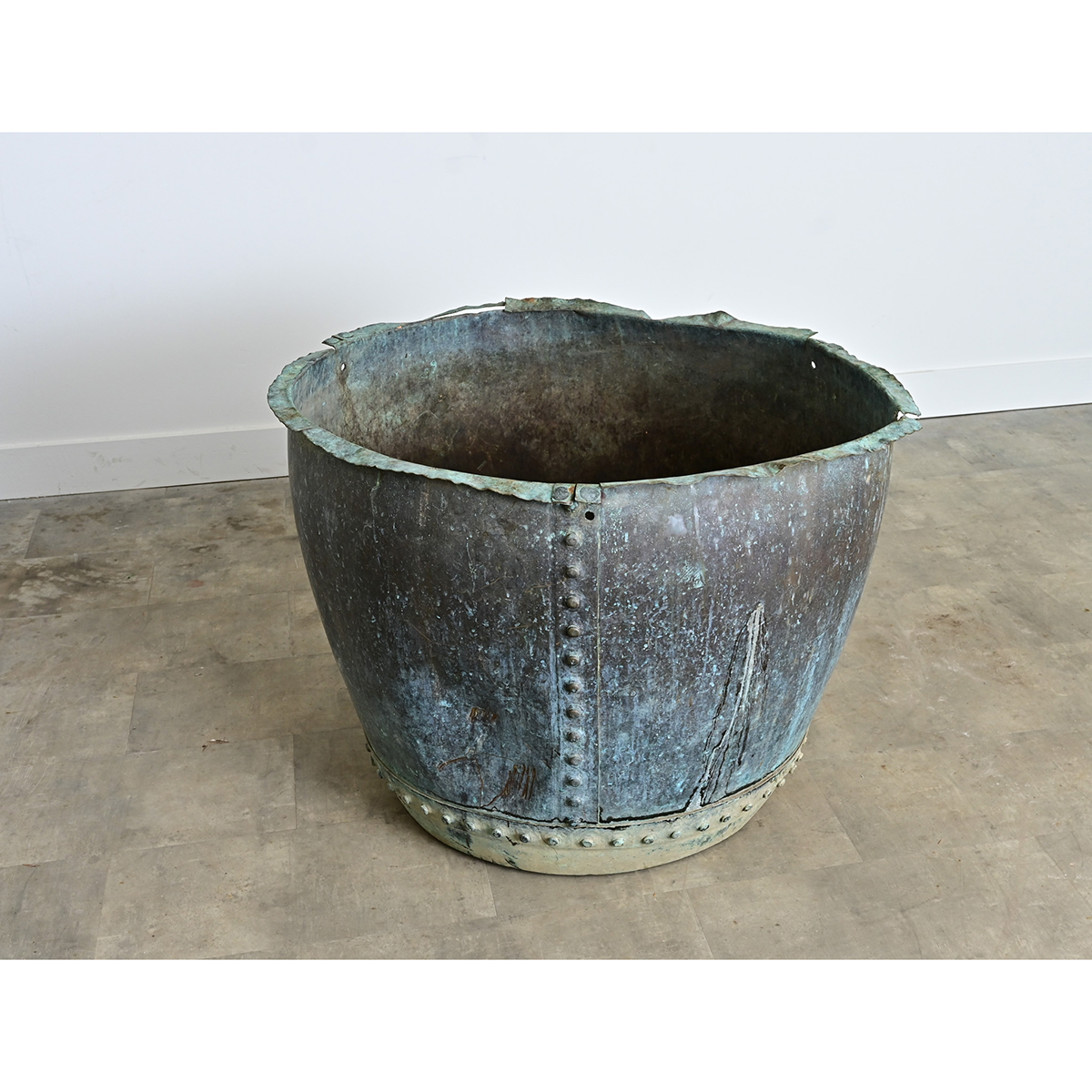 An enormous copper cauldron from England, mid to late 19th century, the metal plates riveted together and now oxidized to beautiful turquoise verdigris patina splashing the dark metal with painterly color. Likely used as a drum for washing clothing and bed linens, the industrial period is evident in the construction methods such as the folded edge at the top and studded joinery where the sheets overlap. Today, the pot could be installed as a planter in the garden or patio as there are drainage holes pierced in the base, or placed near a fireplace for a unique log holder–its aged finish will only improve with time. Please view the detailed images as they are an essential part of the description.