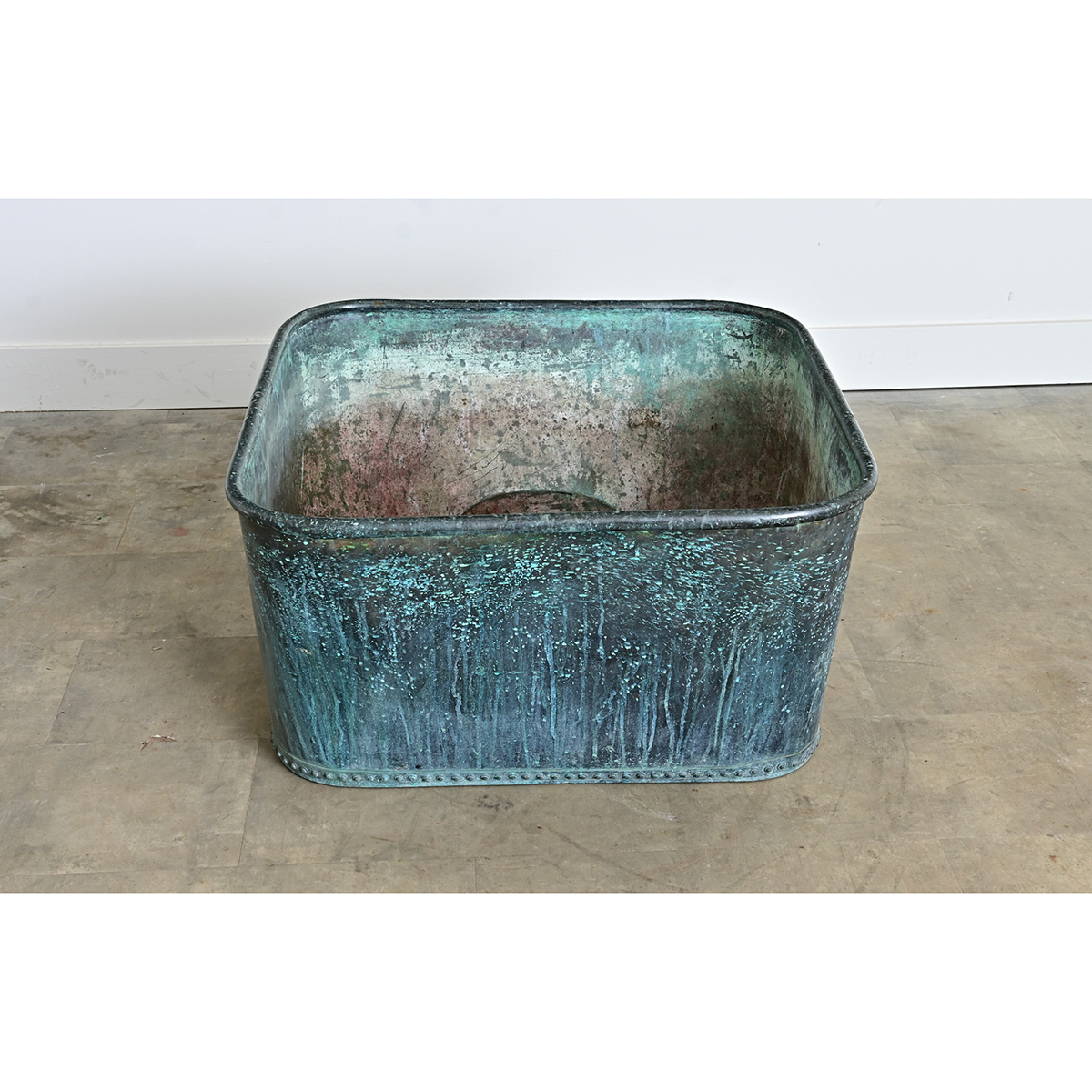 An enormous square water tank from England, mid to late 19th century, made of copper sheets riveted together now oxidized to a beautiful turquoise verdigris patina splashing the dark metal with painterly color. The front of the vessel has an arched depression toward the base, fitted with a pierced screen or filter to release water, which is perfect for using the tub as a planter in the garden and patio–its aged finish will only improve with time. Please view the detailed images as they are an essential part of the description.