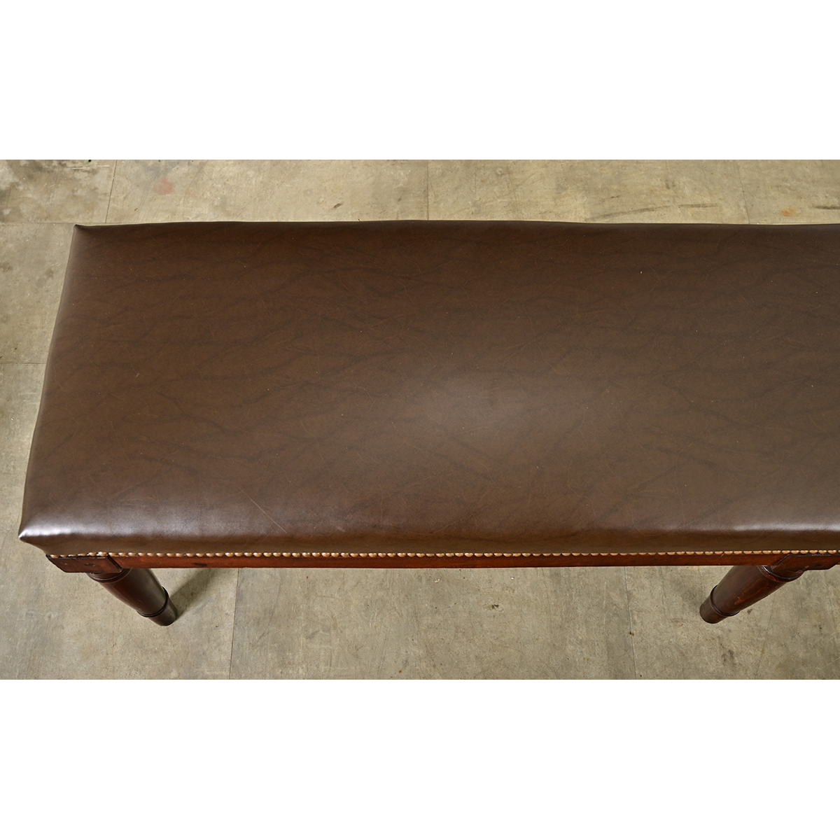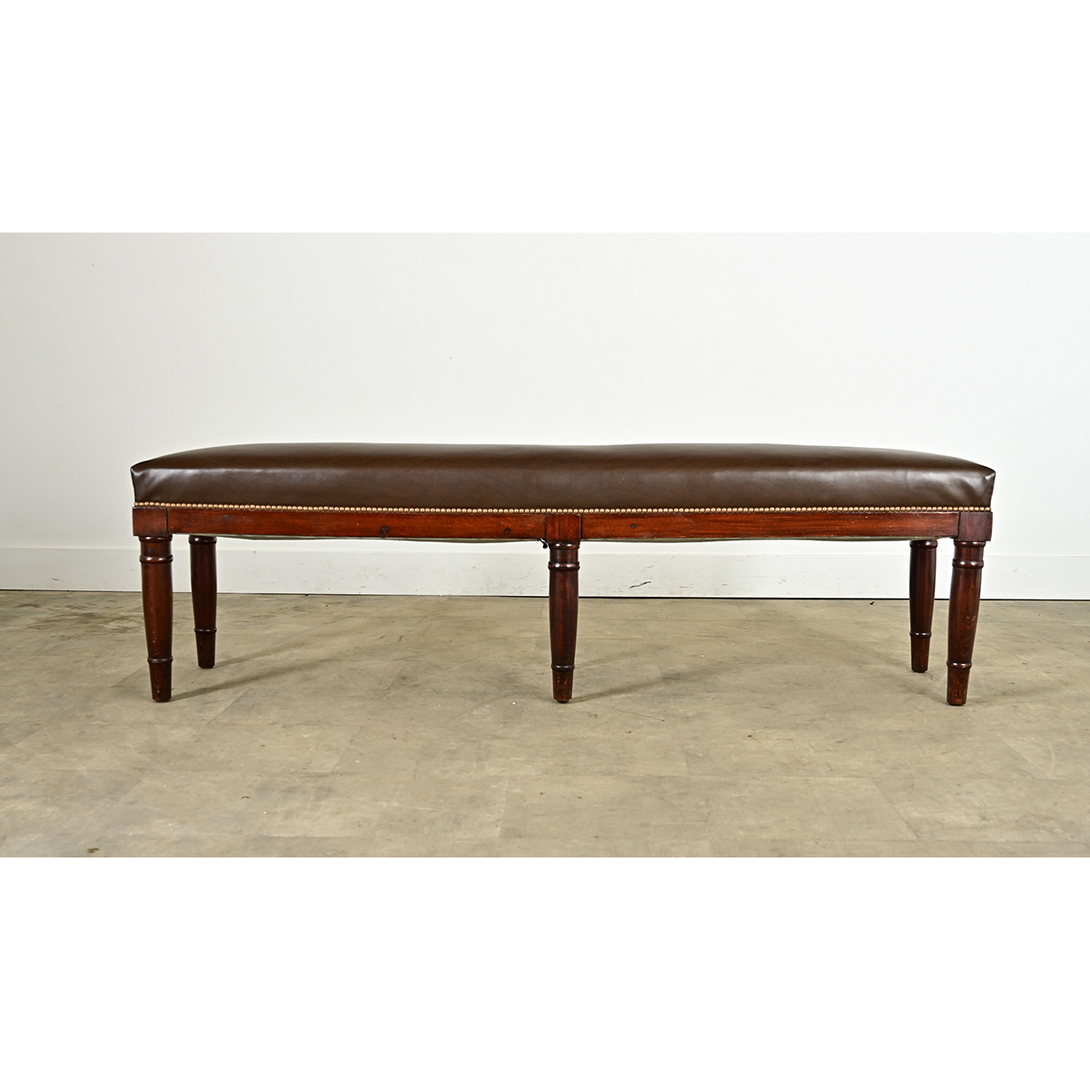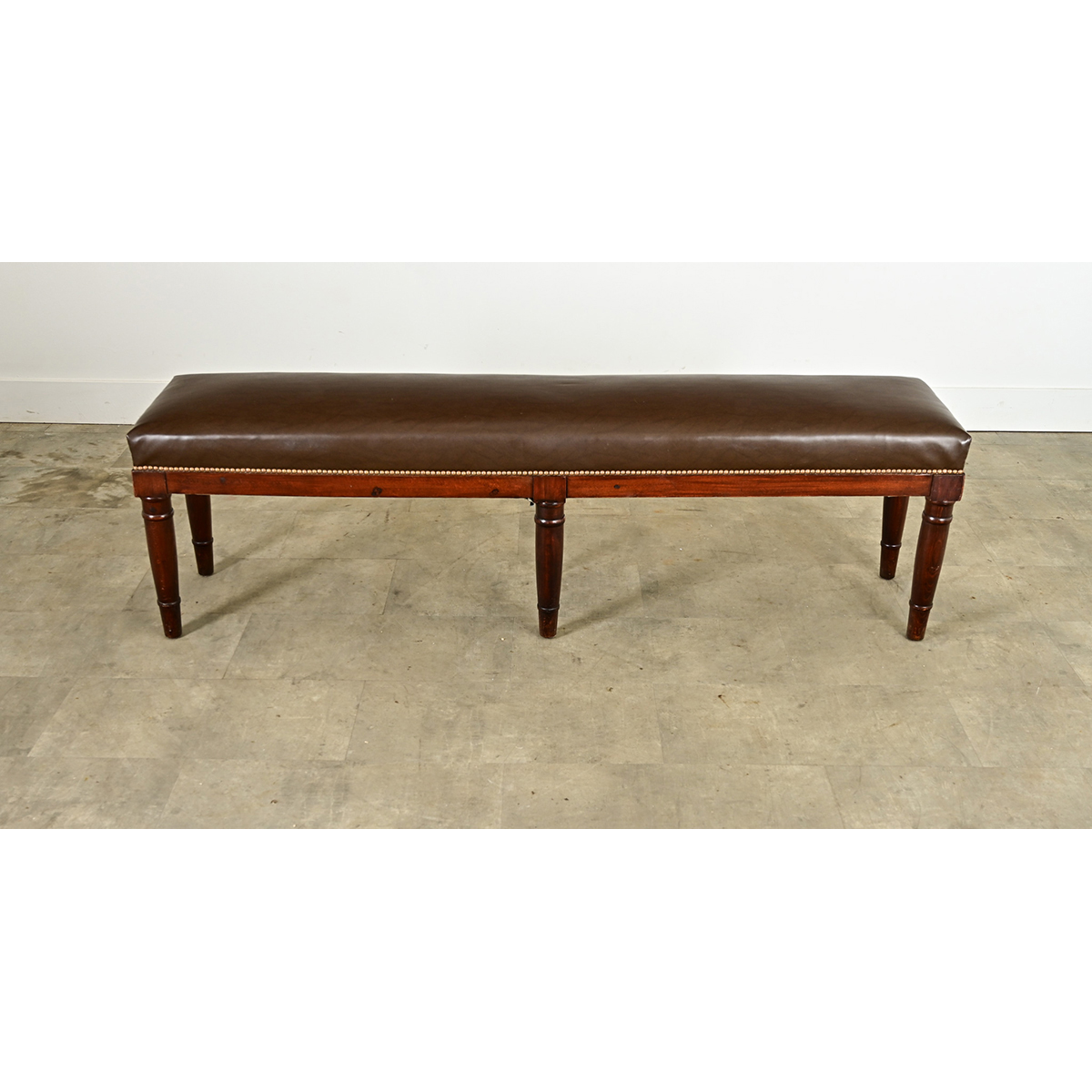 A French oak rectangular bench from the late 19th century with turned legs and more recent upholstery of practical, faux leather. The robust proportions of this multipurpose seat uses the timeless charm of oak and the technical sophistication of turned legs (without the need for stretchers) to keep the design elevated and refined to suit a number of interior decorating tastes. The dedication to craftsmanship becomes a tactile and visual experience as one observes the geometry of the legs, delighting with each curve as the French furniture tradition is known for. Upholstery in a caramel-hue faux leather accented by a nailhead trim is cohesive with the style, offering the peace of mind and easy maintenance to enjoy this bench in nearly any scenario: hallways, dining and living rooms, offices, or bedrooms. Cleaned, tightened, and polished with a French paste wax this substantial bench is ready to join your interior. Please view the detailed images to see the current condition.