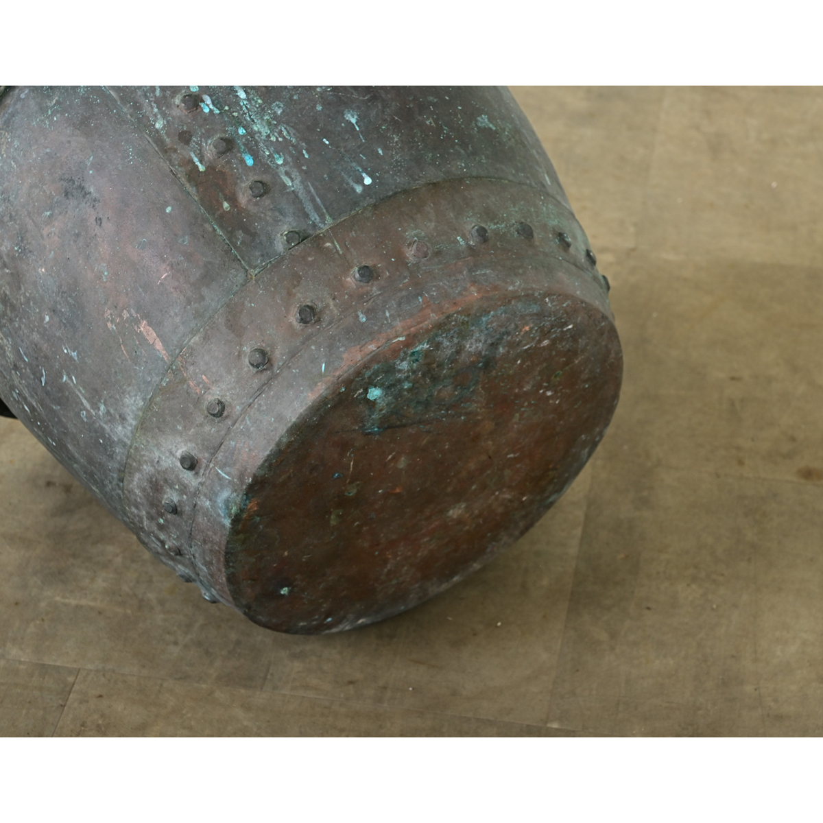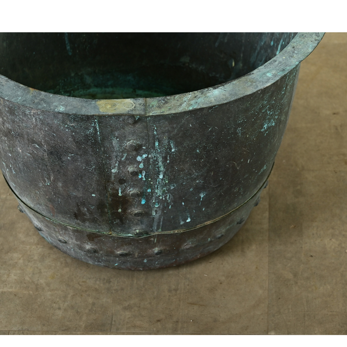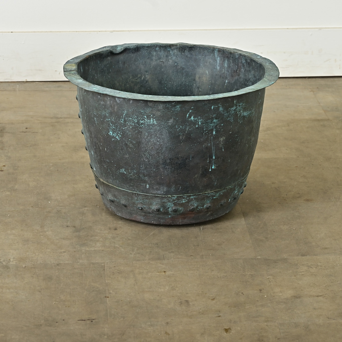 A massive antique English copper pot, with wide lip around the edge, from circa 1880. The exterior has oxidized and developed a beautiful verdigris patina of soft turquoise. The riveted construction would have been necessary at the time and now lends a decorative detail. Many potential uses around the home, such as by a fireplace as a stylish place to store firewood, a planter, or reading material by the sofa. Its aged finish will only improve with time. Please view the detailed images.