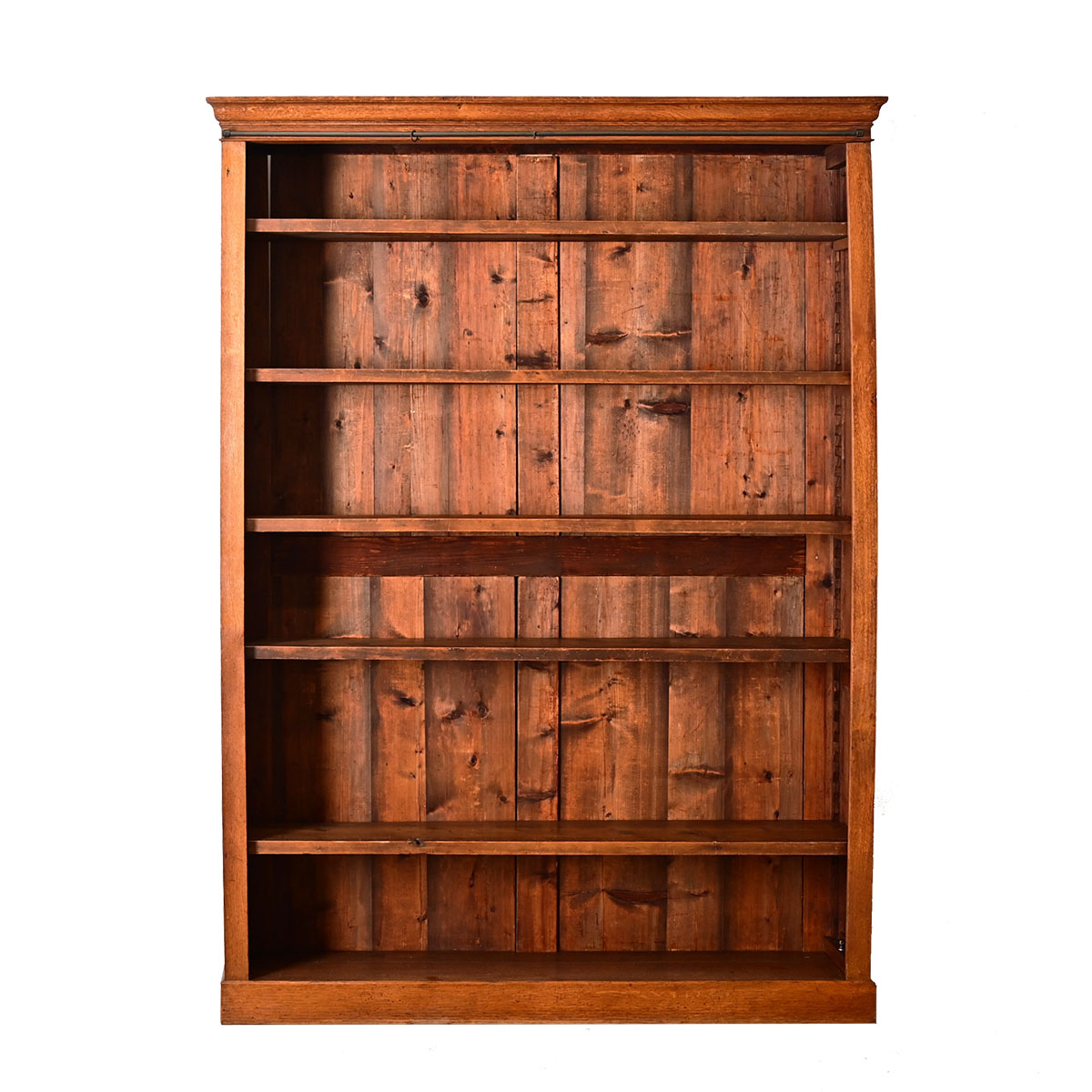 A simple, yet versatile pine bookcase from 19th century England, that will be the perfect backdrop to display treasured collections & collectibles as well as books. Five shelves, 10 ½” deep, can be easily adjusted on sawtooth brackets to suit one’s needs. Stretching across the crown is a metal curtain rod; an unexpected opportunity for personalization with your own fabric choice whether the intent is to add visual interest or protection from dust. The bookcase has been cleaned and polished with a French paste wax to preserve the stunning color, please view the detailed images to see the current condition. Note that the bookcase is stable however the vertical plank on the right is slightly bowed (view the image gallery).