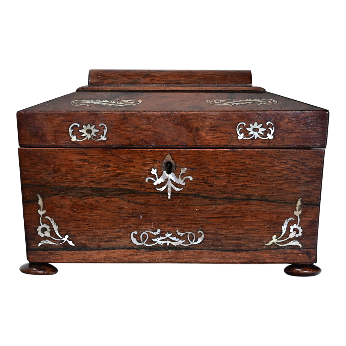 An extraordinary English Regency tea caddy from the 19th century made of rosewood and inlaid with gorgeous scrolling mother-of-pearl foliate and floral motifs. This angular shaped box has a domed top rising over the sloped sides whose exotic grain patterning is complemented by the stylized inlay of wispy botanicals in luminous pearl. Inside are two lidded boxes once used for storing loose leaf teas which have retained much of the original tin lining. There is a keyhole on the front, however no key is present. Please view the detailed images as they are an essential part of the description.