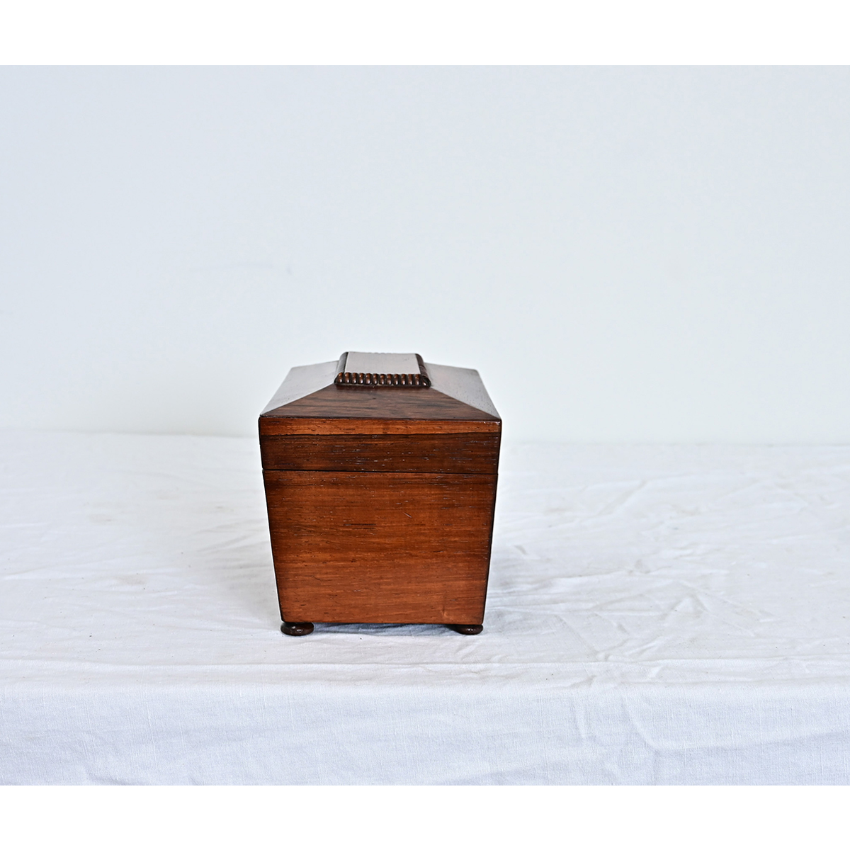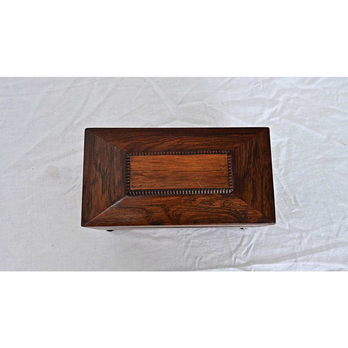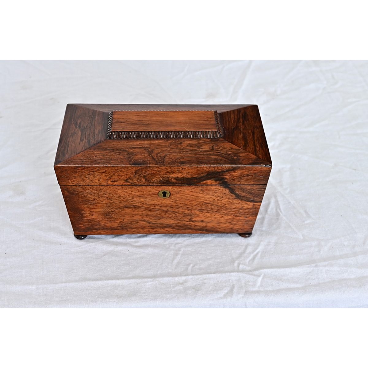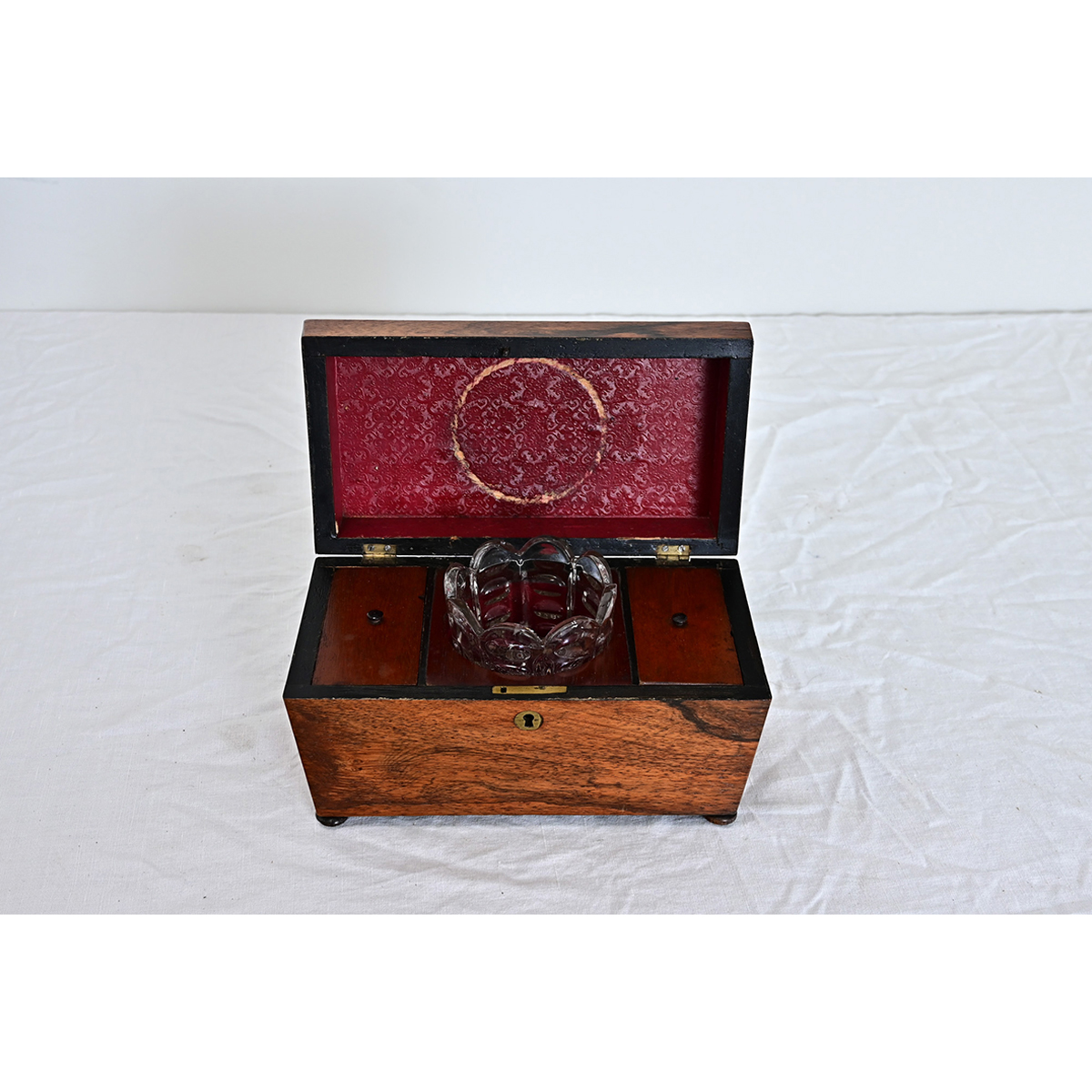 An extraordinary English Regency tea caddy from the 19th century made of rosewood, exhibiting the gorgeous color and grain the wood is prized for. This angular shaped box has a sloped lid matched on each side to continue the delicate grain patterns, with a flat upper panel outlined in fluted carvings. The inside of the domed lid is wrapped in an embossed paper like red damask alluding to the silk which would have been found along the tea and spice routes. Inside are two lidded boxes once used for storing loose leaf teas which have retained much of the original tin lining. In the center is a pressed glass blending bowl faceted like cut crystal–truly elevating the tea drinking experience. The escutcheon is intact on the front, however no key is present. Please view the detailed images as they are an essential part of the description.