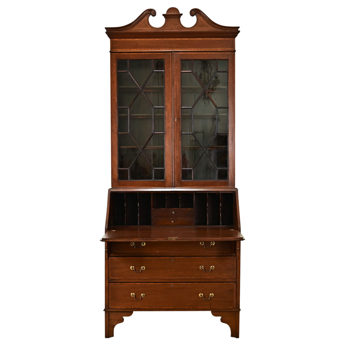 A slender mahogany bureau bookcase with secretary desk, made in England, circa 1820. The secretary’s upper body is crowned with a broken pediment–a classic Sheraton feature–above glass front doors that appear to be all original panes, assembled in a gorgeous fretwork pattern, secured by a working lock and key. Inside are three shelves at 7” deep that are easily adjustable on sawtooth brackets. A conch shell design rendered in marquetry decorates the flap door for the desk, locked & unlocked with the same key as the vitrine. Two hidden rails extending from the bureau support the desktop when in use. The interior of the workspace offers multiple storage compartments: slots for sorting correspondence and mail, with two small pen drawers at center. The lower body offers three drawers that easily glide open & shut, using simple brass drop pulls to operate; the same key as before locks the top and middle drawer however the bottom drawer will not turn. Cleaned, tightened, polished with a French paste wax – ready for your interior. Please view the detailed images.