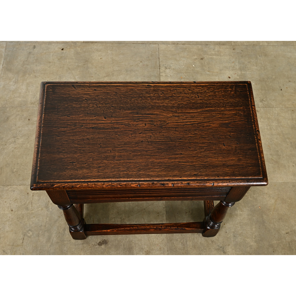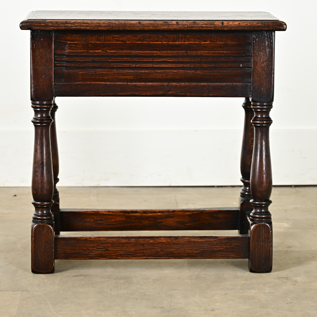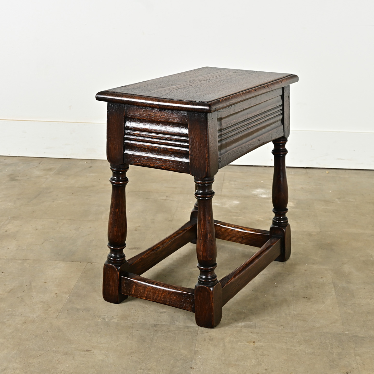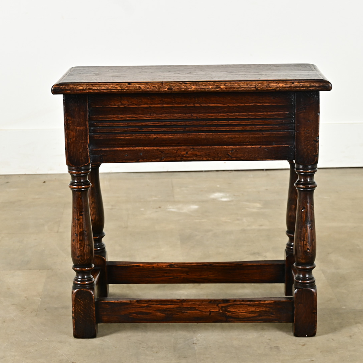 An English solid oak joint stool from the 1800’s. Joint stools were often made by apprentices as a test to their skill level. Simple in design, the rectangular top rests over a hand carved apron and four turned legs with a stretcher for additional support. Cleaned and polished with a paste wax, this stool is ready for your immediate use. View the detailed images.