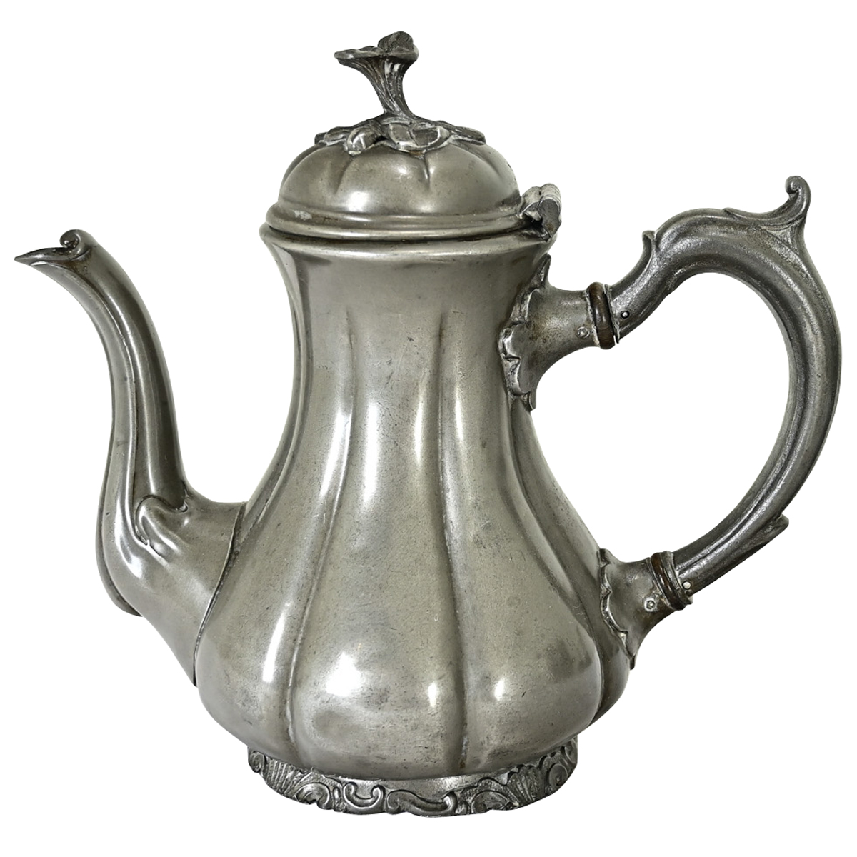A very unique English pewter teapot from the Victorian era with delicate floral ornamentation on the gourd-shaped vessel. The lid of the pot is crowned with a tiny, naturalistic flower with similar, organic-inspired motifs wrapping the handle, spout, and the base of dense rocaille. An exceptional addition for any collector of teapots or as unique kitchen decor. Please view the detailed images to see the current condition.
