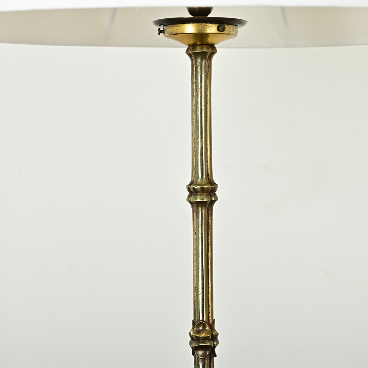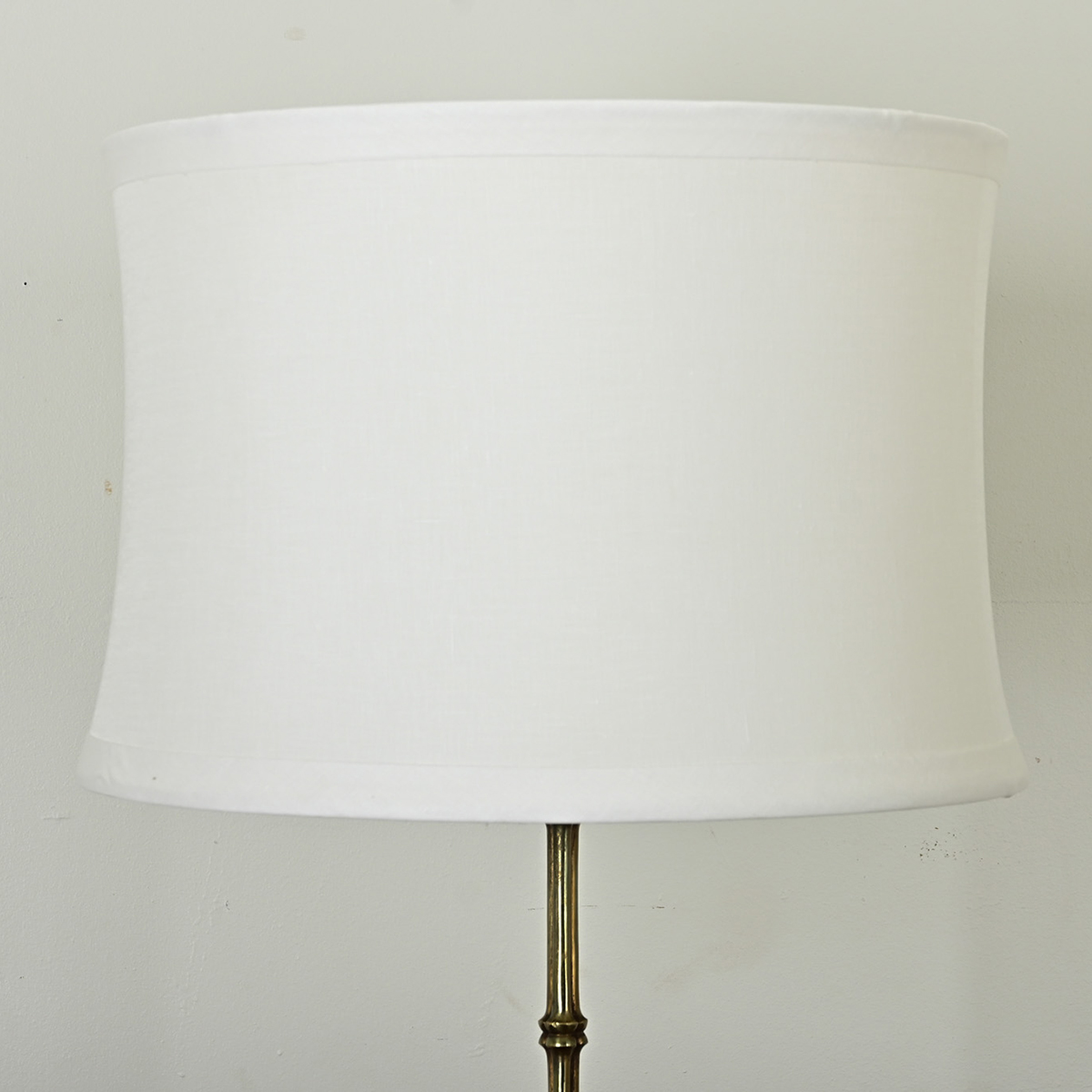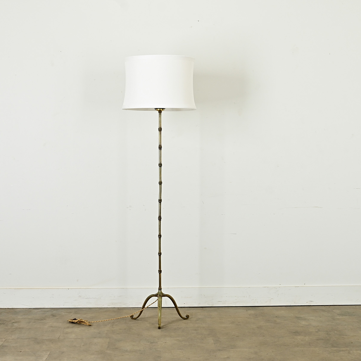 Glamorous brass floor lamp like a stalk of bamboo, made in England–in the Hollywood Regency taste of the mid-20th century. Likely inspired by French designers at the time, such as Maison Bagues, this example is more stylized to exaggerate the texture of the nodes at regular intervals up the column. At the tripod base, the feet curl elegantly upward into little scrolls. A new, white linen shade diffuses the light source of a single bulb. Cleaned and wired for US electric using UL-listed parts, this lamp is ready for your interior. Please view the detailed images.