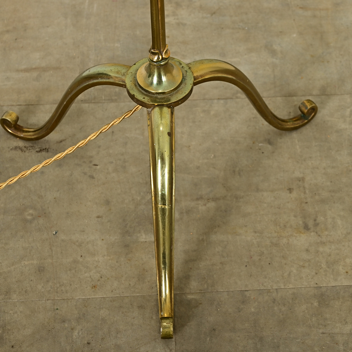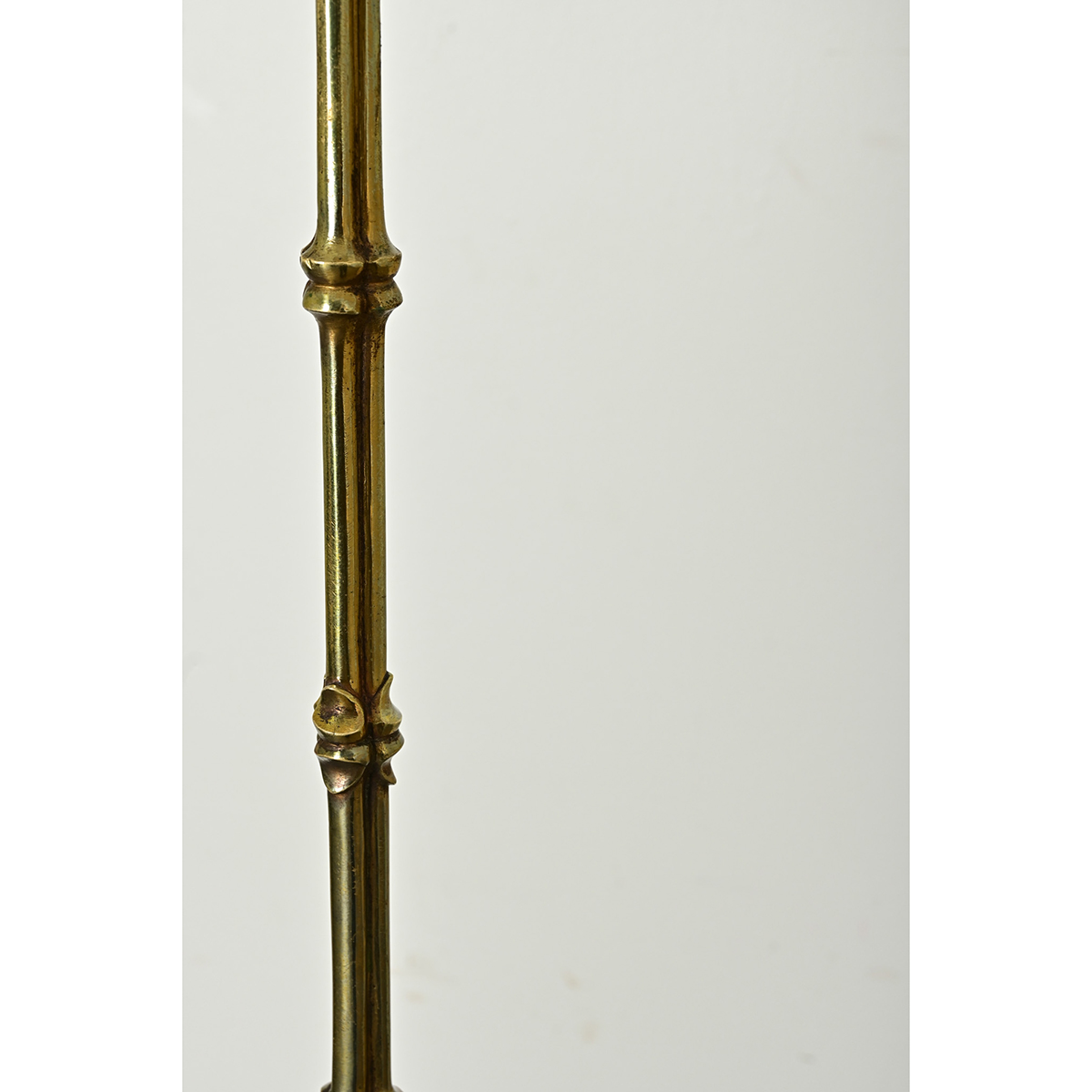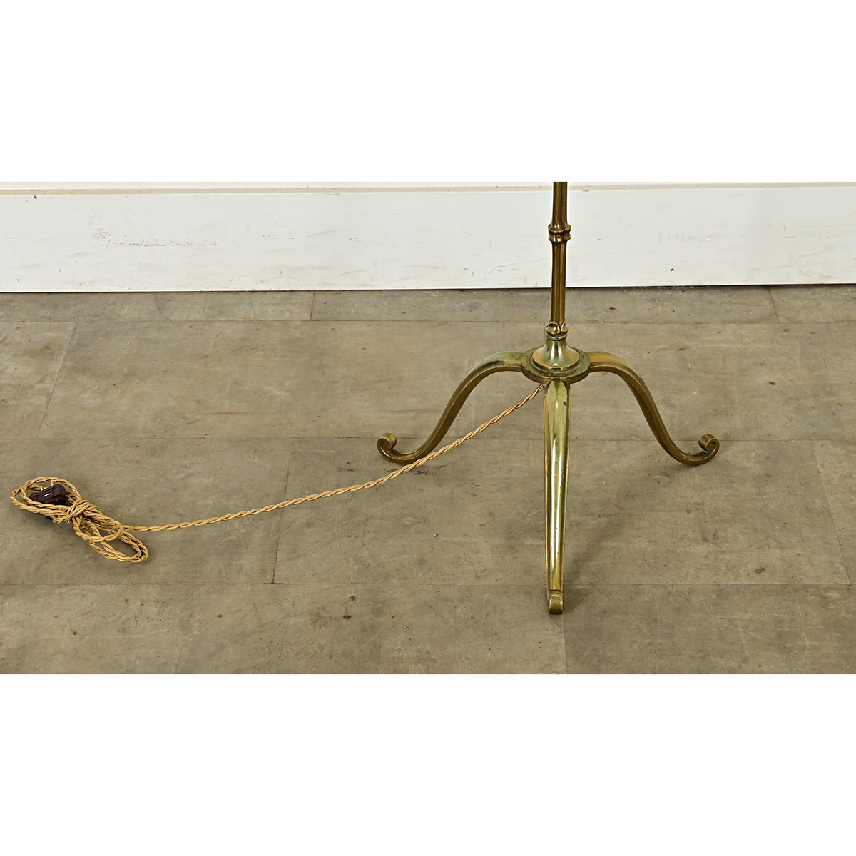 Glamorous brass floor lamp like a stalk of bamboo, made in England–in the Hollywood Regency taste of the mid-20th century. Likely inspired by French designers at the time, such as Maison Bagues, this example is more stylized to exaggerate the texture of the nodes at regular intervals up the column. At the tripod base, the feet curl elegantly upward into little scrolls. A new, white linen shade diffuses the light source of a single bulb. Cleaned and wired for US electric using UL-listed parts, this lamp is ready for your interior. Please view the detailed images.