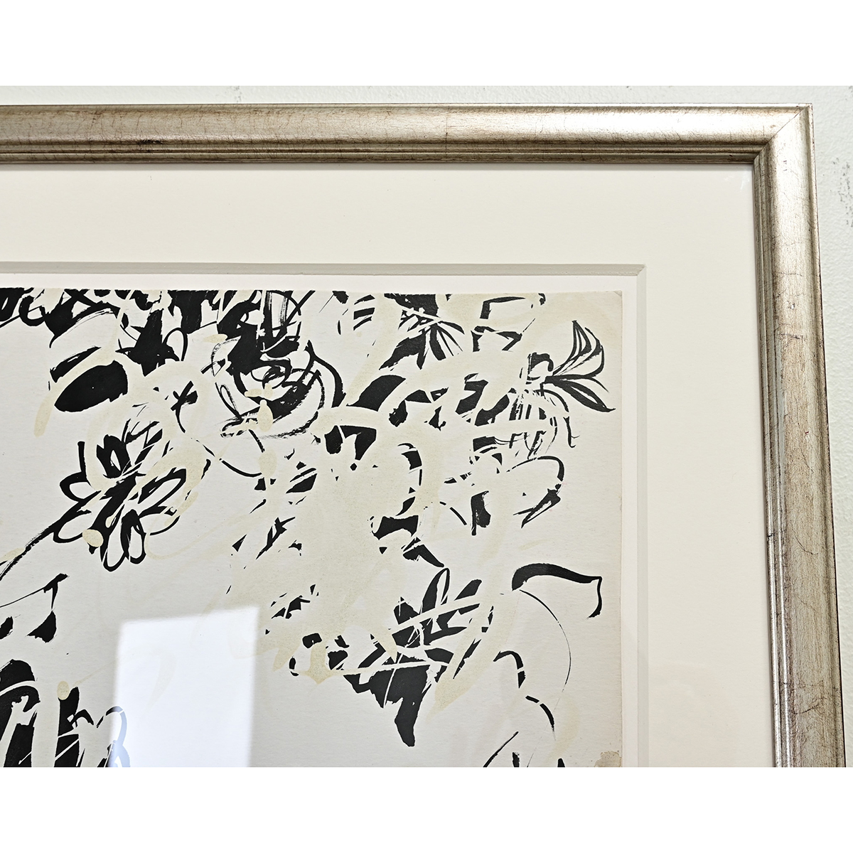 This is a modern English painting, ink on paper from the 1930’s. The wallpaper sample has a new mat surrounded by a silver gilt frame, protective glass and hanger. This mix of modern and antiquity compliment each other well. View the detailed images for the current condition.