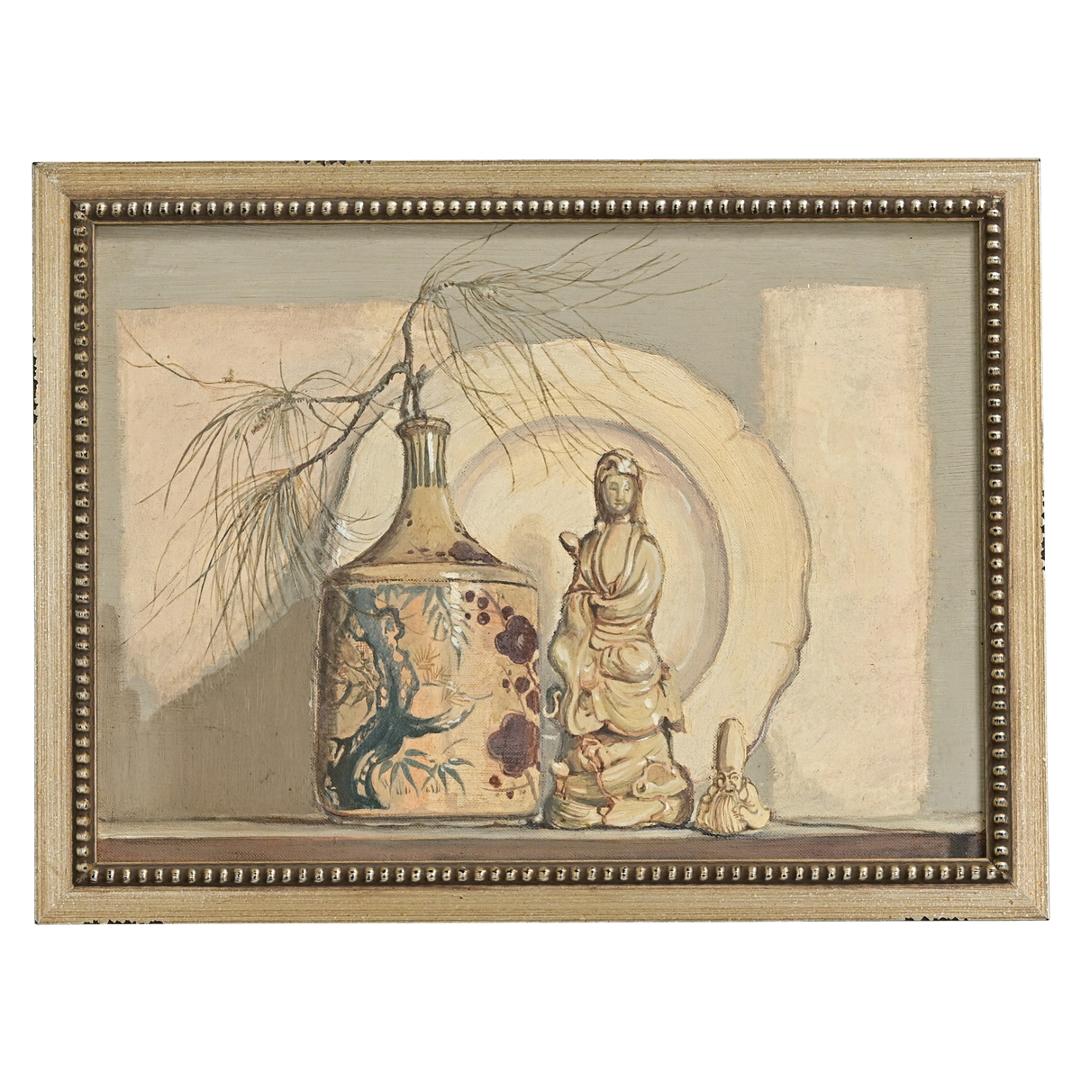 A petite framed still life painting by English artist, William John Clare Gaskell. This oil on canvas still life painting is whimsical and fun. Surrounded by a decorative wooden frame with a silvered finish this painting is ready to be hung in your interior. Be sure to view the detailed images to see the current condition.