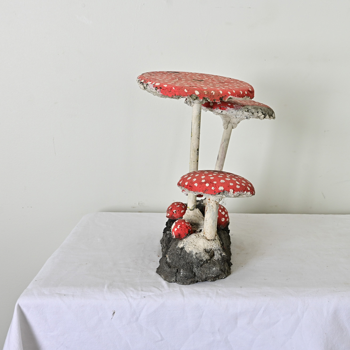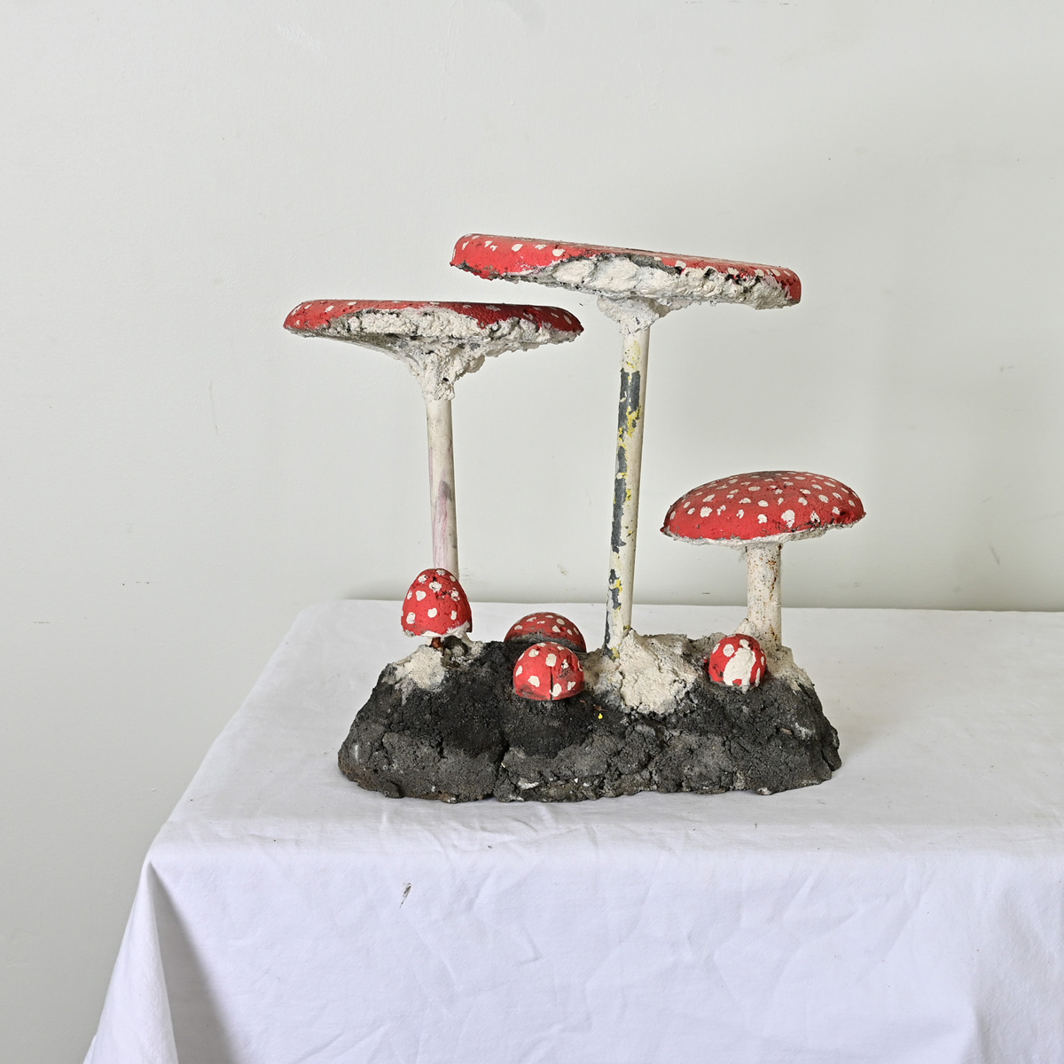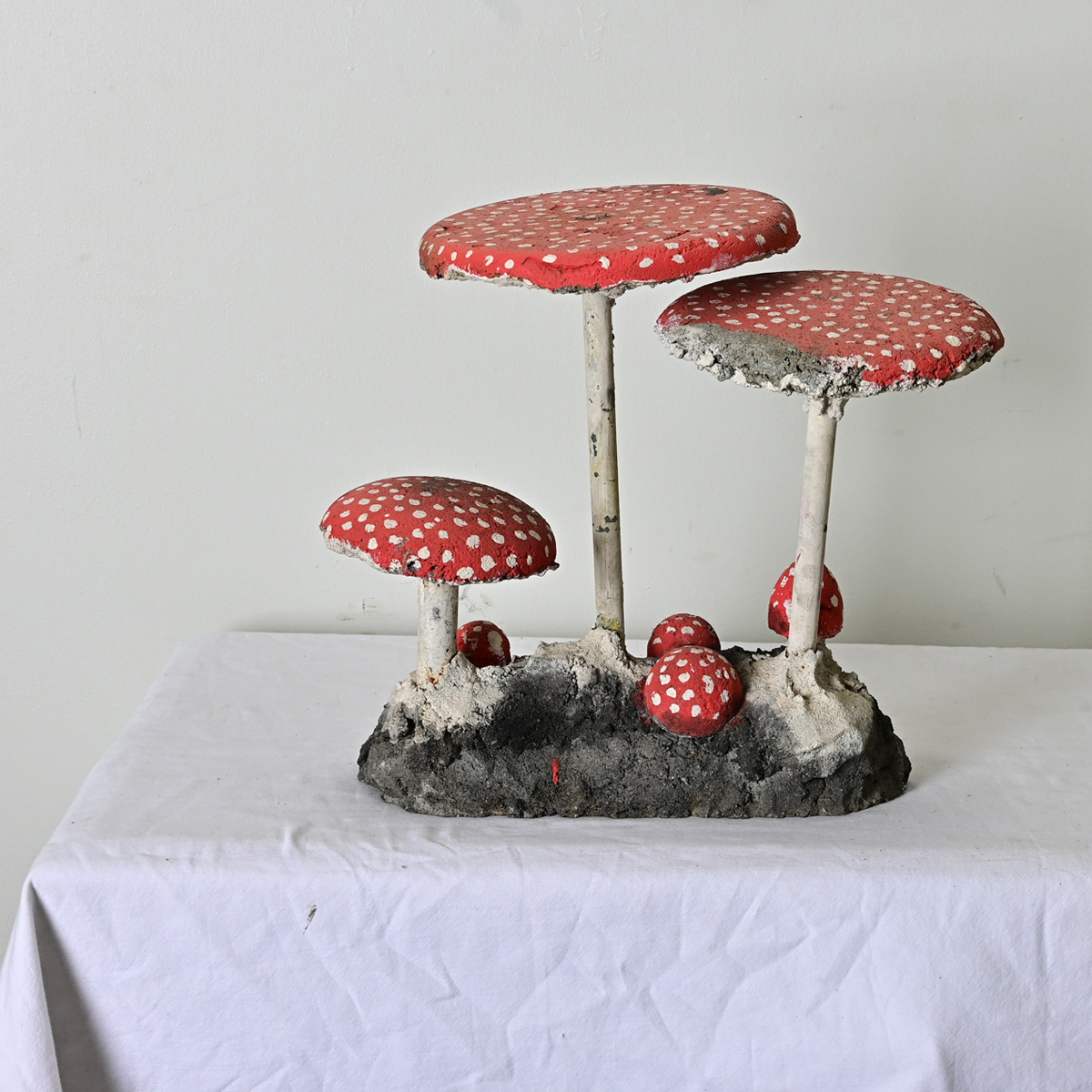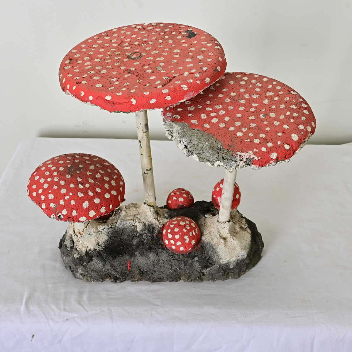 A curious and whimsical family of toadstools made in England to populate your garden or patio. Handcrafted from reconstituted stone and metal pipe with hand-painted decoration. The flat caps would make for unexpected and fun occasional tables. Please view the detailed images.