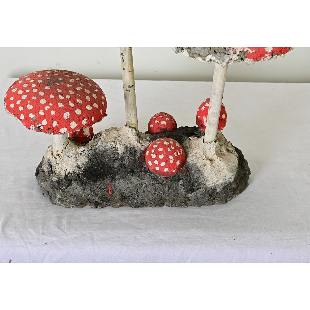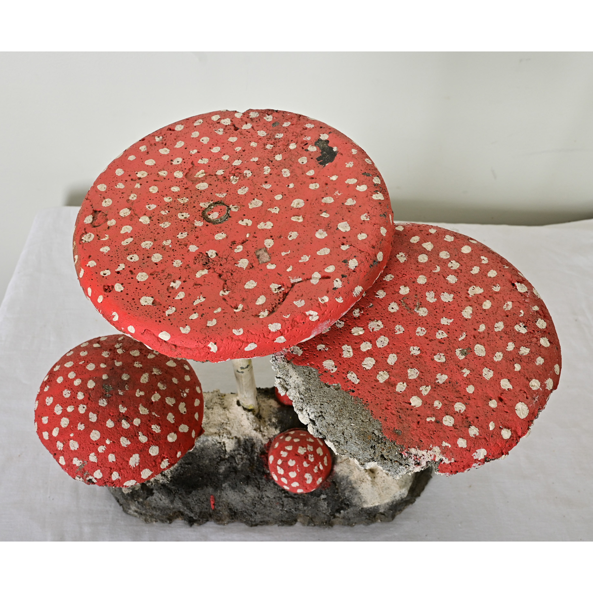 A curious and whimsical family of toadstools made in England to populate your garden or patio. Handcrafted from reconstituted stone and metal pipe with hand-painted decoration. The flat caps could make for an unexpected, light-duty occasional table as well. Please view the detailed images.