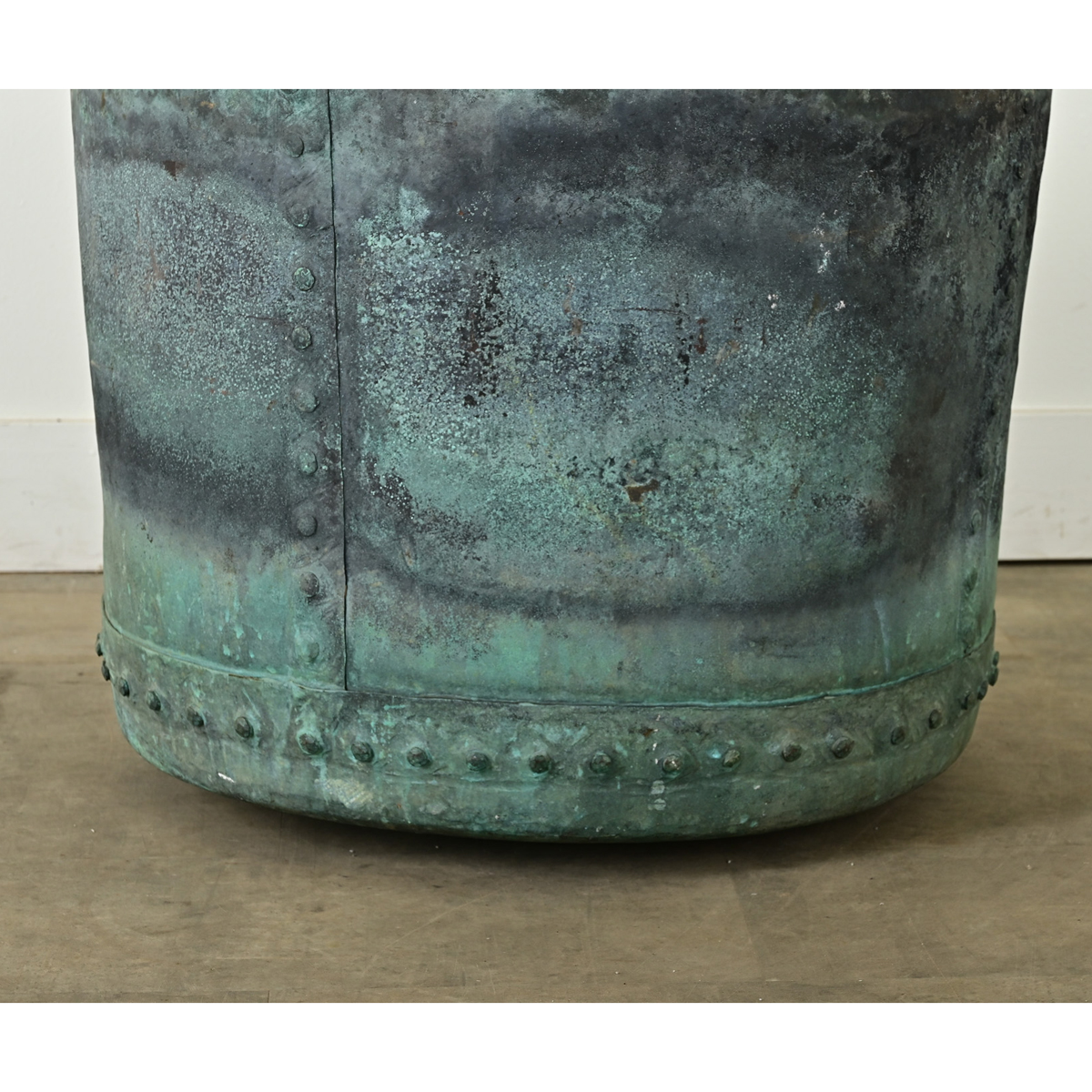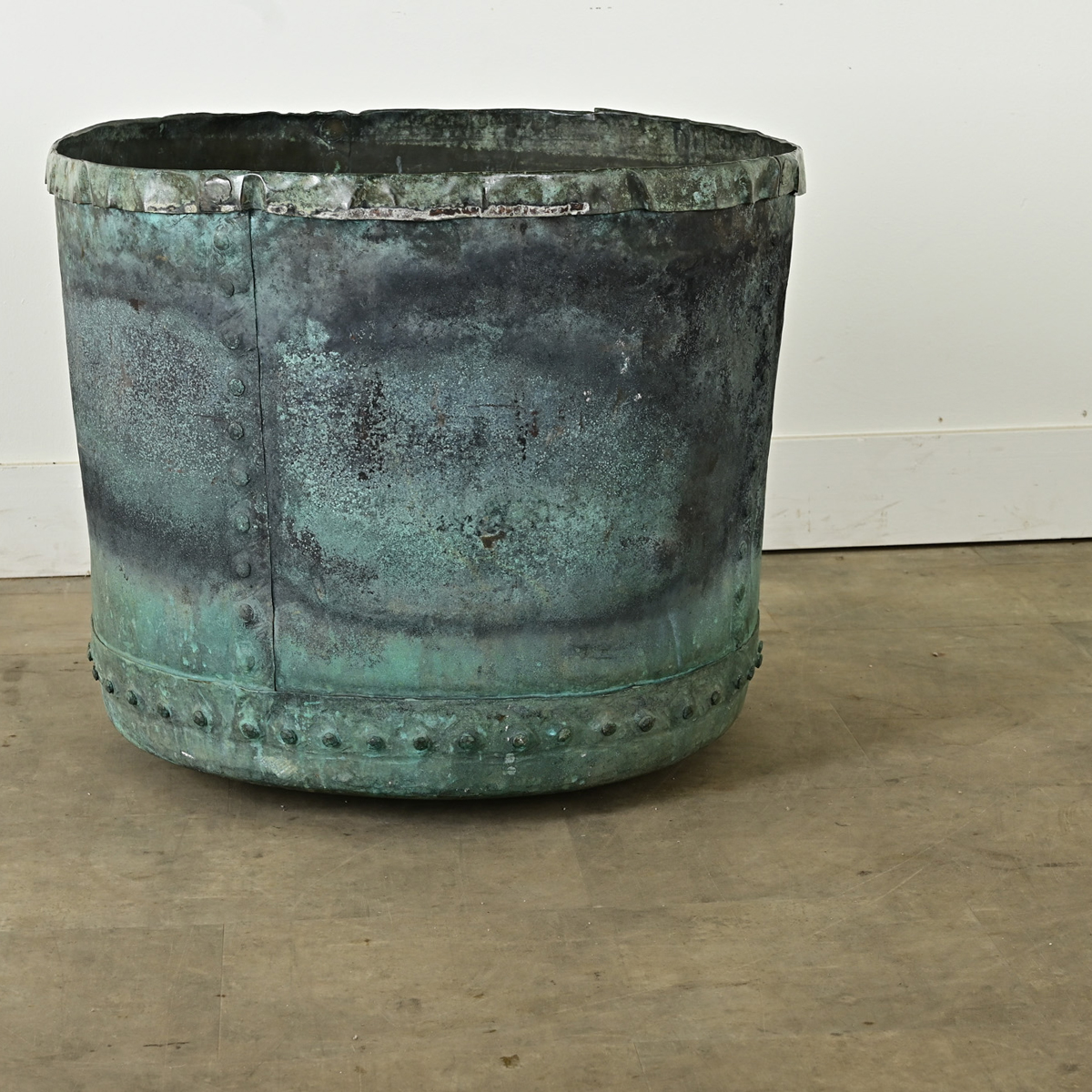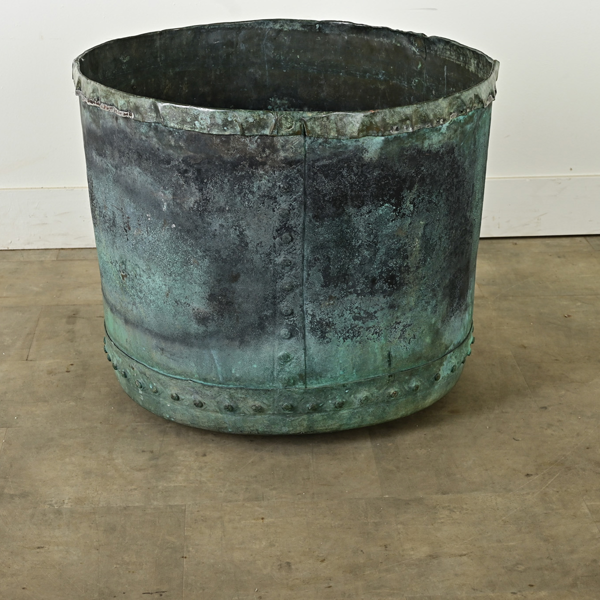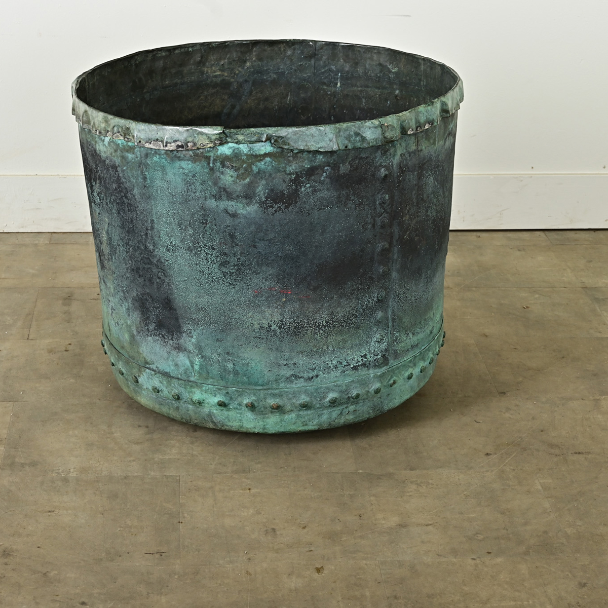 Enormous copper pot from England, circa 1850, with beautiful verdigris patina. Possibly used as a cauldron for washing linens, the early-industrial time period is evident in the construction methods such as the folded edge at the top and riveted seams along each sheet of copper. Today, the pot could be used by a fireplace as a unique place to store firewood, or even a planter! Its aged finish will only improve with time. Please view the detailed images.