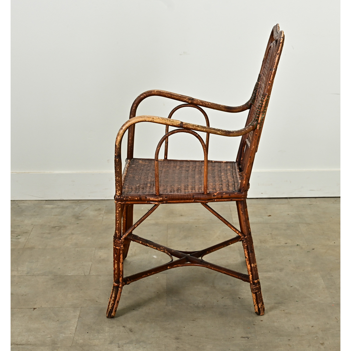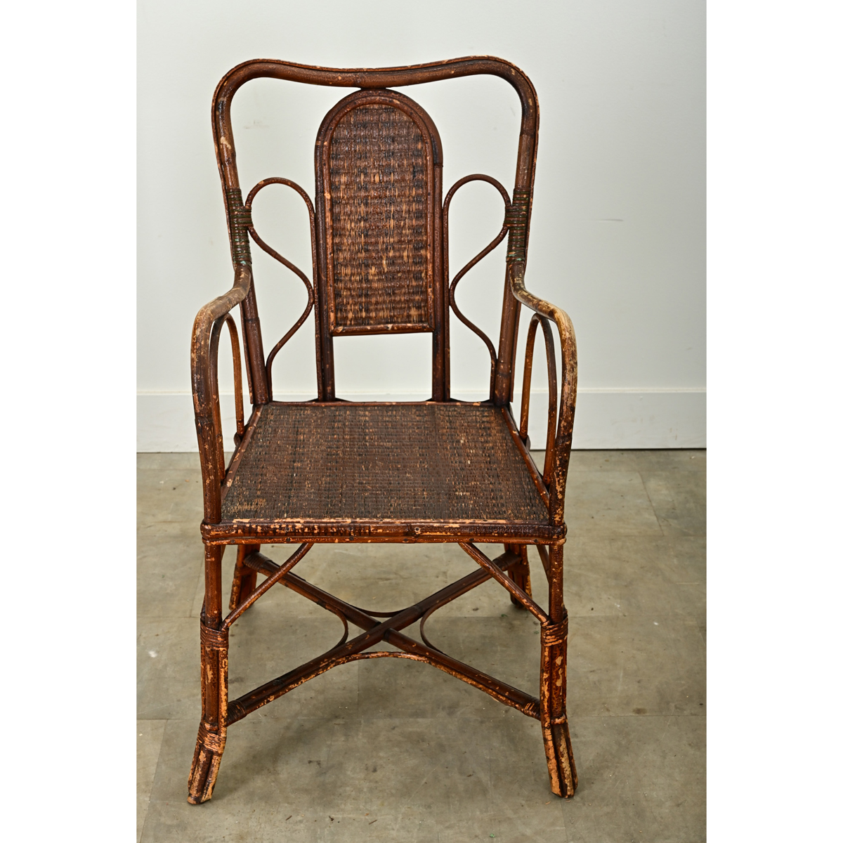 A single English mid-century rattan armchair. This stylish chair frame is curvy and bound together with woven rattan panels creating the chair back and seat. Comfortable, sturdy and attractive, this chair is ready to be used. Be sure to view the detailed images to see the current condition. Seat height 18”