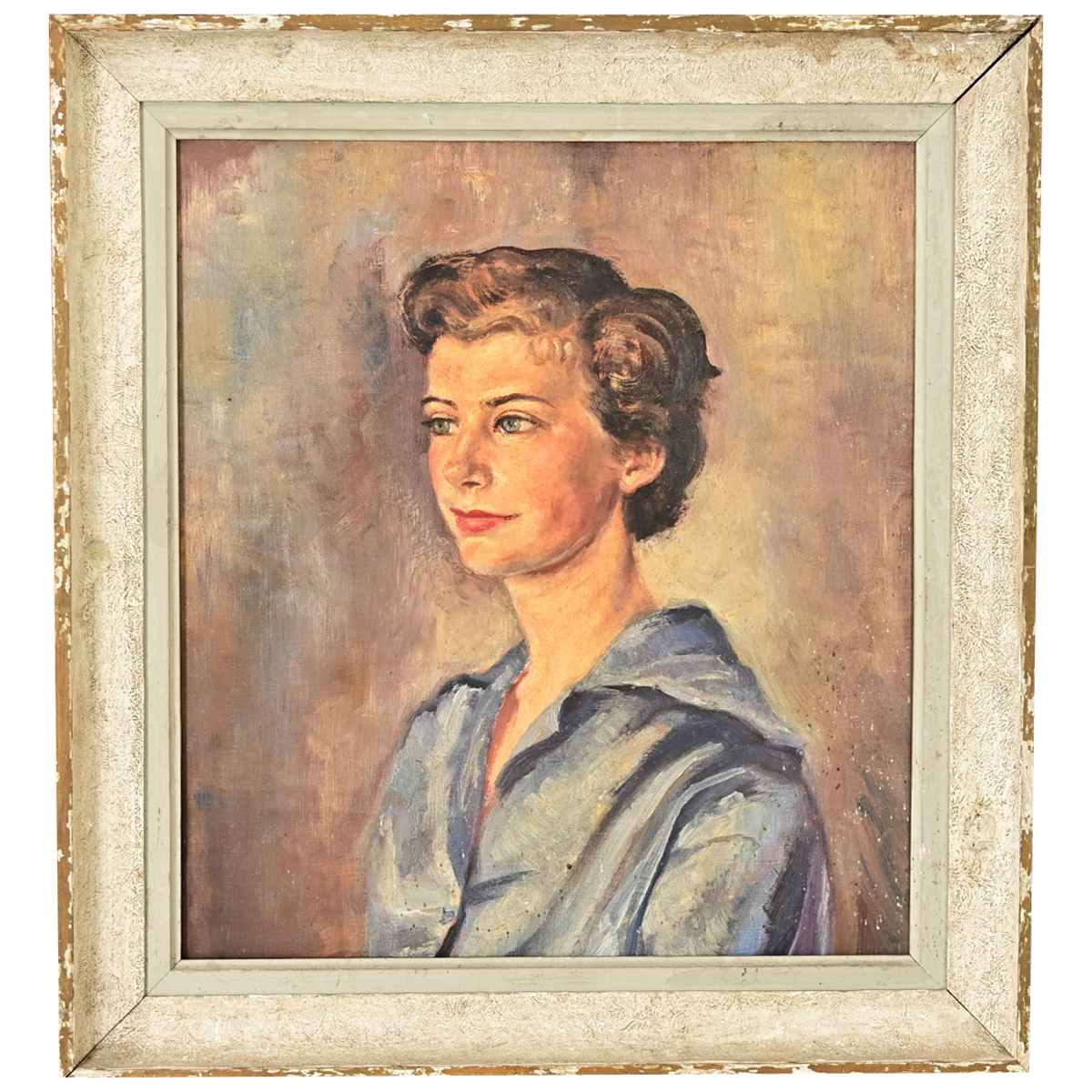 English, circa 1940 oil on canvas portrait of a young woman bearing a confident expression and the curious smile of Mona Lisa. A mottled background of taupe-gray is the perfect complement to her piercing blue eyes, red lips, and French-blue blouse. Sadly there is no visible signature to attribute an artist, the viewer is free to use their imagination to construct a narrative about who this intriguing subject may have been. The white painted frame is ready to hang in your interior; it has an orange-peel texture–appropriate for the time period–outlined in a painted gold border at the edge that has patinated over time. Please view the detailed images to see the current condition.