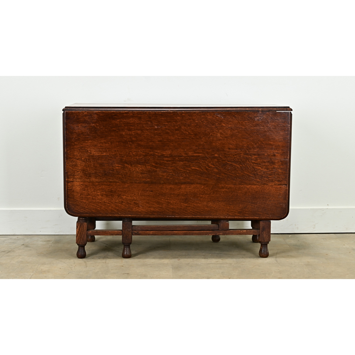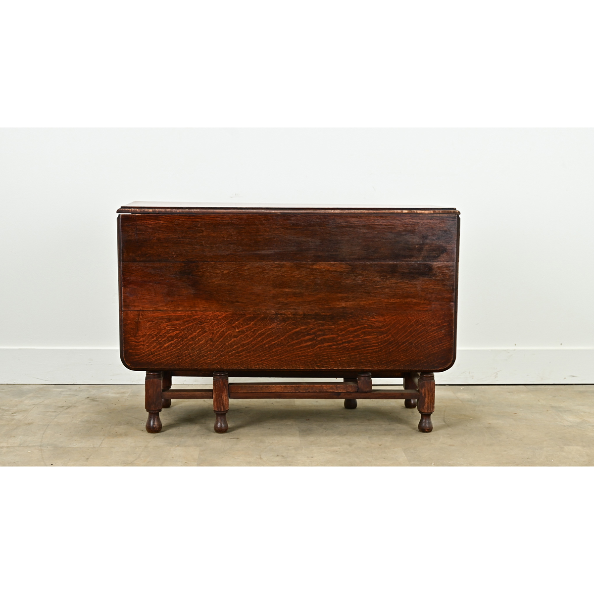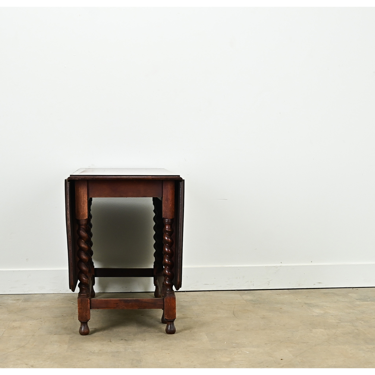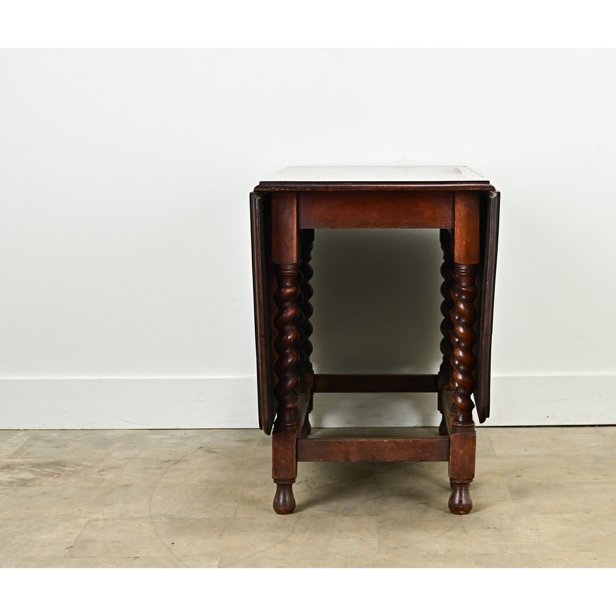 This English solid oak gateleg table is versatile and easy to use. The drop leaf table top is in three sections to be used as needed. This table can be used with both sides down as a console, or against the wall with one leaf up and lastly this table can float in a room and be used as a dining table with both leaves extended. The table’s base has many barley twist legs that open to support the drop leaves. Cleaned and polished with a paste wax this table is ready for your use. View all the detailed images to see its current condition.