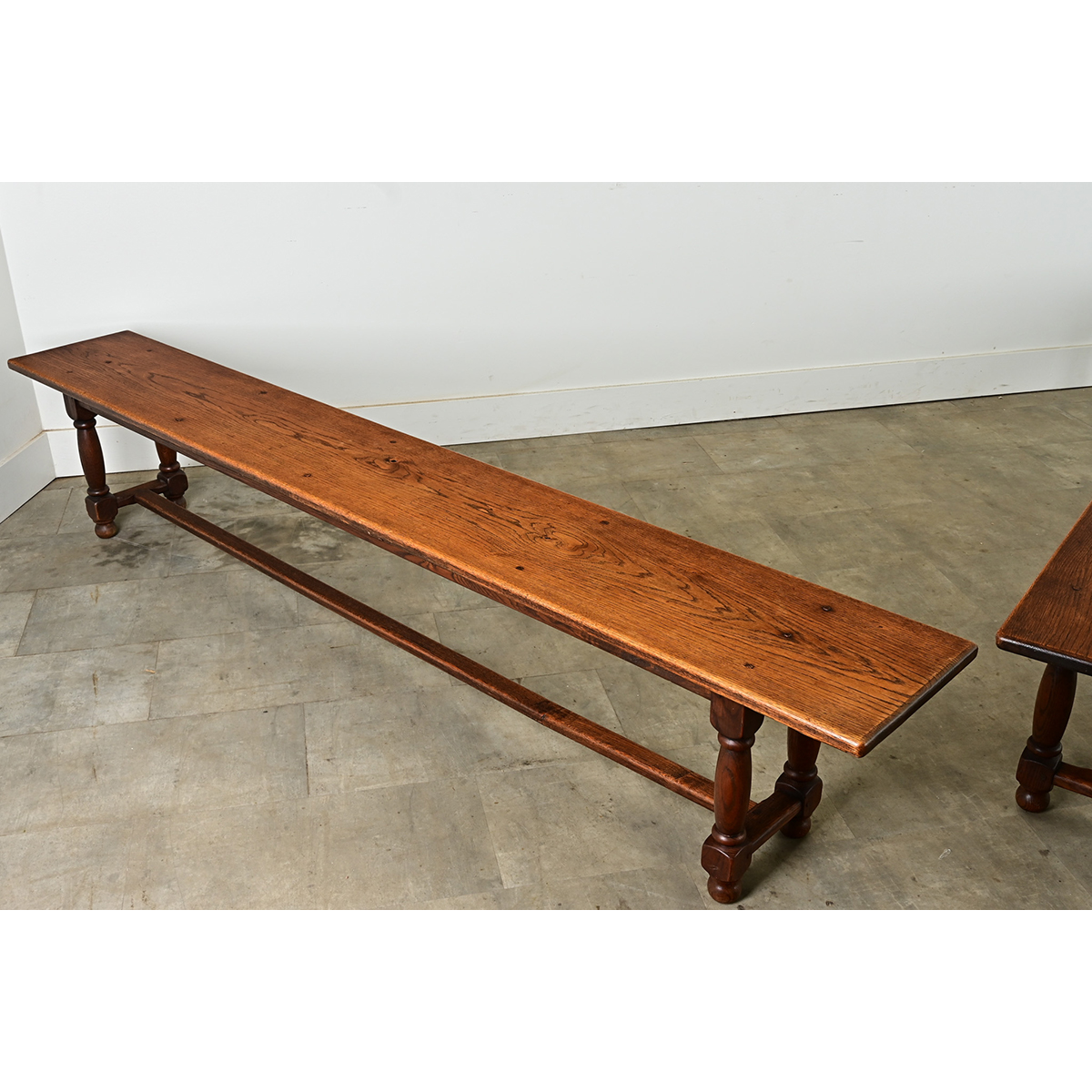 Impressive pair of English oak benches crafted of single plank tops dating to the late 1800s. The square wood dowel construction is evident at each juncture with the sturdy legs and stretcher, confirming the historic and exceptional beauty of these rare finds. Sold as a pair. View the images to appreciate every detail.