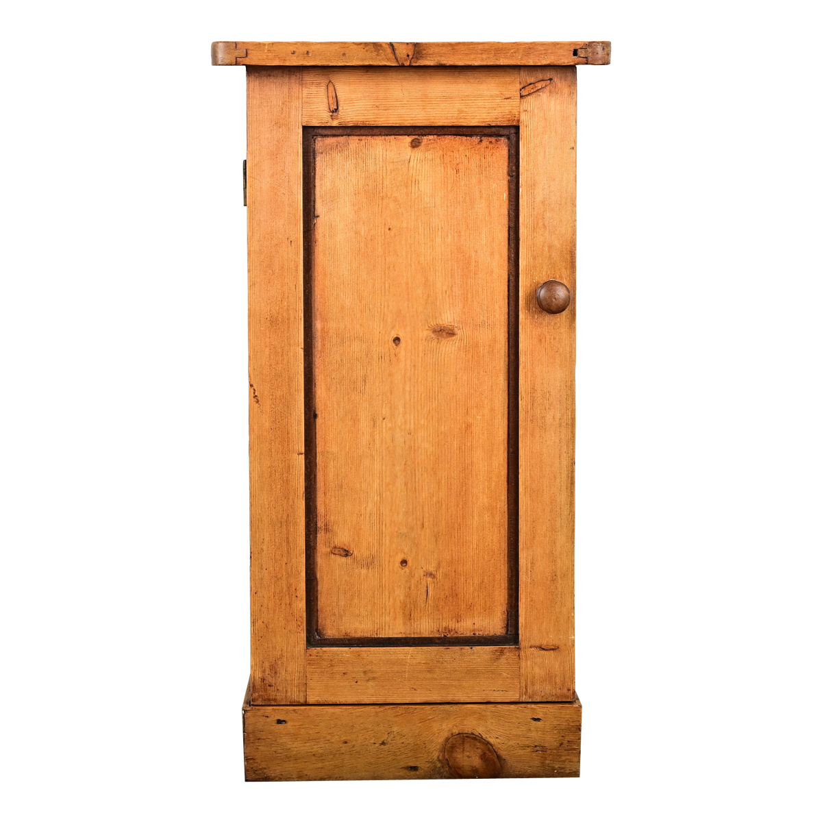 An English solid pine bedside cabinet from 1900’s. This cabinet has a simple plank top above a paneled door with a turned knob that opens to a fixed 10 ½” deep shelf. Cleaned and polished with a paste wax, this cabinet is ready for your immediate use. Be sure to view the detailed images to see the current condition.