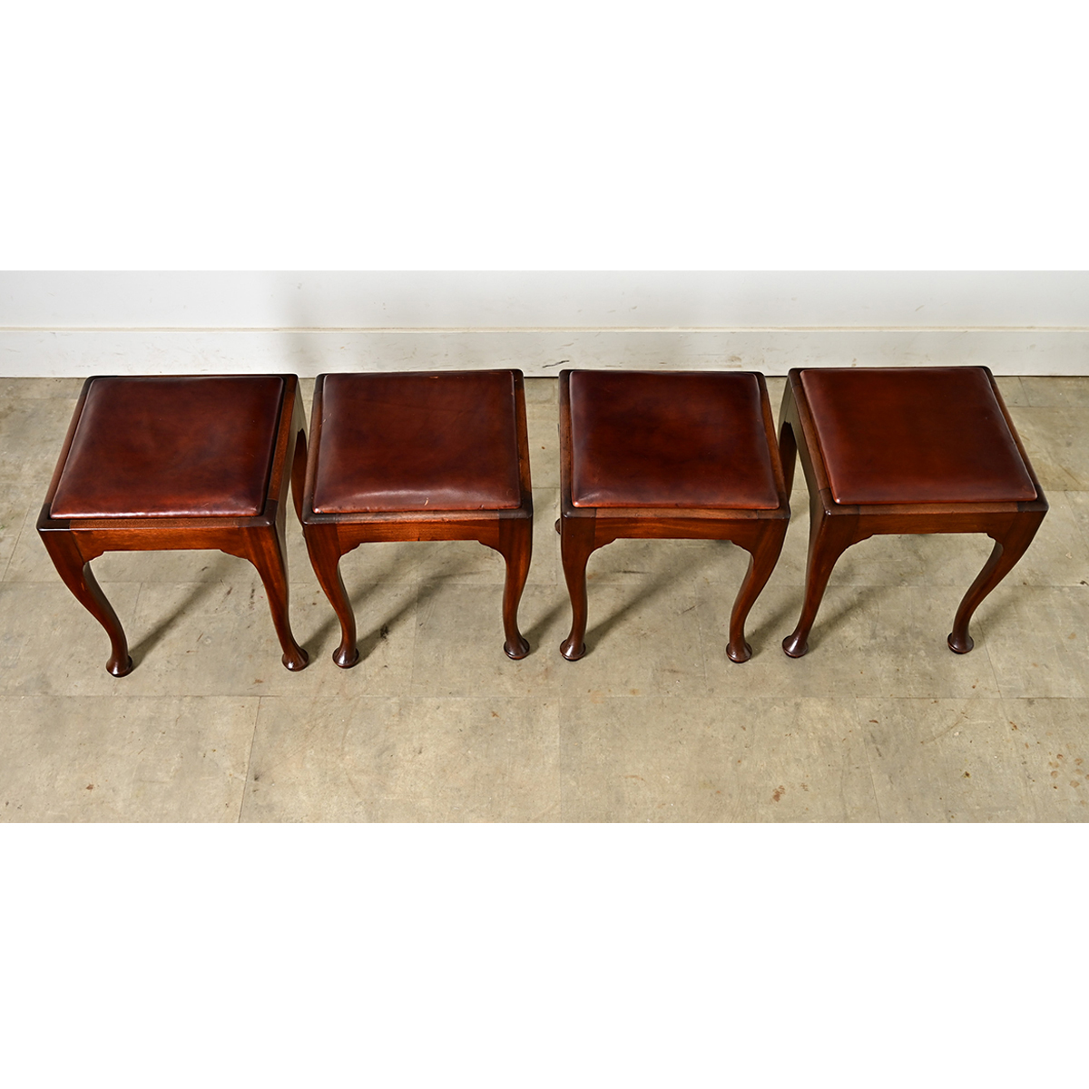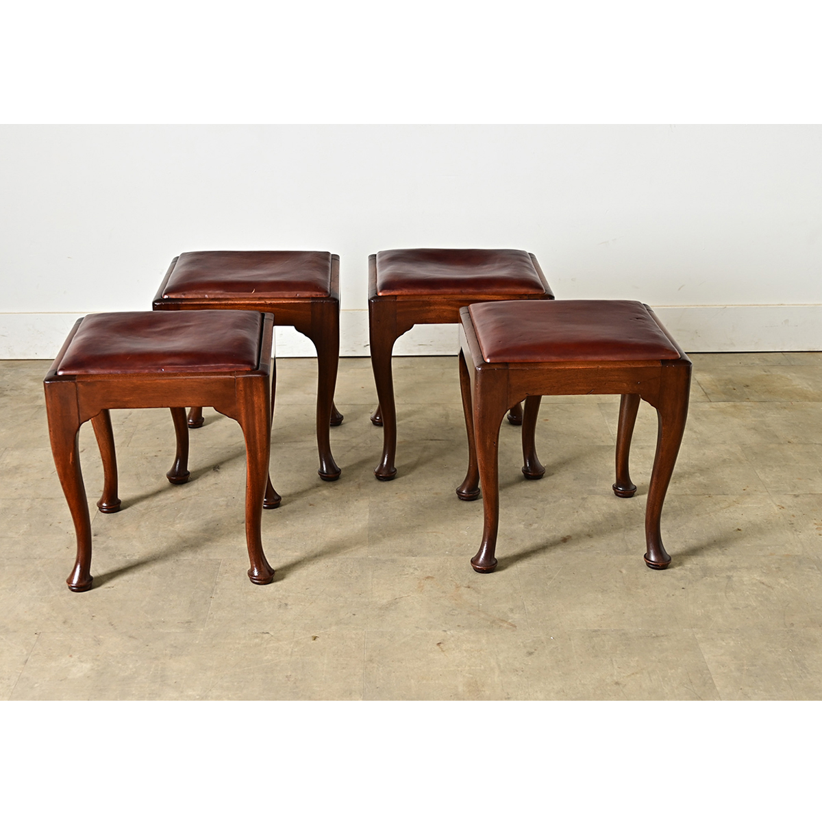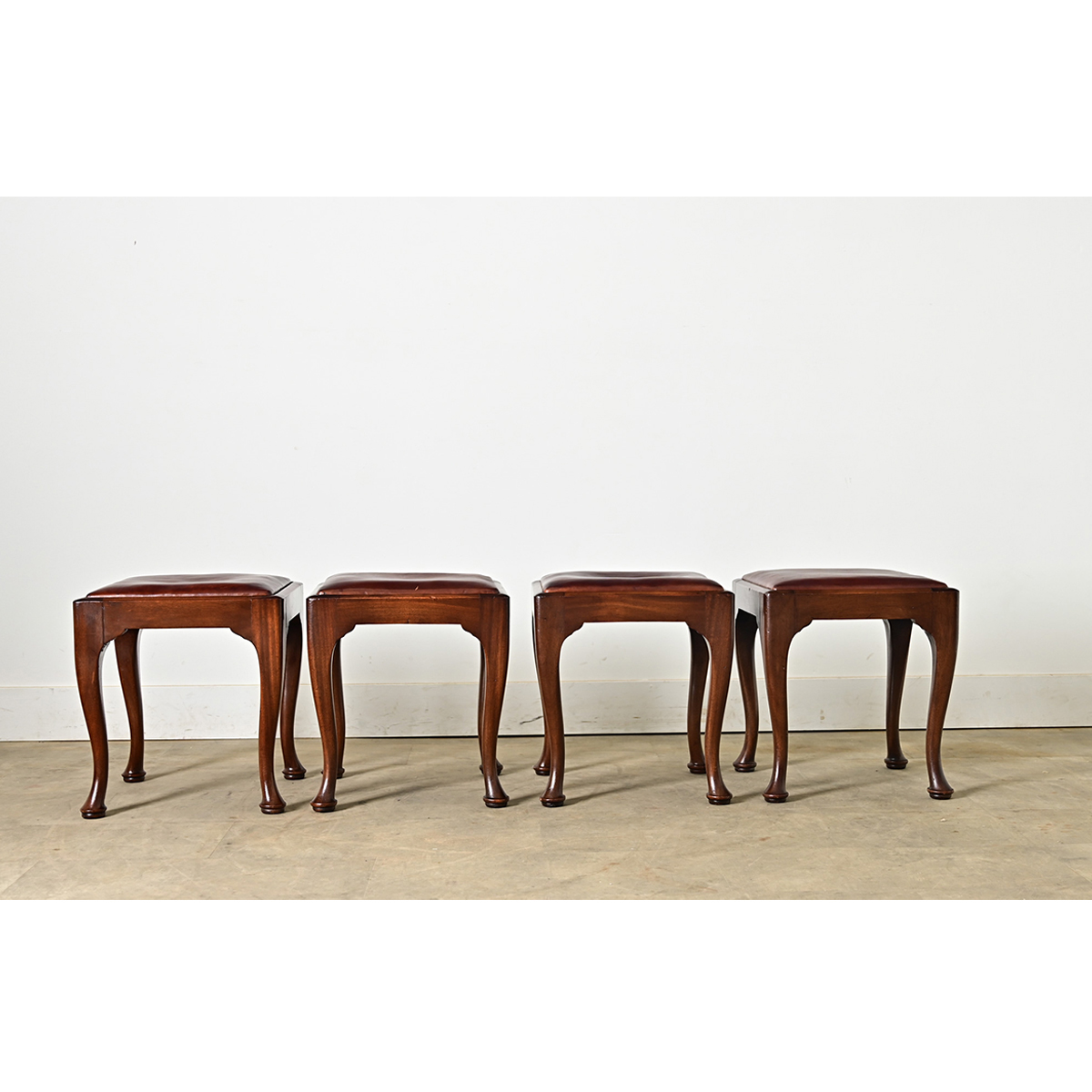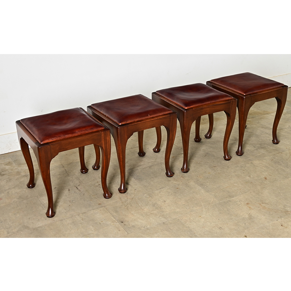 A very handsome set of four mahogany footstools from England circa 1900, on Queen Anne style cabriole legs supporting the removable upholstered seats of chocolate brown leather (with red-codovan undertones). This versatile set is adaptable to many uses: as extra seats, foot stools, or a table when paired with a tray! They have been gently cleaned and polished with a French paste wax to be ready for your interior. Please view the detailed images to see more as the leather seats exhibit scratches and other signs of use. Sold as a set of four.