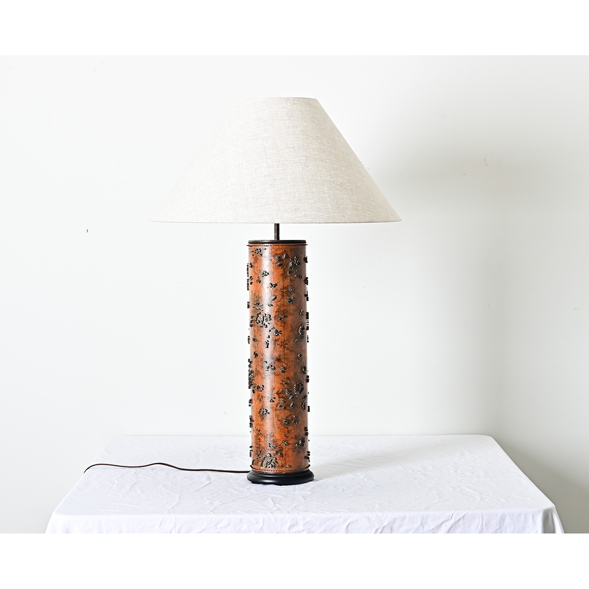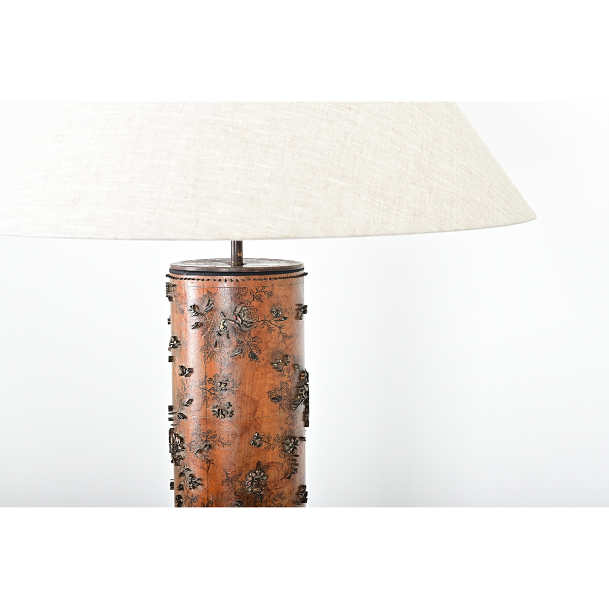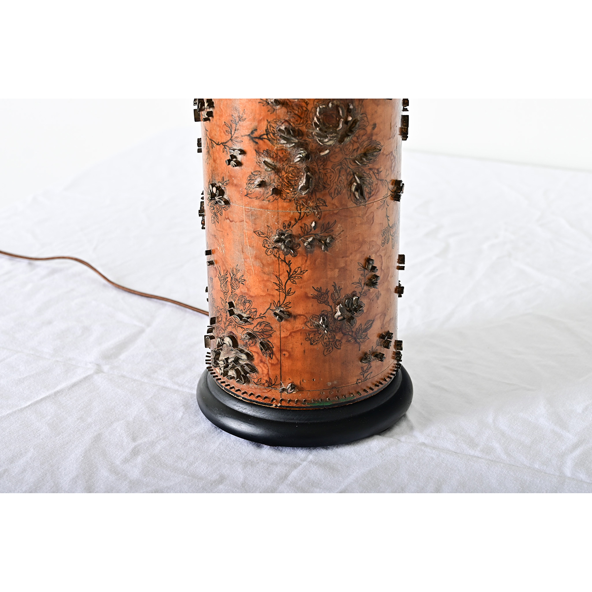 A wonderful repurposed–or upcycled–vintage wallpaper ink roller now a table lamp, topped with a new, conical shade in oyster gray linen to diffuse the light from a standard-base lightbulb. The wood cylinder is dotted by what remains of the floral and foliate brass stamp that would have printed a design onto paper, with other traces of the original illustration wrapping around the column. The lamp riser is an ebonized (painted) disc to not distract from the subtlety of the design. Cleaned and professionally rewired for US electrical using UL-listed parts including a new bronze-tone fabric cord, this table lamp is ready to illuminate your interior. Please view the detailed images.