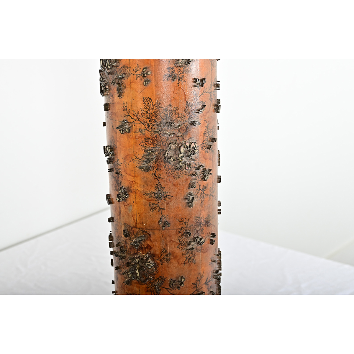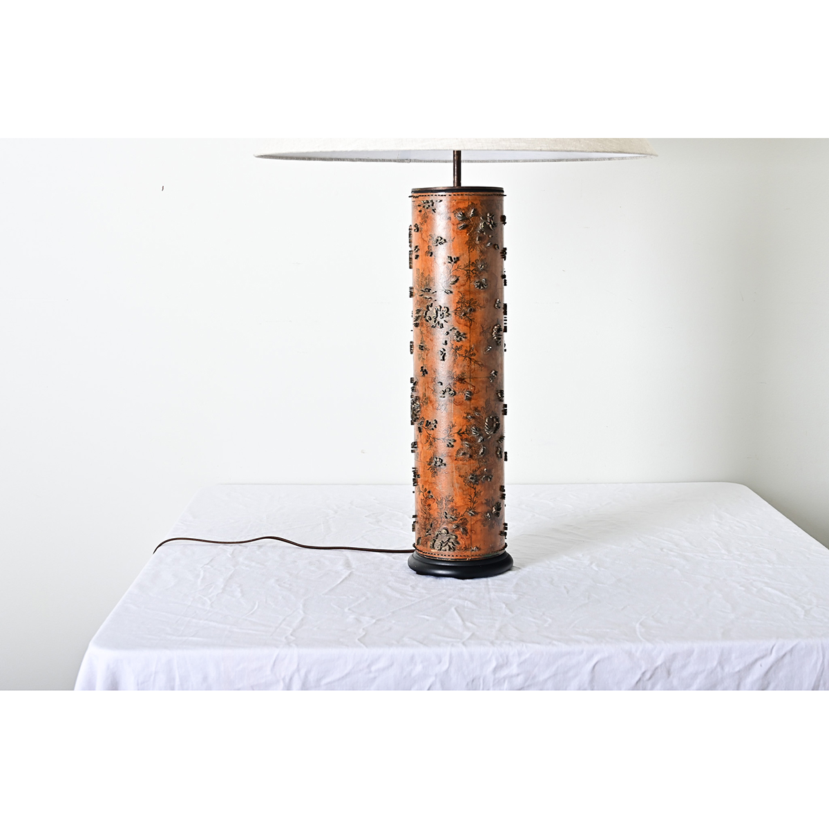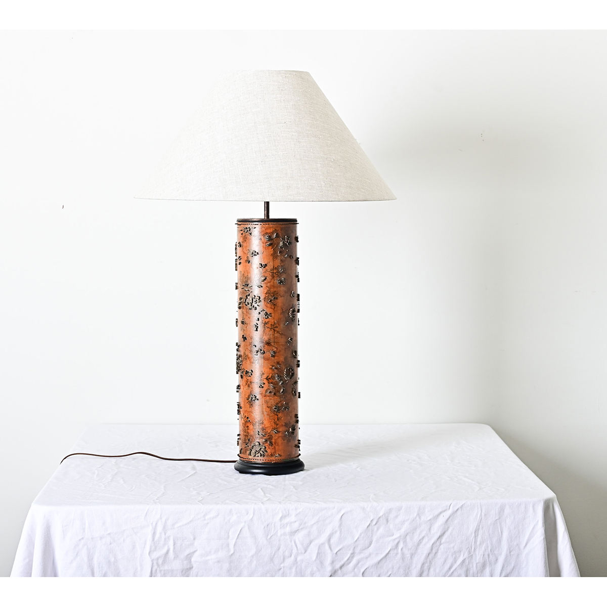 A wonderful repurposed–or upcycled–vintage wallpaper ink roller now a table lamp, topped with a new, conical shade in oyster gray linen to diffuse the light from a standard-base lightbulb. The wood cylinder is dotted by what remains of the floral and foliate brass stamp that would have printed a design onto paper, with other traces of the original illustration wrapping around the column. The lamp riser is an ebonized (painted) disc to not distract from the subtlety of the design. Cleaned and professionally rewired for US electrical using UL-listed parts including a new bronze-tone fabric cord, this table lamp is ready to illuminate your interior. Please view the detailed images.
