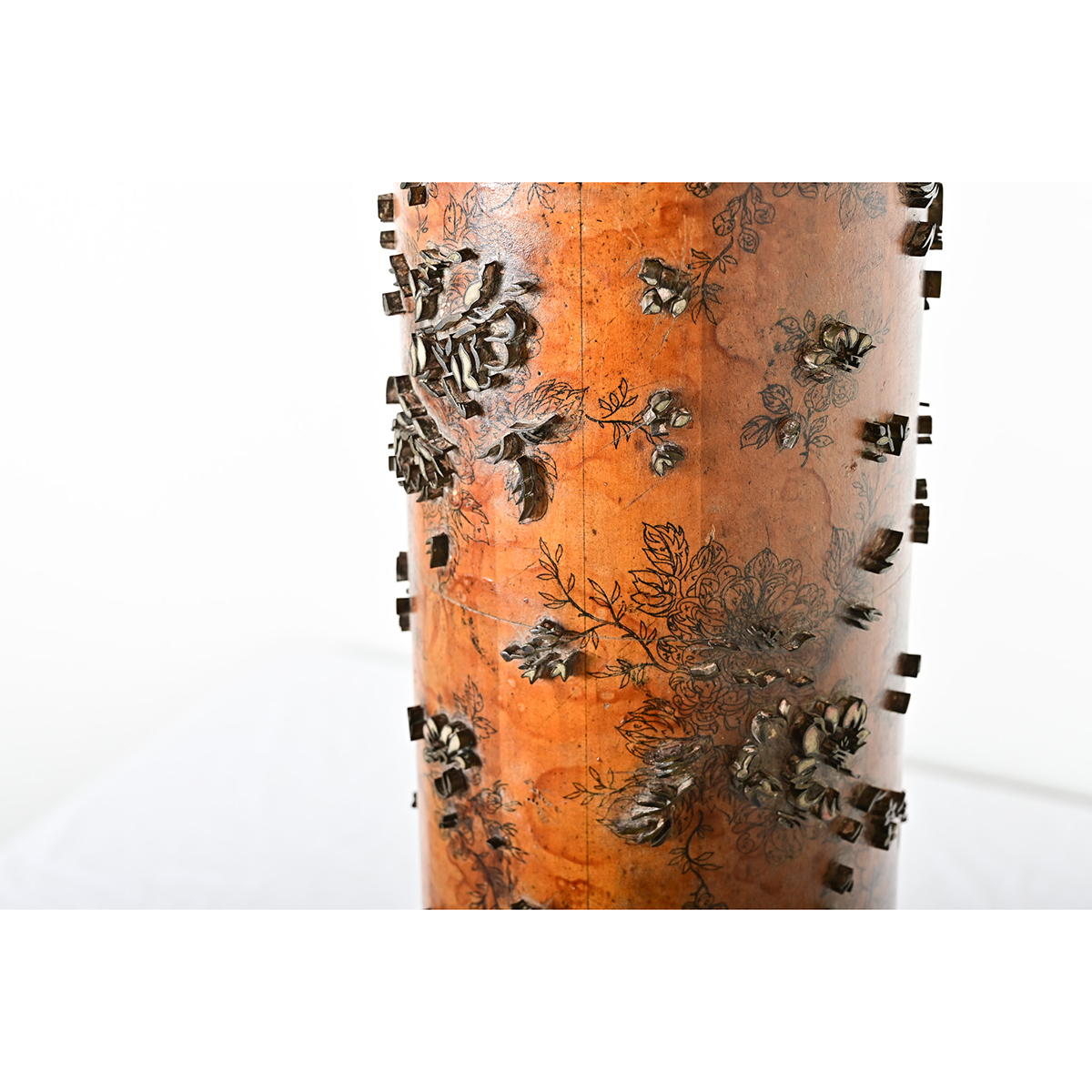 A wonderful repurposed–or upcycled–vintage wallpaper ink roller now a table lamp, topped with a new, conical shade in oyster gray linen to diffuse the light from a standard-base lightbulb. The wood cylinder is dotted by what remains of the floral and foliate brass stamp that would have printed a design onto paper, with other traces of the original illustration wrapping around the column. The lamp riser is an ebonized (painted) disc to not distract from the subtlety of the design. Cleaned and professionally rewired for US electrical using UL-listed parts including a new bronze-tone fabric cord, this table lamp is ready to illuminate your interior. Please view the detailed images.