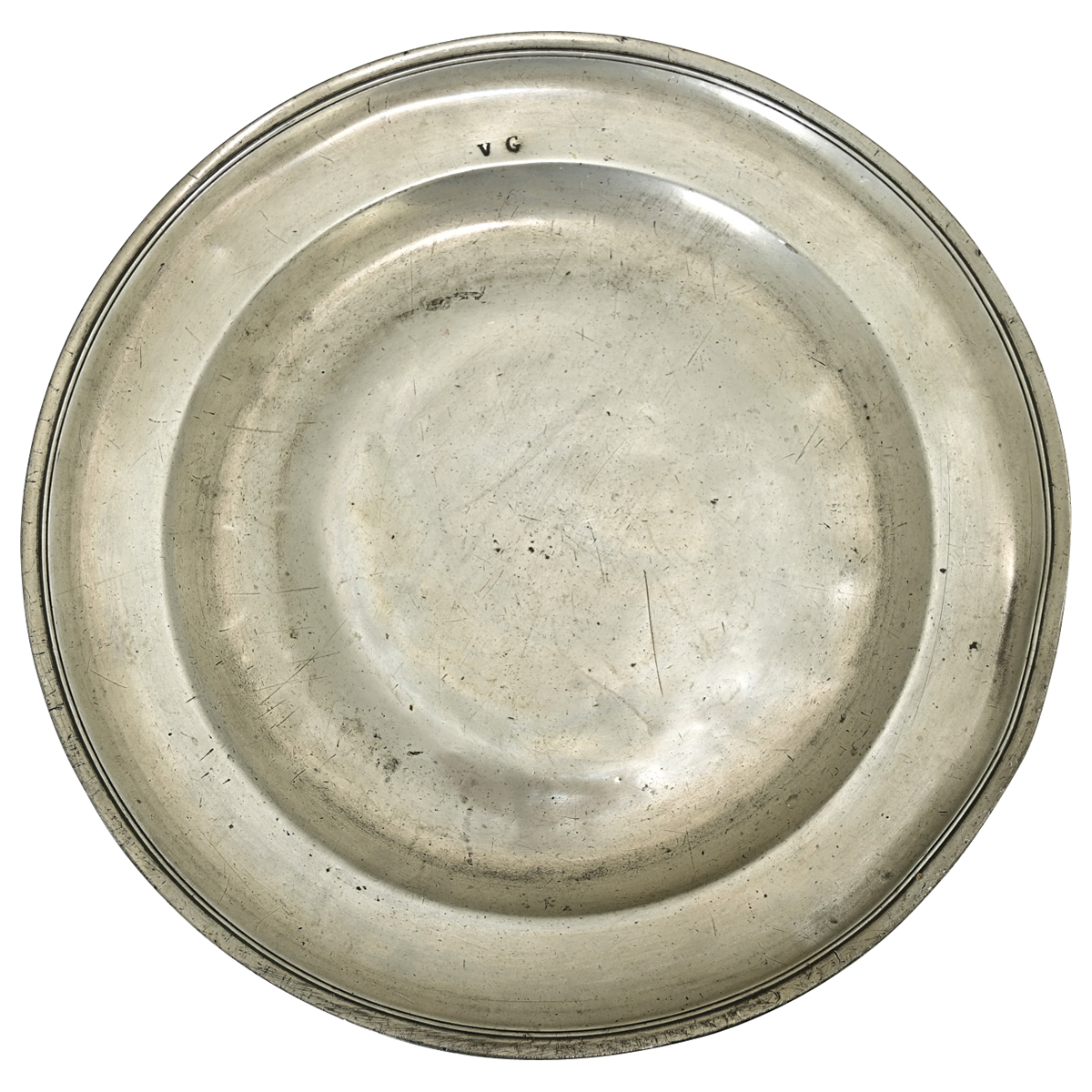 French, 18th century pewter charger plate from Rouen. The form of the plate is quite sophisticated in its proportions and simplicity–the perfect complement as a table centerpiece or part of a larger collection. Engraved “VG” in the rim. Hallmarked and dated 1757. Please view the detailed images to see the current condition.