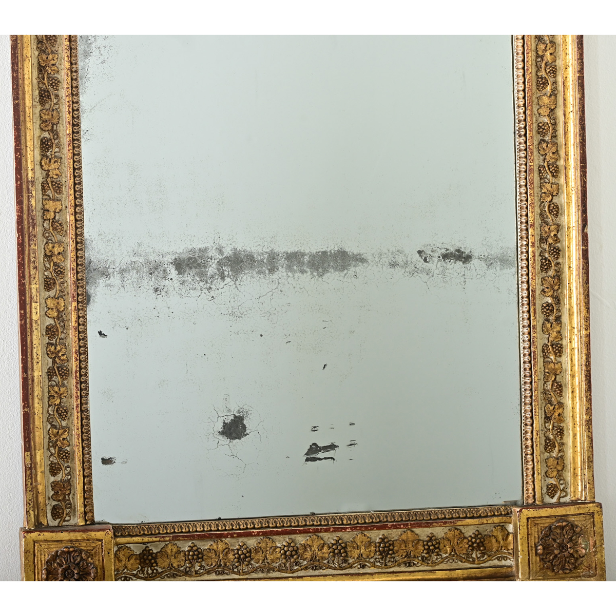 A wonderful 18th century French gold giltwood mirror, likely made as a wedding gift, the square frame is dense with texture and pattern of grape vines to brighten up any room. Unusual for this genre of mirrors, the expected pedimented at the top has been curiously omitted, telling its symbolic narrative of abundance through delicate tendrils and grape clusters that wrap around the French gray painted background. The foliate elements are bookended at the lower corners with rosettes which transition into the tall feet elevating and protecting the frame. Beaded molding on the interior surrounds the original mirror plate that shows a line of foxing toward the middle among other spots of textural oxidation. Strung with wire on the back, ready to hang in your interior. Please view the detailed images to see more and the current condition.