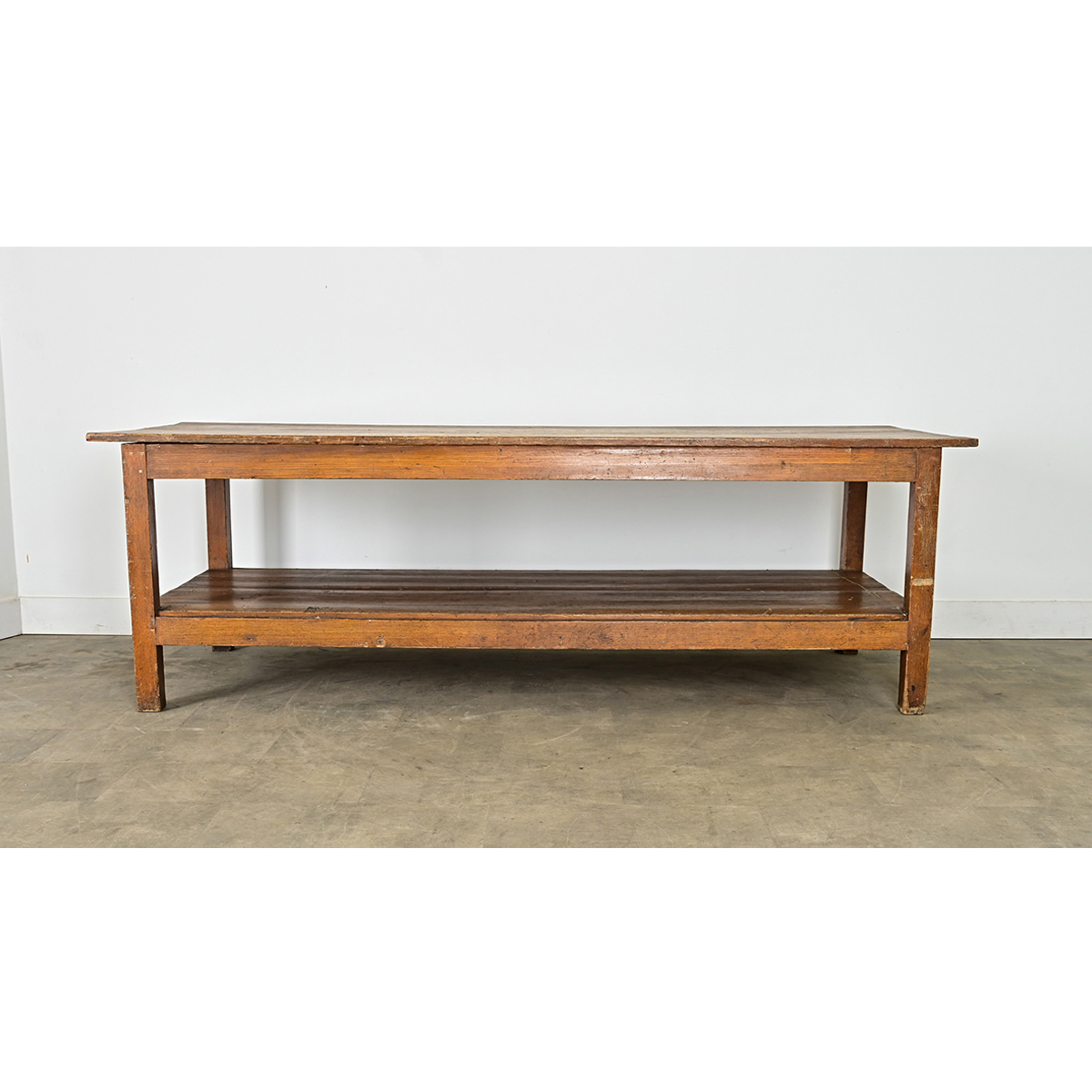 A French, 18th century work table in two tiers, formerly a drapery table where dramatic window treatments could be assembled at a comfortable standing height and scale. The tall and large surface area is ideal for any creative pursuit from the artist’s studio to home baker–perfect as an unexpected kitchen island. The forgiving top surface is already well patinated, made of multiple planks with a slight overhang. Solid, square legs support a lower shelf for additional storage and display leaving a gap between the floor to access outlets or other utilities. Cleaned and polished with a French paste wax, this antique work table is ready for your interior. Please be sure to view the detailed images to see the current condition.