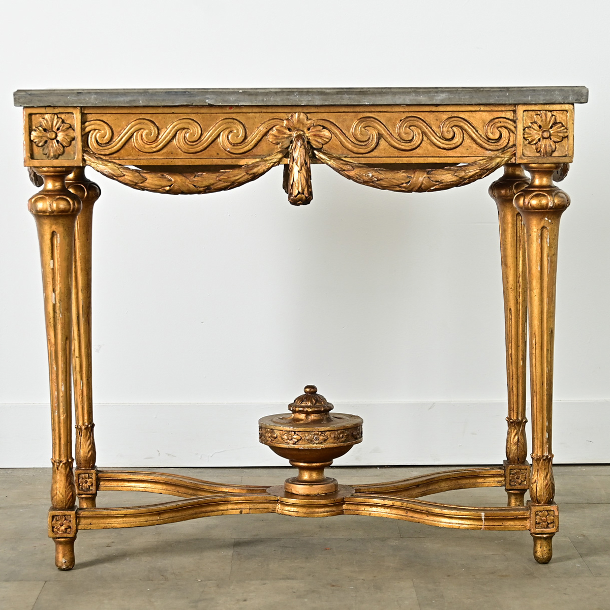 A dramatic French 18th century Louis XVI-style center table, with an exquisite giltwood base supporting its original thick slab of (removable) dark gray marble. The monochromatic stone features a low, routed edge along the perimeter with only minor evidence of its historic age, otherwise in good antique condition. The table’s apron shows exciting movement in the stylized wave motif, anchored on the corners with rosettes and draped with swags. Four turned legs have a low, fluted pattern tapering down to the baroque X-stretcher crowned with a large urn where they intersect. Symmetrical to use as a center table or console table, this masterpiece of furniture will astound in any interior. Please view the detailed images to see more.