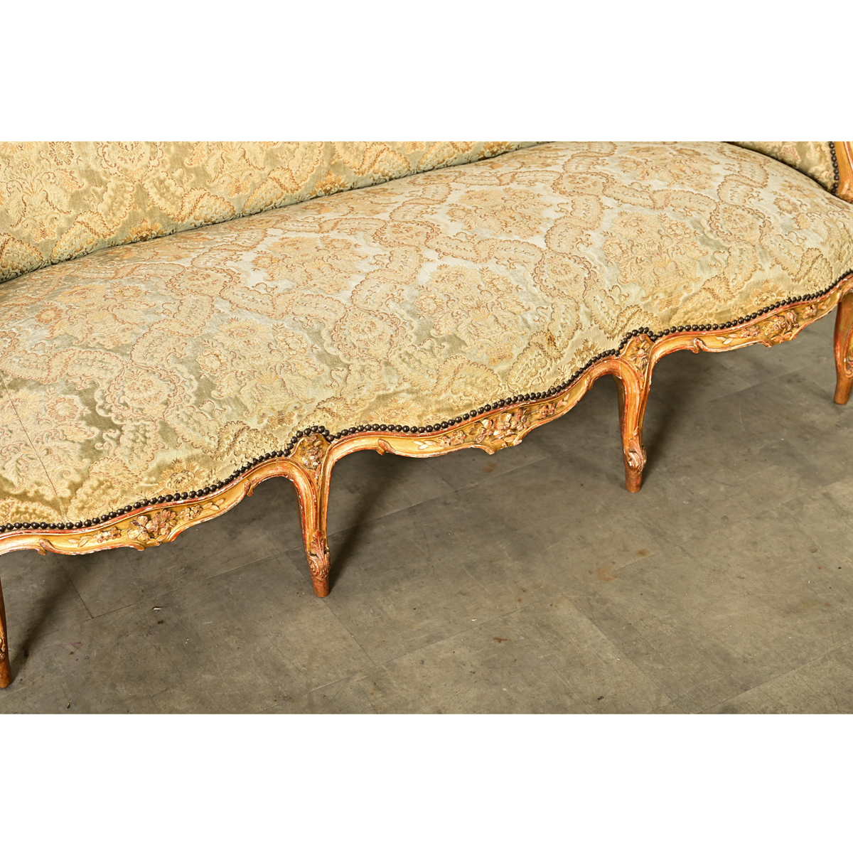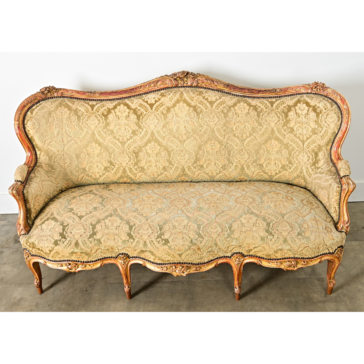 French, 18th century Louis XV period seating ensemble to instantly transform a parlor or living room into a grand “salon” with seven pieces: one camelback sofa, three fauteuil armchairs, and three (armless) side chairs. Upholstery of cut velvet in pale green–like a white jade–has been brocaded with tonal damask patterns, harmonizing with the botanical theme in the caved frames, and outlined in brass nailhead trim. The giltwood frames have patinated over the centuries to reveal the deep red bole underneath, giving definition to the sinuous, rococo curves accented with floral and foliate carvings positioned at strategic points for maximum effect. The thoughtful proportions of the seat interior (balancing the heights and depths) are all quite comfortable, with dense stuffing of horse hair or other natural material that remains mostly firm and supportive underneath the tight upholstery. Please view the detailed images to see more of this fabulous set and get inspired. Sold as a complete set only.