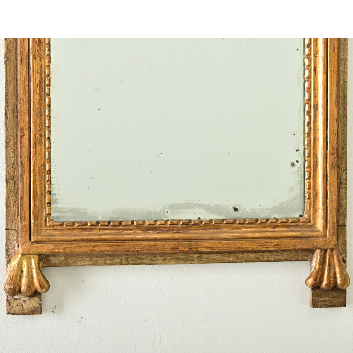 A unique French trumeau mirror of the Louis XVI period, dating to the 18th century, with fantastic gilt wood carvings applied to the (patinated) painted wood frame. Mounted above the mirror plate is a scrolling emblem that terminates as Neoclassical foliate projections on the pediment and to the left and right upper corners, softening the rectangular geometry. The original mirror plate is dusted with a foxing and crystals, mostly concentrated along the bottom edge. The glass is protected by a low, beaded trim. At the lower corners are whimsical three-toed feet. Please view the detailed images to see the current condition.