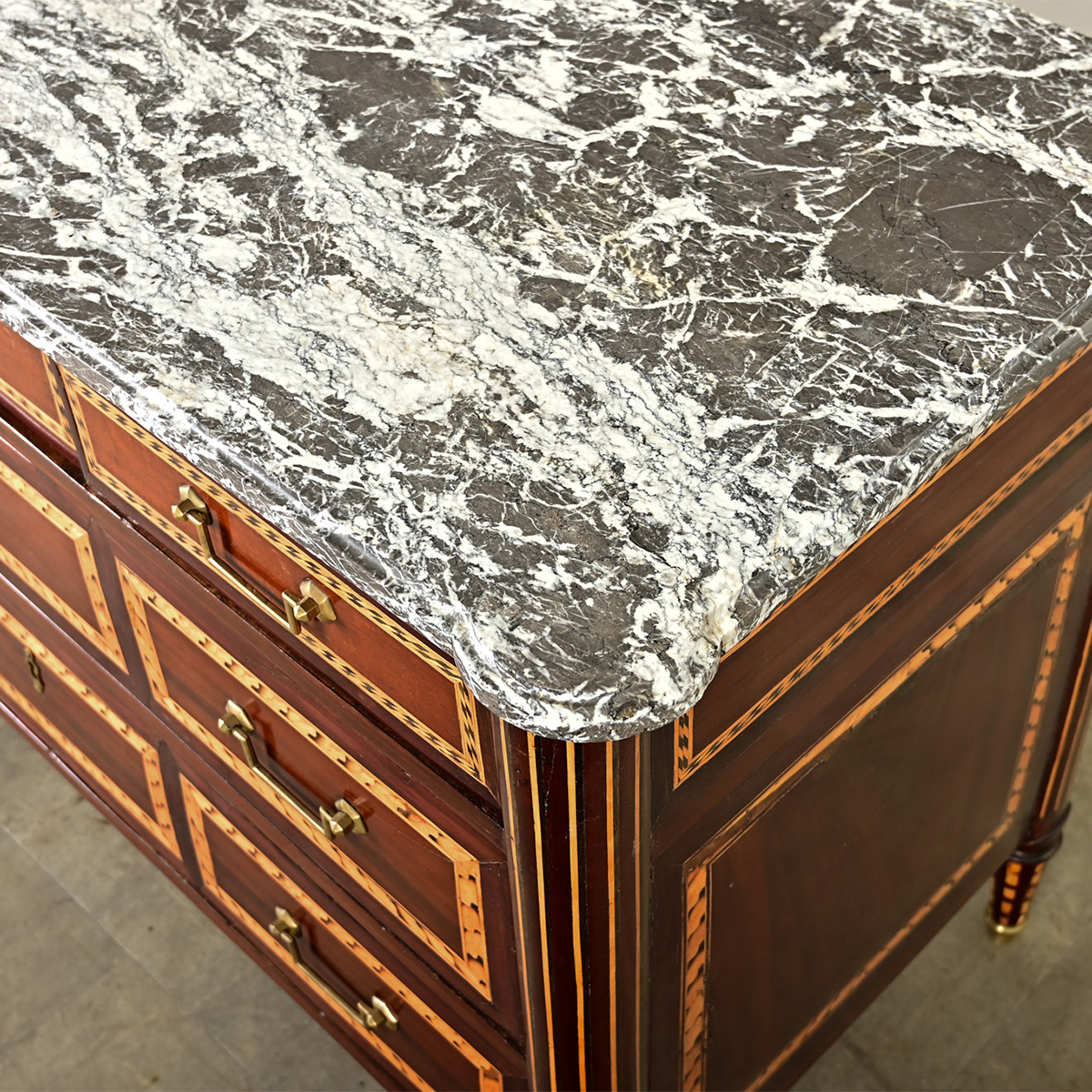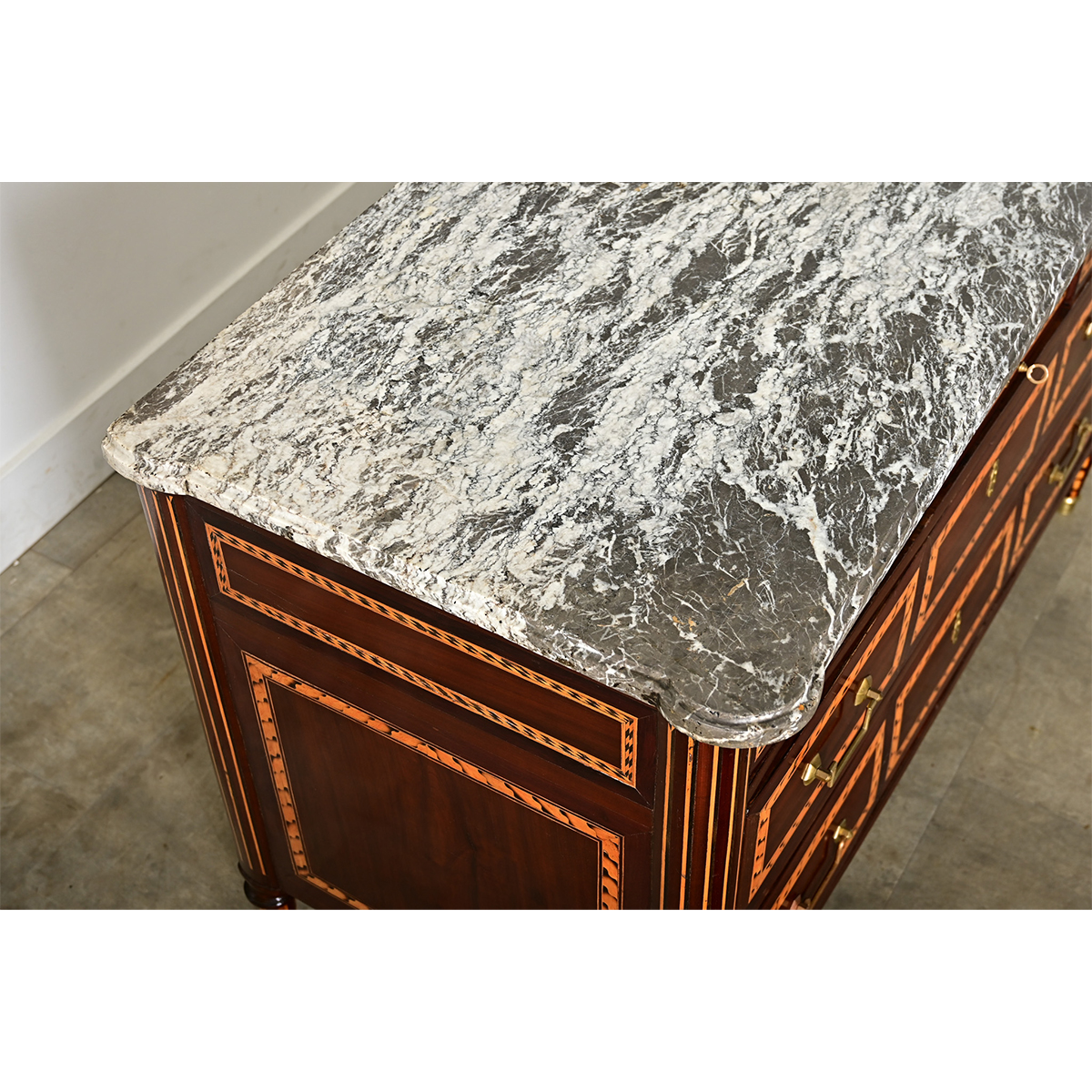 An extraordinary French mahogany commode from the 18th century, Louis XVI Period, decorated with an impressive marquetry technique that creates movement and definition over the drawer fronts and side panels. The commode retains its original slab of gray marble, the surface animated by frenetic white veining, and shaped to turreted front corners. Across the top row are three drawers of geometric marquetry designs to outline them–like two rows of twisting ribbon–in alternating blonde and dark woods. Brass bail pulls operate the left and right drawers while the middle drawer requires the key to function as a pull (lock is intact but does not turn). The two wide drawers across the center and below, follow the rhythm as above with three distinct rectangular “frames” around the drawer hardware, in graphic marquetry of dark/light woods that have been hand-decorated in wispy patterns of red pigment suggesting plumes or waves–adding depth and regal grandeur to this already fine example of the woodworker’s craft. The side panels have complementary inlaid designs, themes which are replicated down the turrets (using marquetry to imply fluted recesses) moving into the conical feet so from every perspective one can admire the visionary intentions of the maker even two centuries later. Cleaned and polished with a French paste wax, this commode is ready to be enjoyed in your interior. Be sure to view the detailed images to see the current condition as the right side panel appears to have been repaired.