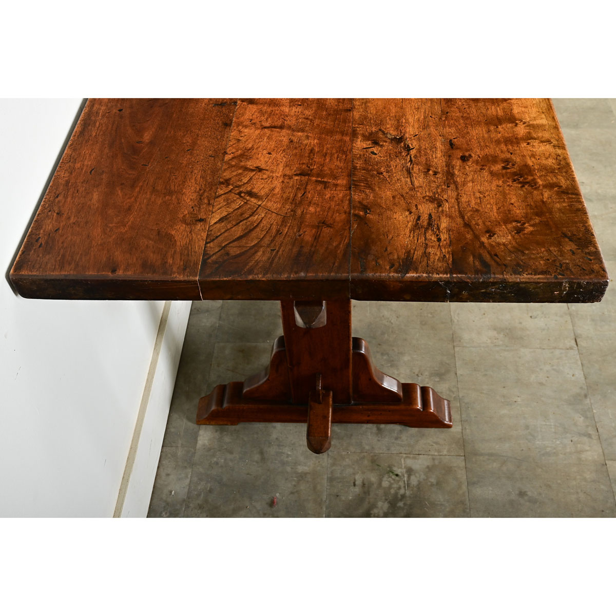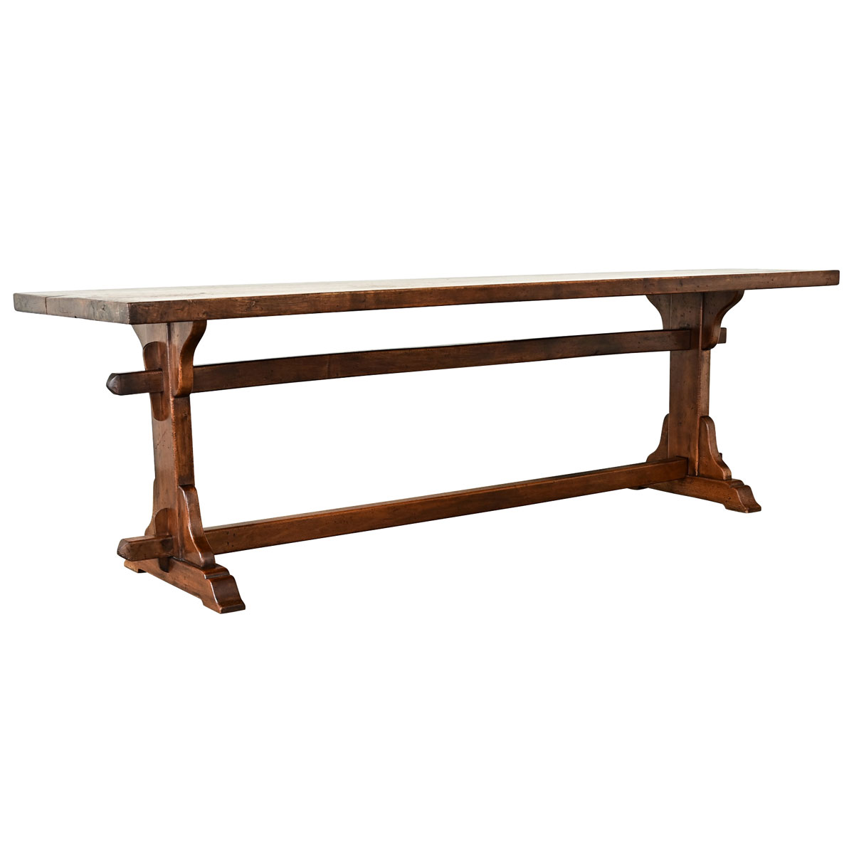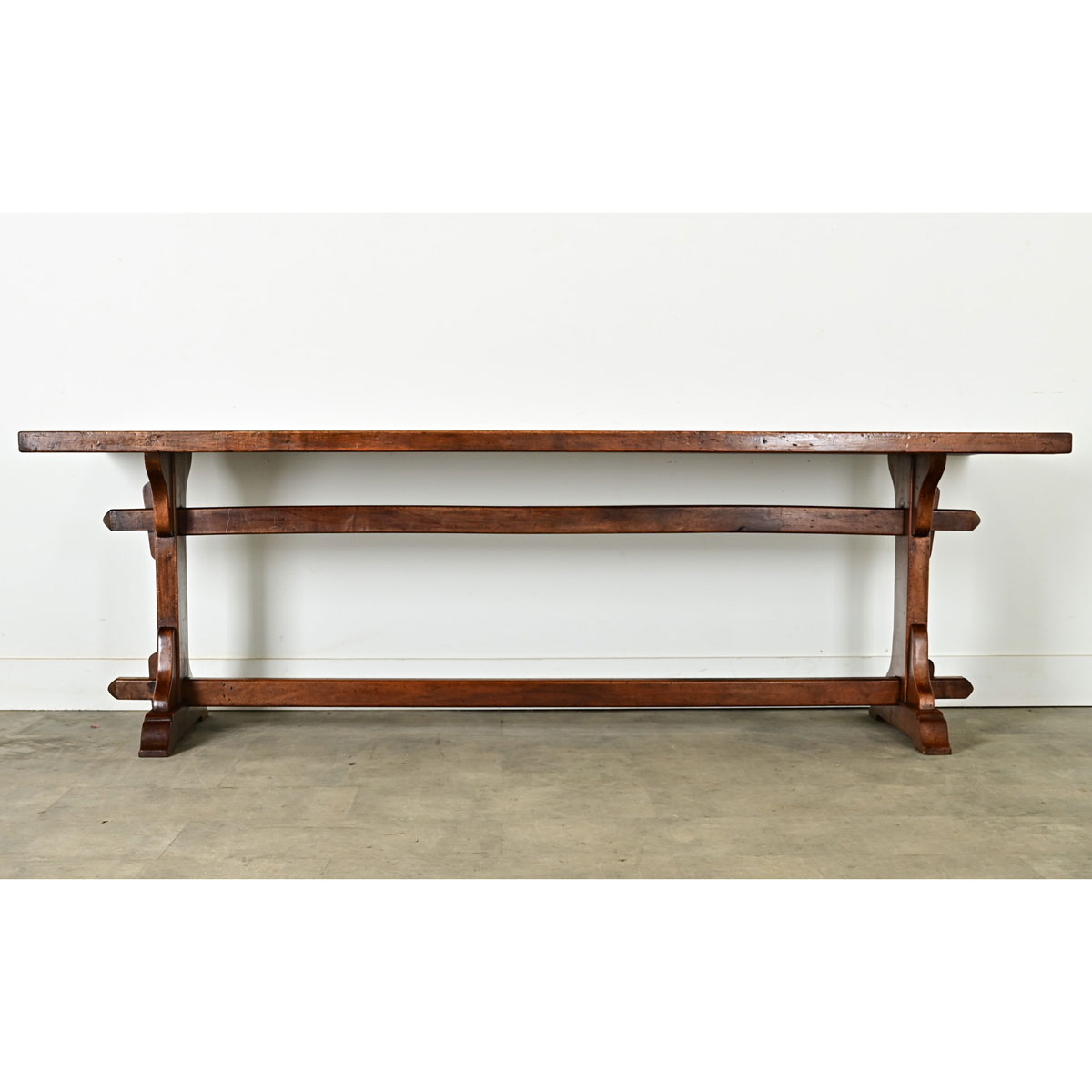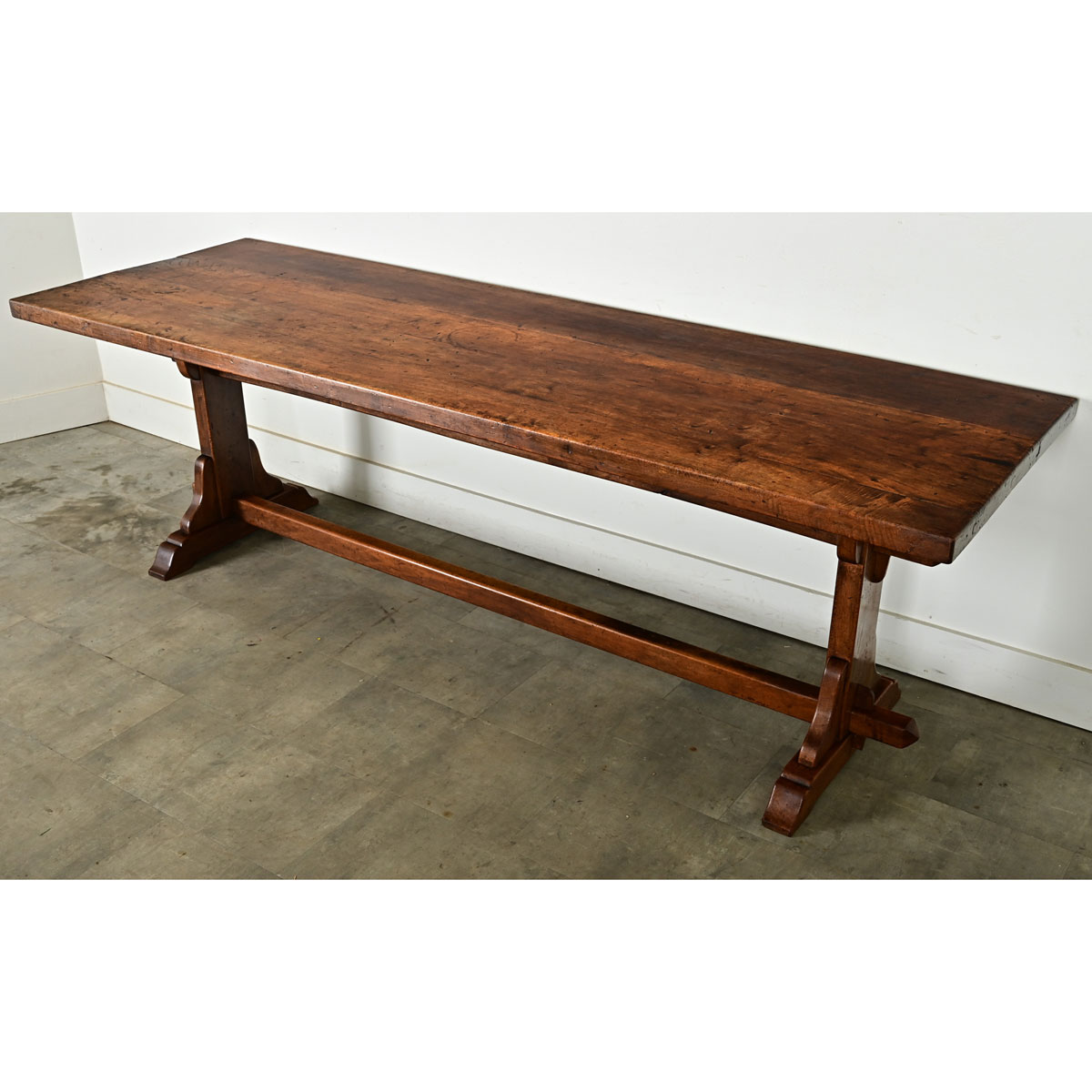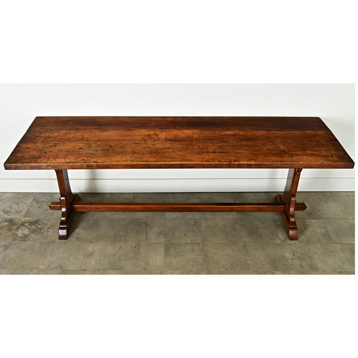 A substantial 18th century French oak trestle table milled from solid walnut and constructed to last generations. Impossibly heavy, the planks are 1 ⅞” thick to create a solid top for dining or working, with no visible joinery interrupting the smooth grain. Typical of refectory tables, the two support legs are wide and shaped on the edges to graceful undulations for an interesting profile when viewed from the side. Not one but two square-cut stretchers span the distance in between the legs and protrude from the sides as little points. Graceful “shoes” at the floor offer visual balance as well as structural support. The narrow proportions are more to European standard, for casual place settings and long conversations. Cleaned and polished with a French paste wax, this historic dining table is ready to join your interior. Please view the detailed images.