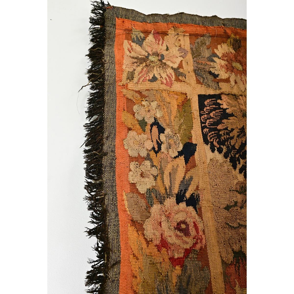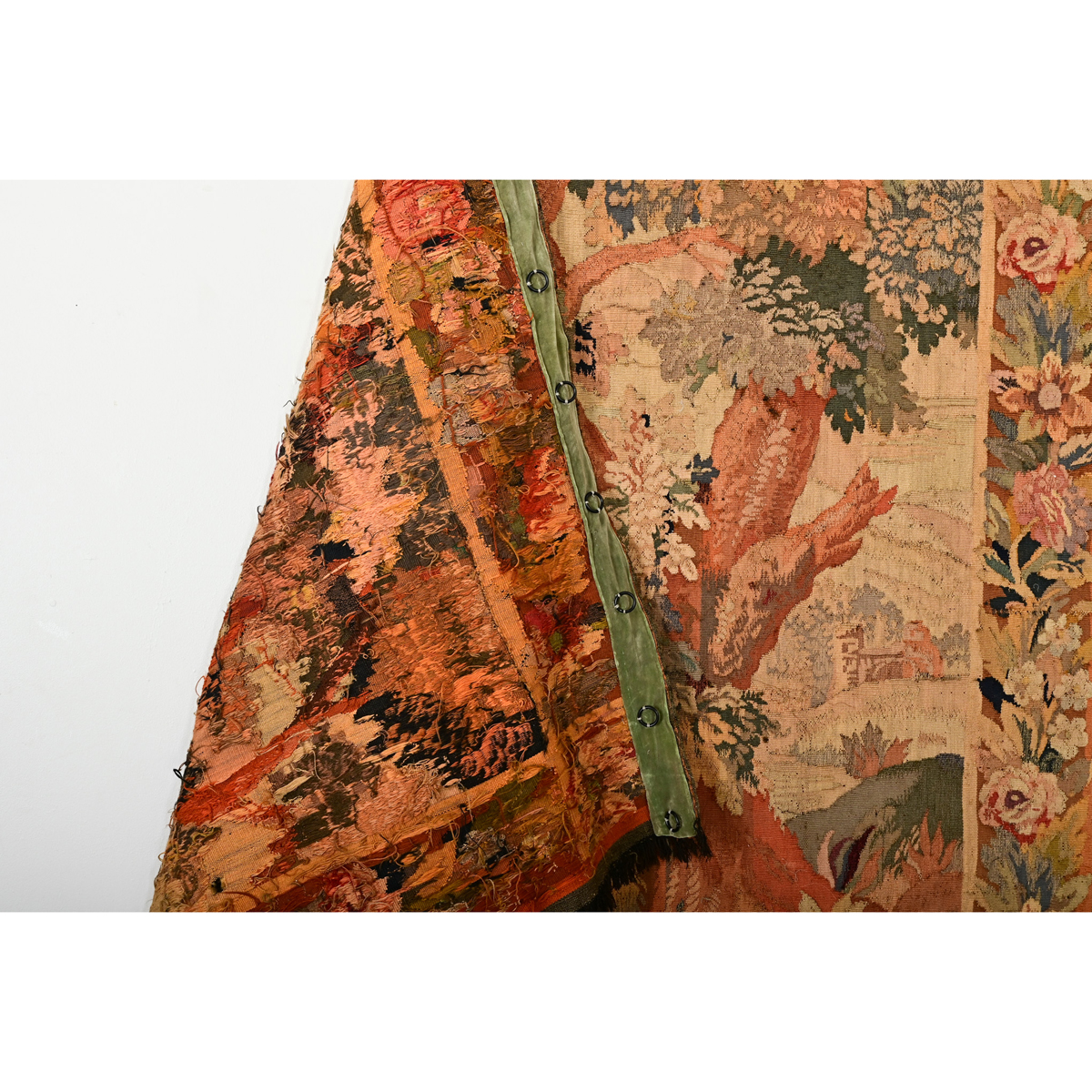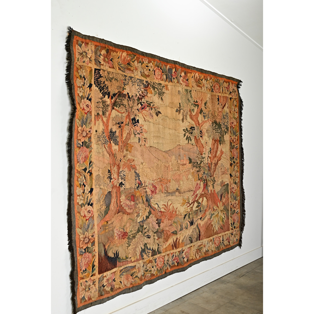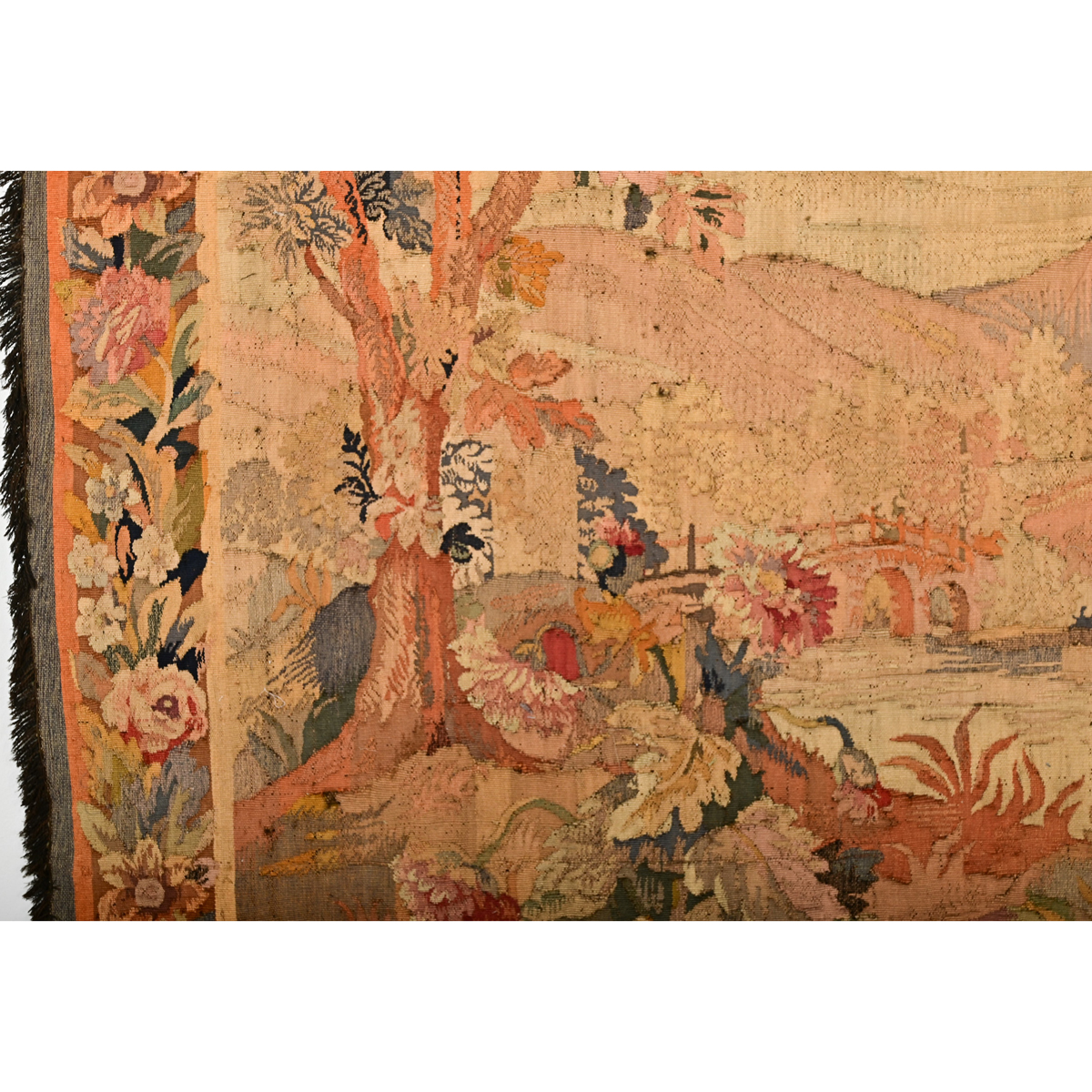 This romantic 18th Century verdure tapestry will transport you to an idyllic riparian town nestled in the hills of the French countryside. Done in autumnal colors of burnt oranges, golds, browns, reds and greens, this stunning woven textile would have an enormous impact on your room or space. A meandering river is central to the scene, with a bridge in the foreground, giving access to the small village. Two trees anchoring the foreground bear a healthy cover of foliage for a few birds, keeping a watchful eye on their forest domain. The tapestry is bordered in a dense repeat of floral and foliate details with styled flourishes in the corners, and a dark brown fringe on the left and right sides. Take some time to view the detailed images to see the current condition of the tapestry and wonder at its artistry and finer points. Reinforced at the top with a strip of velvet stitched with eye hooks for hanging.